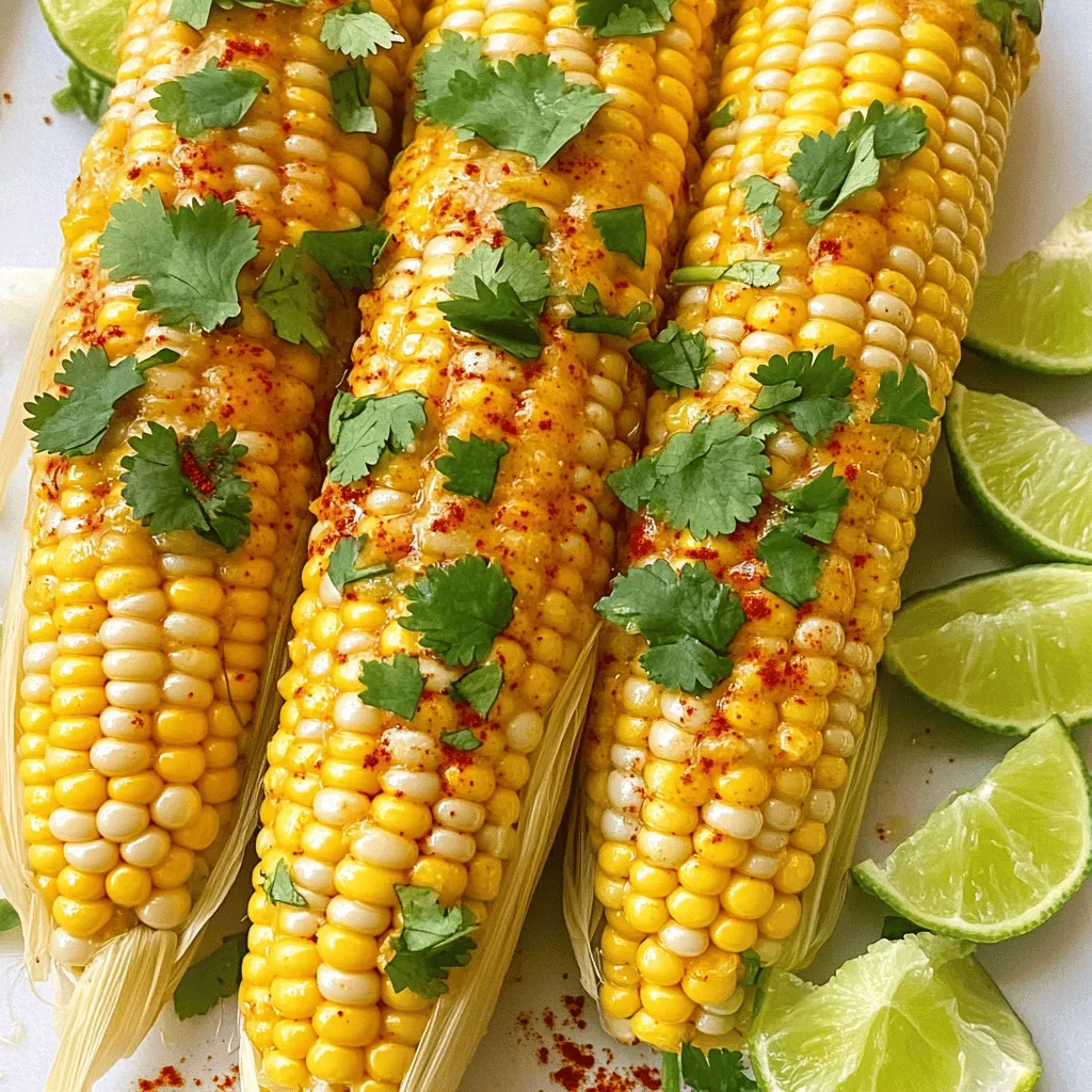 ![- Fresh corn - Mayonnaise - Sour cream - Lime juice and zest - Chili powder - Smoked paprika - Salt - Fresh cilantro - Lime wedges for serving When I make chili lime corn on the cob, I always start with fresh corn. Look for ears that feel firm and heavy. They should have green husks and plump kernels. I love the crunch and sweetness of fresh corn. Next, I gather my other ingredients. Mayonnaise gives the corn a creamy texture. Sour cream adds a nice tang. Lime juice and zest bring a bright, fresh flavor. Chili powder adds heat, while smoked paprika gives a touch of depth. A sprinkle of salt brings all the flavors together. Finally, fresh cilantro will garnish the corn. It adds a burst of color and flavor. I also set aside lime wedges for serving. They give an extra zing when squeezed over the corn. This combination makes each bite a savory delight. For the full recipe, check the section below! - First, bring a large pot of salted water to a boil. - Next, husk the corn, removing all the silk and leaves. - Cook the corn for about 5-7 minutes. - You want it tender but still crisp. - Keep an eye on it so it doesn't overcook. - In a mixing bowl, combine the mayonnaise and sour cream. - Add fresh lime juice and lime zest for bright flavor. - Then, mix in chili powder and smoked paprika. - Don't forget to add a pinch of salt. - Stir until everything is smooth and well mixed. - Once the corn cools a bit, it’s time to coat it. - Use a brush or a spoon to spread the chili-lime mixture. - Make sure to cover each ear well for great flavor. - Sprinkle more chili powder on top for extra heat. - Add chopped cilantro for a fresh touch. - Serve with lime wedges on the side for zest. Enjoy the full flavor explosion of this dish! Check the [Full Recipe] for details. When picking corn, look for bright green husks. The silk should be golden and slightly sticky. Fresh corn feels firm and heavy. For the best taste, go for organic corn. Organic corn often has richer flavors and fewer chemicals. Regular corn can be good too, but always check for freshness. To boost the flavor, think about adding spices. Garlic powder or cumin can add depth. You can also try smoked salt for a unique twist. Marinating the corn before cooking can enhance taste. Just coat it in the chili-lime mix and let it sit for 15-30 minutes. This extra time allows the flavors to soak in. You can boil or grill corn for this recipe. Boiling is quick and easy. Cook the corn for 5-7 minutes in salted water. Grilling gives a nice smoky flavor. If grilling, cook for about 10-15 minutes, turning often. Adjust the time based on your preference for tenderness. Either way, you'll end up with a delicious dish! For the complete recipe, check out the [Full Recipe]. {{image_2}} To kick it up a notch, add some heat! You can chop up fresh jalapeños or add a splash of your favorite hot sauce. This change gives the corn a fiery twist that some will love. The spice level depends on your taste, so start small and add more if you dare. You might find that jalapeños add a fresh, crunchy texture that balances the creamy sauce perfectly. If you want a plant-based version, swap the mayonnaise and sour cream. Use vegan mayo and coconut yogurt instead. These substitutes still keep the creaminess but fit a vegan diet. You can also try using mashed avocado for a rich, buttery flavor. This way, everyone can enjoy this tasty treat! Don’t be afraid to play with flavors! Try adding cheese like Cotija or feta for a salty kick. You can also mix in fresh herbs like cilantro, parsley, or even basil for a unique taste. Each variation can totally change the dish, making it fun to discover new favorites. Get creative and make this dish your own! For the full recipe, check out the [Full Recipe]. After enjoying chili lime corn on the cob, you may have some left. To keep corn fresh, wrap each ear tightly in plastic wrap. This keeps moisture in and prevents it from drying out. You can also place the corn in an airtight container. Store it in the fridge for up to three days. This method helps maintain the flavor and texture. To reheat cooked corn, you have a few options. The best way is to use a microwave. Place the corn on a microwave-safe plate. Cover it with a damp paper towel. Heat in short bursts of 30 seconds until warm. You can also reheat it on the stovetop. Boil a small pot of water. Place the corn in a steamer basket over the pot for about five minutes. This keeps the corn moist and tasty. If you want to freeze corn, start by cooking it first. After boiling, let the corn cool completely. Then, cut the kernels off the cob. Place them in freezer-safe bags. Squeeze out as much air as possible before sealing. Store the bags in the freezer for up to six months. When you’re ready to use them, thaw in the fridge overnight or microwave for a quick defrost. Enjoy the fresh taste of summer whenever you like! You can store Chili Lime Corn on the Cob for about three days in the fridge. Keep it in an airtight container to keep it fresh. The corn may lose some flavor over time, but it will still taste good. Yes, you can prepare the corn ahead of time. I suggest boiling the corn and making the chili-lime sauce. Just store them separately in the fridge. When you are ready to serve, coat the corn with the sauce. This way, the corn stays fresh and flavorful. Chili Lime Corn pairs well with many dishes. Here are some tasty suggestions: - Grilled chicken or shrimp - Tacos with fresh toppings - A light salad with avocado and tomatoes - Rice and beans for a filling meal These sides complement the bold flavors of the corn and make a great summer feast. For the full recipe, check out the details above! In this post, we covered how to make Chili Lime Corn on the Cob. We shared a full list of fresh ingredients and step-by-step instructions to prepare this tasty treat. You learned tips for selecting corn, enhancing flavors, and cooking methods. We also explored fun variations, storage tips, and 