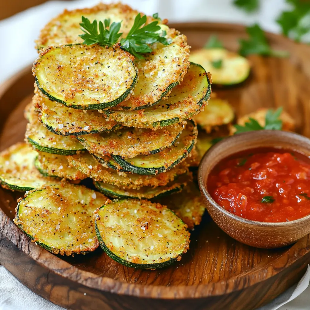 These crispy zucchini chips are tasty on their own, but you can elevate them! Serve with marinara sauce for a classic touch. You can also pair them with ranch or a yogurt dip. For a fun twist, sprinkle some fresh herbs on top before serving. Basil or parsley adds a nice flavor and color. Enjoy these chips as a snack or a side dish at your next meal!