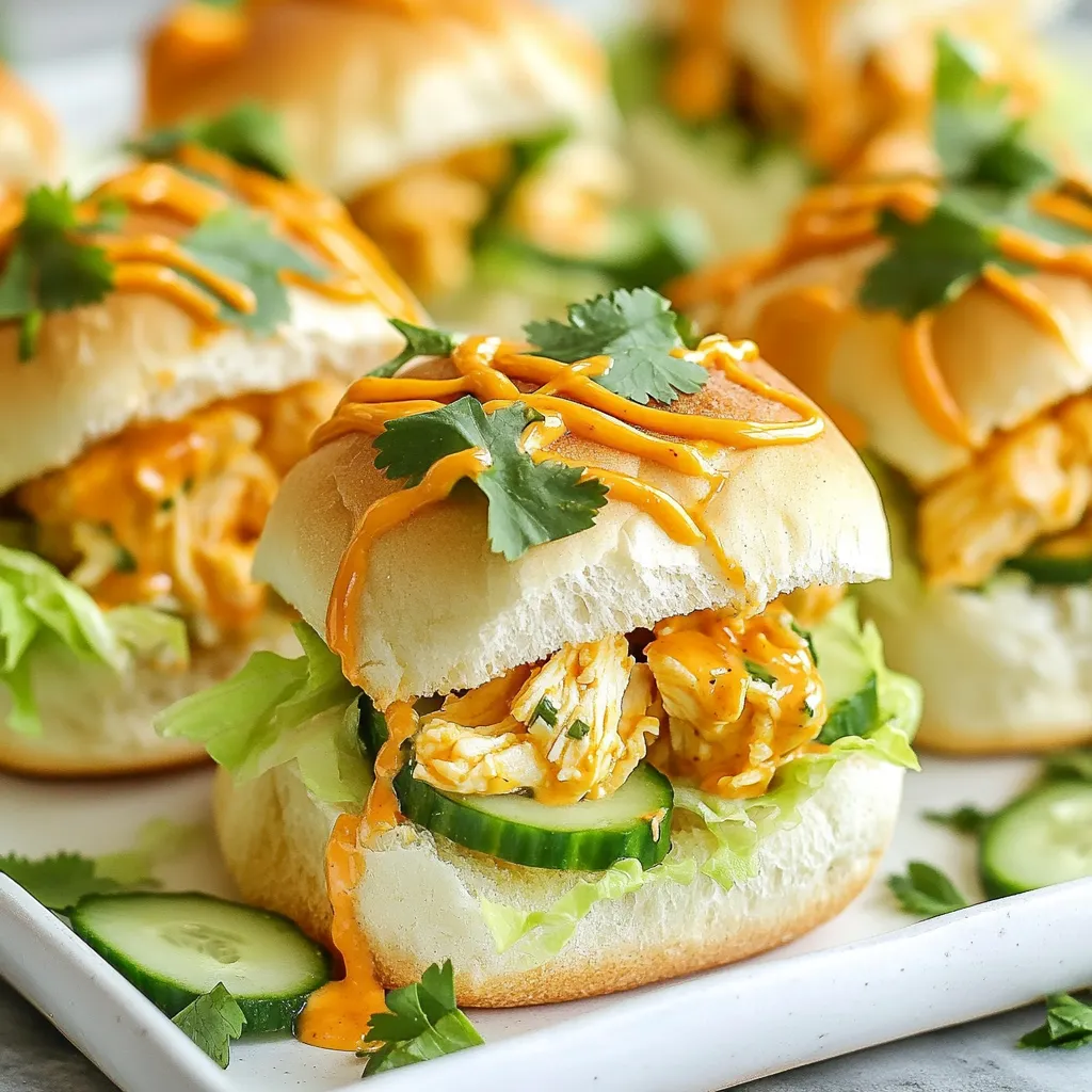 Preheat your grill or skillet over medium heat. Lightly grease the skillet with cooking oil if needed. Take the mini slider buns, about 12 in total, and lightly toast them until golden brown. Set the toasted buns aside. To assemble, spoon a generous amount of the Bang Bang chicken mixture onto the bottom half of each bun. Add a handful of shredded lettuce and some diced cucumbers for a fresh crunch. Drizzle a bit more Bang Bang sauce over the toppings. Finally, place the top half of each slider bun on. Garnish with fresh cilantro leaves for extra flavor.
