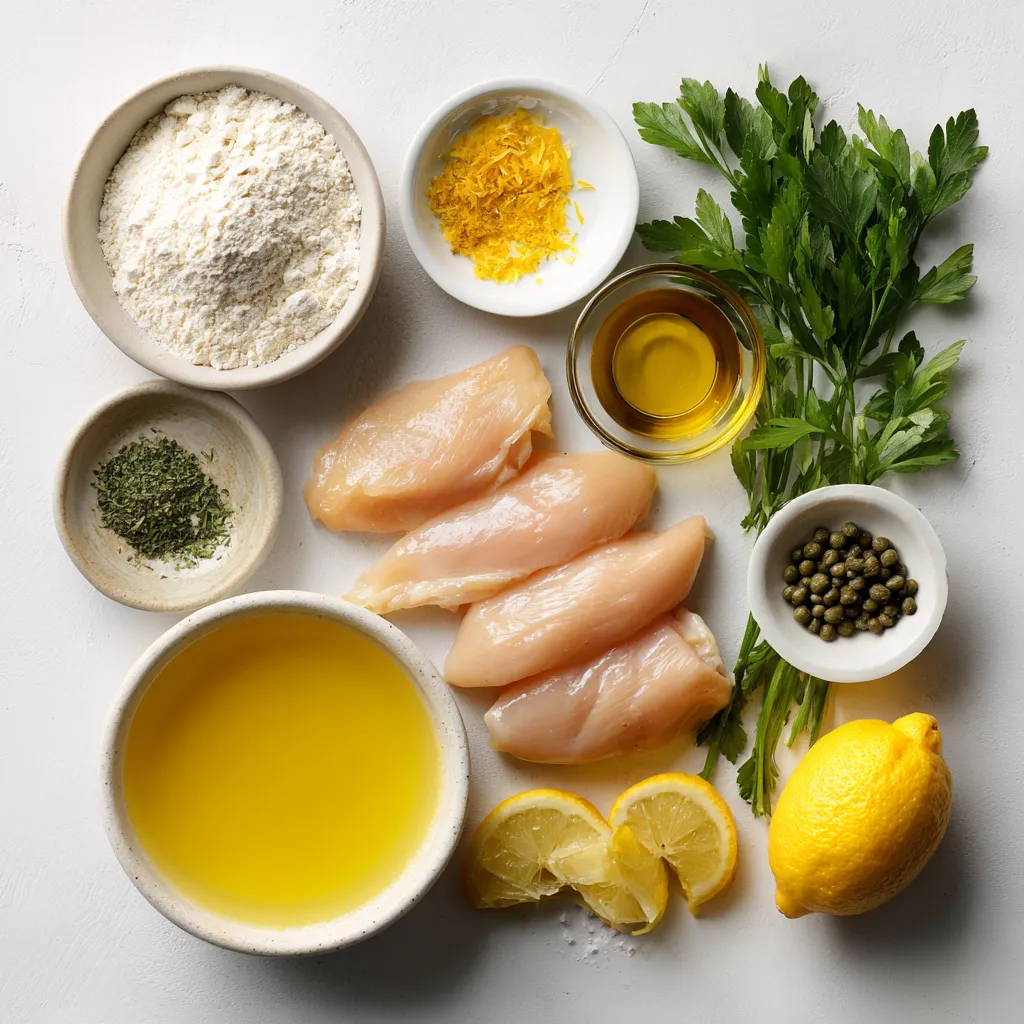 Classic Chicken Piccata uses simple, fresh ingredients. The main stars are chicken, lemon, and capers. You start by pounding the chicken breasts flat for even cooking. Then, you dredge them in flour mixed with salt and pepper. After frying in olive oil and butter, the chicken gets a nice golden crust. The sauce is made with chicken broth, lemon juice, zest, and capers. This method ensures a tasty meal that is easy to prepare.