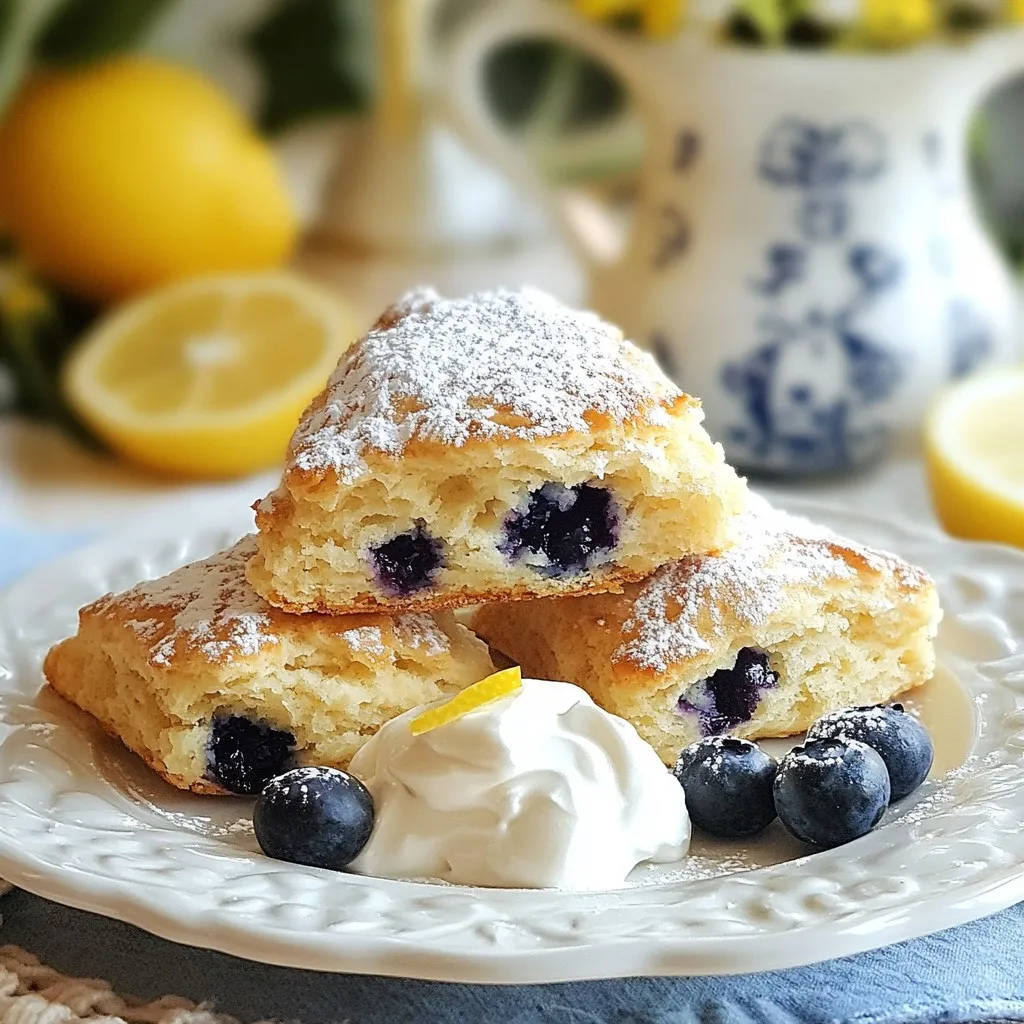 - 2 cups all-purpose flour - 1/4 cup granulated sugar - 1 tablespoon baking powder - 1/2 teaspoon salt - 1/2 cup unsalted butter, chilled and cubed - 1/2 cup heavy cream - 1 teaspoon vanilla extract - 1 large egg - 1/2 cup fresh blueberries - Zest of 1 lemon Gathering the right ingredients is key to making delicious blueberry lemon scones. Start with all-purpose flour for a soft texture. The granulated sugar adds just the right amount of sweetness. Baking powder helps the scones rise, giving them a light and fluffy feel. A touch of salt balances the flavors. For the wet ingredients, use unsalted butter. Keep it chilled and cubed for the best results. Heavy cream makes the scones rich and tender. The vanilla extract enhances the overall flavor. Don't forget the large egg; it binds everything together. Now, let’s make it pop with flavor! Fresh blueberries are a must. They burst with juice and sweetness. Grate the zest of one lemon to bring a bright, citrus kick. This combination of flavors makes every bite a delight. {{ingredient_image_1}} - Preheat oven to 400Β°F (200Β°C). - Line baking sheet with parchment paper. - Combine 2 cups all-purpose flour, 1/4 cup granulated sugar, 1 tablespoon baking powder, and 1/2 teaspoon salt in a bowl. - Whisk until mixed well. This mix gives the scones their structure. - Add 1/2 cup chilled, cubed unsalted butter to the dry mixture. - Use your fingers or a pastry cutter to work the butter into the flour. Aim for a crumbly texture. - Gently fold in 1/2 cup fresh blueberries and zest of 1 lemon. Be careful not to smash the blueberries. - In a separate bowl, mix together 1/2 cup heavy cream, 1 teaspoon vanilla extract, and 1 large egg. - Beat until the mixture is smooth and well blended. - Pour the wet mixture into the dry ingredients. Stir until just combined. - Some dry flour should remain; do not overmix. - Turn the dough onto a lightly floured surface and knead it gently a few times. Shape it into a circle, about 1-inch thick. - Cut the dough into 8 wedges. - Place wedges on the prepared baking sheet. Space them a couple of inches apart. - Bake for 15-20 minutes, until golden brown on top. - Remove from the oven and let cool slightly before serving. To make your scones light and fluffy, don’t overmix the dough. This keeps the texture tender. Use chilled butter to help create flaky layers. Cold butter melts slowly in the oven, adding steam and lift. For a tasty finish, dust your scones with powdered sugar. This adds sweetness and looks lovely. You can also serve them with clotted cream or a lemon glaze. Both options enhance the lemon flavor and make each bite special. To store leftover scones, place them in an airtight container. This keeps them fresh for a few days. If you want to enjoy them later, wrap them tightly and freeze. To reheat, warm them in the oven at 350Β°F (175Β°C) for about 10 minutes. Enjoy your scones warm for the best taste! Pro Tips Use Chilled Butter: Make sure your butter is very cold before mixing. This helps create a flaky texture in the scones. Fresh Blueberries: Use fresh blueberries for the best flavor and to prevent excess moisture in the dough. Do Not Overmix: Mix the dough just until combined. Overmixing can lead to tough scones. Brush with Cream: For a golden top, brush the scones with a little extra cream before baking. {{image_2}} You can make your blueberry lemon scones even better with fun add-ins. Try using different berries, like raspberries or blackberries. They add a nice twist to the flavor. You can also mix in some nuts, like walnuts or pecans. They give the scones a great crunch and extra taste. To change things up, think about adding herbs. A little thyme or lavender can bring a fresh taste. You can also try different citrus zest. Lime or orange zest can give your scones a unique flavor. Don't be afraid to experiment! A good glaze can take your scones to the next level. A lemon glaze is simple and delicious. Just mix powdered sugar with fresh lemon juice for a sweet-tart topping. You could also drizzle maple syrup on top. It adds a warm, rich flavor that pairs well with lemon and blueberries. Yes, you can make these scones ahead of time. Here are some tips: - Prepare the dough: You can mix the dry and wet ingredients and shape the dough into wedges up to 24 hours before baking. - Refrigerate: Wrap the shaped scones in plastic wrap and store them in the fridge. - Bake when ready: Just bake them straight from the fridge. This keeps them fresh and fluffy. Dense scones can happen due to a few reasons. Here are some common causes and solutions: - Overmixing the dough: Mixing too much can make the scones tough. Stir until just combined. - Old baking powder: Make sure your baking powder is fresh. Test it with water; it should bubble. - Too much liquid: If you added extra liquid, it can weigh the dough down. Stick to the recipe for best results. Yes, you can freeze blueberry lemon scones. Here’s how: - Freeze before baking: After shaping the scones, place them on a baking sheet and freeze until solid. - Store in a bag: Transfer the frozen scones to a freezer-safe bag. They can last up to three months. - Baking from frozen: When ready to bake, no need to thaw. Just add a few extra minutes to the baking time. Enjoy fresh scones anytime! Prep Time - 15 minutes Cook Time - 15-20 minutes Total Time - 35 minutes Servings - Makes 8 scones When you make blueberry lemon scones, you will want to get organized first. Start with prep time. It takes just 15 minutes to gather and mix your ingredients. This short time gets you ready for baking. You will quickly blend dry items with wet ones. The cook time is next. You will bake these scones for 15 to 20 minutes. You want them golden brown on top. The smell of blueberries and lemon will fill your kitchen. In total, the whole process takes about 35 minutes. That means you can enjoy warm scones in no time! This recipe makes 8 scones, perfect for sharing or enjoying all weeke