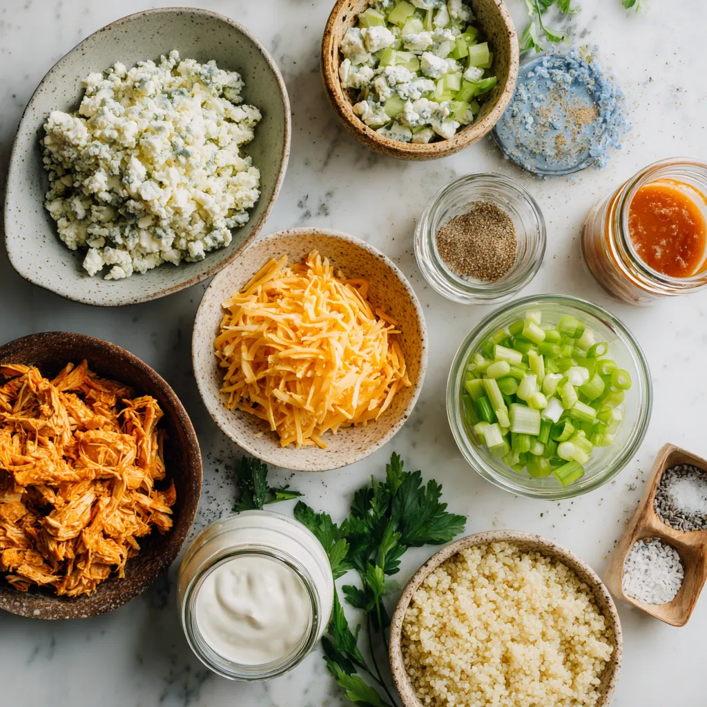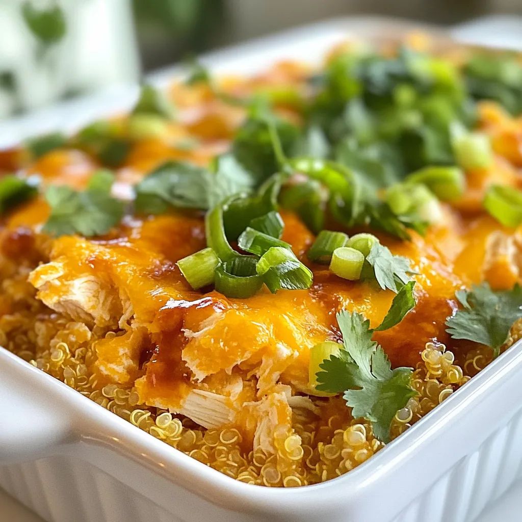 - 2 cups cooked shredded chicken - 1 cup buffalo sauce - 1 cup cooked quinoa - 1 cup ranch dressing - 1 cup shredded cheddar cheese I love using cooked shredded chicken. It makes the dish hearty and easy to prepare. You can use leftover chicken or buy a rotisserie chicken for speed. The buffalo sauce adds a spicy kick. Choose a mild or medium sauce based on your taste. Quinoa is a great base. It’s packed with protein and gives the casserole a nice texture. Ranch dressing adds creaminess and balances the heat from the sauce. Finally, the shredded cheddar cheese melts on top, creating a delicious crust. - 1/2 cup crumbled blue cheese - Fresh parsley for garnish - Chopped green onions You can add blue cheese for extra flavor. It gives a tangy kick that pairs well with buffalo sauce. Fresh parsley adds a pop of color and freshness. Chopped green onions can also add a nice crunch. These ingredients aren’t required, but they can make your casserole special. - Salt and pepper - Garlic powder - Onion powder Simple seasonings can elevate your dish. Salt and pepper are must-haves. They enhance the flavors of the chicken and sauces. Garlic powder gives a nice depth, while onion powder adds sweetness. Feel free to adjust these to match your taste! {{ingredient_image_1}} First, preheat your oven to 350°F (175°C). This step warms up the oven for even cooking. While it heats, grab a 9x13-inch casserole dish and grease it to prevent sticking. Next, take a large mixing bowl. Add the following main ingredients: - 2 cups cooked chicken, shredded - 1 cup buffalo sauce - 1 cup cooked quinoa - 1 cup ranch dressing - 1 cup chopped celery - 1 teaspoon garlic powder - 1 teaspoon onion powder - Salt and pepper to taste Stir these ingredients well until they blend nicely. This mixture is the heart of your casserole. Now, transfer your chicken mixture into the greased casserole dish. Spread it out evenly so each bite has great flavor. On top of your mixture, sprinkle: - 1 cup shredded cheddar cheese If you love blue cheese, now is the time to add: - 1/2 cup crumbled blue cheese (optional) Bake this in your preheated oven for 25 to 30 minutes. Look for the cheese to bubble and turn a light golden color. This shows it’s ready. Once baked, remove the casserole from the oven. Let it cool for a few minutes. This cooling time helps with serving. Before serving, garnish with: - Chopped green onions - Fresh parsley (optional) This adds a fresh look and taste to your dish. Enjoy your delicious buffalo chicken casserole! To ensure even cooking of your chicken and quinoa, you should shred the chicken into small, bite-sized pieces. This size helps it cook more evenly. Also, make sure your quinoa is fully cooked before mixing it in. This will keep the casserole from being too dry. Choosing the right buffalo sauce is key. I recommend starting with a mild sauce if you are new to it. You can always add more heat later! If you like a bit of tang, look for sauces that have vinegar in them. This adds a nice punch to the dish. Pair your casserole with crunchy veggies or a fresh green salad. Celery sticks and carrot sticks are great options. They add a nice crunch and balance the heat of the dish. You can also top the casserole with fresh parsley or green onions for color and flavor. For drinks, I suggest a cold beer or a light white wine. These drinks match well with the spicy flavor of the casserole. If you prefer non-alcoholic drinks, try a lemon-lime soda or iced tea. Both options work well to cool down the heat. You can make this casserole ahead of time. To freeze, let it cool completely after baking. Then, wrap it tightly in plastic wrap and foil. This keeps it fresh for up to three months. When you’re ready to eat, thaw overnight in the fridge. To reheat, place it in a preheated oven at 350°F (175°C). Bake until it is heated through and the cheese is bubbly, about 20 to 30 minutes. You can also microwave individual portions for a quick meal! Pro Tips Tip Title 1: Use rotisserie chicken for a quick and easy option that adds great flavor to your casserole. Tip Title 2: Let the casserole cool for a few minutes before serving to allow it to set, making it easier to cut and serve. Tip Title 3: For a spicier kick, add extra buffalo sauce or incorporate jalapeños into the mixture. Tip Title 4: Pair with a side salad for a complete meal that balances the richness of the casserole. {{image_2}} You can make Buffalo chicken casserole lighter. Try swapping rice with quinoa or cauliflower rice. Quinoa adds protein and fiber. Cauliflower rice lowers carbs. It still tastes great! For ranch dressing, look for low-fat options. Many brands offer tasty, lower-calorie choices. You won't lose flavor, just some fat. It’s a smart swap for health. You can adjust the heat level. Choose spicy or mild buffalo sauce based on your taste. This changes the whole dish! If you like a kick, go for the spicy. If you prefer milder flavors, stick with mild sauce. Adding veggies can change the dish too. Mix in chopped bell peppers or carrots. They add color and crunch. Plus, they boost nutrition. Don’t be afraid to experiment with different veggies! You can make this dish vegetarian-friendly. Swap the chicken with beans or lentils. This keeps it hearty and filling. You can also use plant-based cheese for creaminess. Meal prep is easy with these swaps. Make it ahead for busy days. Just follow the same steps, and you have a tasty meal! To store leftovers, let the casserole cool first. Then, transfer it to an airtight container. Make sure it is sealed well. This keeps your dish fresh and tasty. In the fridge, your Buffalo Chicken Casserole lasts about 3 to 4 days. If you want to enjoy it later, freezing is a great option. To freeze the casserole, first, let it cool completely. Cut it into portions for easy storage. Wrap each piece tightly in plastic wrap. Then, place the wrapped pieces in a freezer-safe bag. Make sure to label the bag with the date. Fo