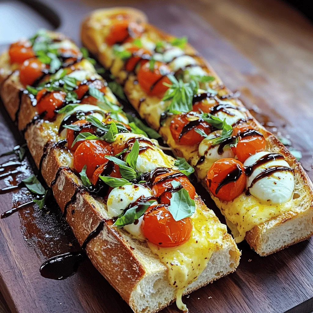 To get that perfect crisp, preheat your oven to 375°F (190°C) before baking. Slice the baguette in half lengthwise. Place the bread cut side up on a baking sheet. Bake for 10-12 minutes. You want the edges golden brown. After that, add the mozzarella and cherry tomatoes. Bake again for 5-7 minutes until the cheese melts and bubbles.