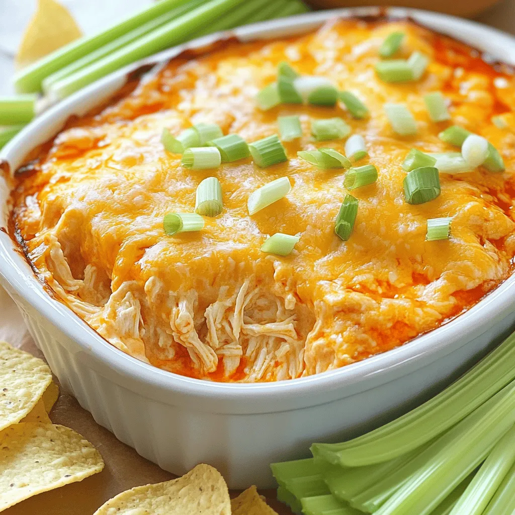 - 2 cups shredded cooked chicken - 1 package (8 oz) cream cheese, softened - 1 cup buffalo sauce (preferably mild or medium) - 1 cup shredded cheddar cheese - 1 cup shredded mozzarella cheese - 1/2 cup sour cream The main ingredients create the perfect base. Shredded cooked chicken adds protein and substance. Cream cheese makes the dip creamy and rich. Buffalo sauce gives it that spicy kick. Cheddar cheese and mozzarella cheese add flavor and melty goodness. Sour cream balances the heat with a smooth texture. - 1/4 cup green onions, chopped (for garnish) - Tortilla chips or celery sticks for serving Garnishing with green onions adds color and fresh flavor. You can serve this dip with tortilla chips or crunchy celery sticks. Both options make it fun to eat and add texture. - Alternative cheeses: You can swap cheddar or mozzarella for other cheeses like pepper jack or gouda. - Low-fat versions: Use low-fat cream cheese and sour cream to cut calories. - Hot sauce variations: Feel free to use different hot sauces for more heat or flavor. These substitutions can help tailor the dip to your taste. Whether you want a lighter dip or a spicier option, you have choices. - Preheating the oven: First, set your oven to 350°F (175°C). This helps the dip cook evenly. - Preparing the ingredients: Gather all your ingredients. You need shredded chicken, cream cheese, buffalo sauce, cheddar cheese, mozzarella cheese, and sour cream. Chop some green onions for garnish. - Combining cream cheese and sour cream: In a large bowl, mix the softened cream cheese and sour cream. Use a spatula to blend them until smooth and creamy. - Incorporating buffalo sauce: Pour in the buffalo sauce. Stir it well into the cream cheese mixture. You want all the flavors to mix perfectly. - Adding chicken and cheeses: Add the shredded chicken, cheddar cheese, and mozzarella cheese to the bowl. Stir until all the ingredients blend well. - Transferring to a baking dish: Take a medium-sized baking dish and spoon the mixture into it. Spread it evenly across the dish. - Baking time and temperature: Place the dish in your preheated oven. Bake for 20-25 minutes. Look for it to be hot, bubbly, and slightly golden on top. - Tips for achieving a golden top: For a nice golden finish, keep an eye on the dip towards the end of baking. If needed, broil for a minute or two. Just watch closely to avoid burning. To make your Cheesy Buffalo Chicken Dip shine, use high-quality ingredients. Freshly cooked chicken adds great taste. For buffalo sauce, I recommend brands like Frank’s RedHot or Crystal. They offer a nice balance of spice and flavor. You want a sauce that complements the creaminess of the cheese. A watery dip can ruin your party. To avoid this, drain any excess liquid from the chicken. Mix your cream cheese and sour cream well. A smooth base helps keep the dip thick. Stir all ingredients together until they are fully blended. This makes for a creamy, delicious dip. When serving, tortilla chips are a classic choice. They add crunch and contrast to the creamy dip. Celery sticks also work well for a fresh touch. For presentation, sprinkle chopped green onions on top. They add color and a hint of flavor. Consider adding a bowl of fresh veggie sticks on the side. It makes your spread look inviting and fun! {{image_2}} To amp up the heat, you can add extra spices. Try cayenne pepper or red pepper flakes. They give a nice kick. You can also use a spicy buffalo sauce. This will make your dip extra fiery. If you like bold flavors, this is the way to go. Just remember to adjust the other ingredients to balance the heat. Incorporating vegetables can add flavor and nutrition. Chopped bell peppers or spinach work well. You can even mix in some shredded carrots for crunch. This makes the dip healthier and adds colors. For a lighter version, swap sour cream with Greek yogurt. You get the same creaminess with less fat. You can serve this dip in different ways. A slow cooker method keeps the dip warm. Just mix and heat on low for a few hours. This is great for parties. Another fun idea is to stuff the dip into baked potatoes or peppers. This gives a unique twist and is super filling. To keep your Cheesy Buffalo Chicken Dip fresh, store it in an airtight container. This helps prevent any odors from your fridge seeping into the dip. It will last for up to four days in the fridge. If you plan to eat it later, don’t forget to let it cool first before sealing it up. You can reheat the dip in either the microwave or the oven. For the microwave, place the dip in a microwave-safe dish. Heat for about one to two minutes, stirring halfway through to avoid hot spots. If you prefer the oven, preheat it to 350°F (175°C) and heat the dip for about 15 minutes. This method helps maintain a nice texture and flavor. If you want to save some for later, freezing is a great option. First, let the dip cool completely. Then, place it in a freezer-safe container, leaving some space at the top for expansion. It can be frozen for up to three months. To thaw, move it to the fridge overnight. When ready to eat, reheat it in the oven or microwave until hot. Cheesy Buffalo Chicken Dip lasts about 3 to 4 days in the fridge. Store it in an airtight container to keep it fresh. Make sure to let it cool before you put it away. Yes, you can make this dip ahead of time! Prepare the dip and store it in the fridge before baking. When you're ready to serve, just pop it in the oven. Bake it for 20 to 25 minutes until it's hot and bubbly. You can serve Cheesy Buffalo Chicken Dip with several tasty options. Here are some ideas: - Tortilla chips - Celery sticks - Carrot sticks - Pita bread - Crackers These choices add crunch and balance to the creamy dip. Absolutely! Using rotisserie chicken saves time and adds great flavor. Just shred the chicken and mix it in with the other ingredients. It’s an easy shortcut, and it still tastes amazing! Yes, you can make this dip healthier with a few s