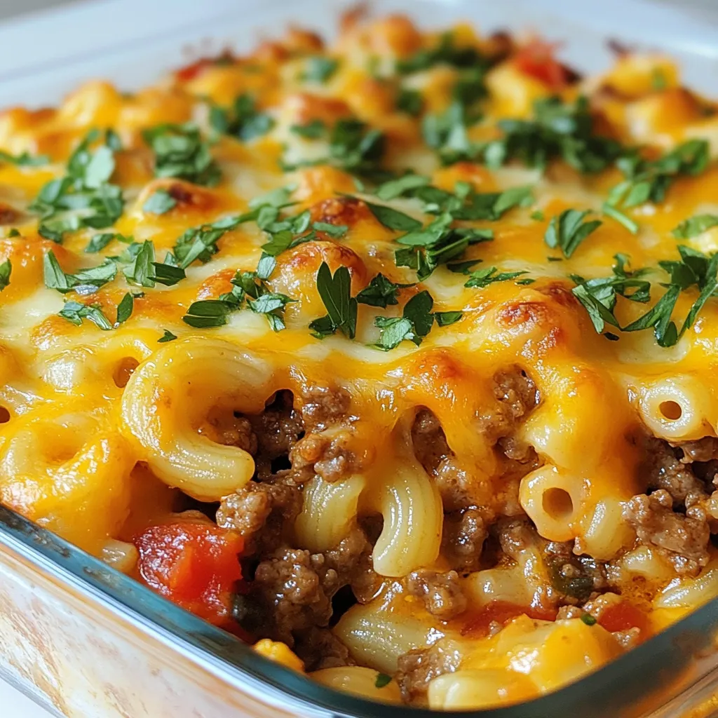 To create a delicious Cheesy Hamburger Casserole, gather the following ingredients: - 1 lb ground beef - 1 small onion, diced - 2 cloves garlic, minced - 1 cup uncooked elbow macaroni - 3 cups beef broth - 1 can (15 oz) diced tomatoes, undrained - 1 cup shredded cheddar cheese - 1 cup shredded mozzarella cheese - 1 tablespoon Worcestershire sauce - 1 teaspoon Italian seasoning - Salt and pepper to taste - 1/4 cup fresh parsley, chopped (for garnish) Each of these ingredients plays a vital role in building the flavors of your casserole. The ground beef provides protein and a hearty base. Onions and garlic add depth and aroma. Elbow macaroni brings texture, while beef broth and diced tomatoes contribute moisture and richness. The combination of cheddar and mozzarella cheese creates a gooey, satisfying topping that melts beautifully. Worcestershire sauce and Italian seasoning enhance the dish with savory and herbal notes. Don’t forget the salt and pepper; they boost all the flavors. Finally, fresh parsley adds a pop of color and freshness when you serve the casserole. This comforting dish is perfect for family dinners or gatherings with friends. {{ingredient_image_1}} 1. Preheat your oven to 350°F (175°C). This ensures even cooking. 2. In a large skillet, add 1 lb ground beef, 1 small onion (diced), and 2 cloves garlic (minced). Cook until the beef is brown, about 5-7 minutes. If there's excess fat, drain it. 3. Stir in 1 cup uncooked elbow macaroni, 3 cups beef broth, 1 can (15 oz) diced tomatoes (undrained), 1 tablespoon Worcestershire sauce, 1 teaspoon Italian seasoning, salt, and pepper. Bring this mix to a boil. 1. Once boiling, reduce to low heat. Cover and let it simmer for 10 minutes. Stir occasionally to stop sticking. 2. Remove the lid and add half of the shredded cheddar and mozzarella cheeses. Cook for another 5 minutes until the macaroni is tender and cheese melts. 3. Transfer the mix to a greased 9x13 inch baking dish. Top with the rest of the cheeses. 4. Bake in the preheated oven for 15-20 minutes. Look for bubbly and golden cheese. Enjoy the fun of creating this cheesy delight! To get the best flavor when browning beef, use medium heat. This way, the meat cooks evenly and gets a nice color. Break up the beef into smaller pieces. This helps it brown better and cook faster. If you drain the fat after browning, your dish will not be greasy. For cooking pasta in one pot, use enough liquid. In this case, beef broth is perfect. It adds flavor to the macaroni. Stir the pasta often while it cooks. This keeps it from sticking together. Once the pasta is tender, it will soak up the tasty juices. While cheddar and mozzarella are great, you can try other cheeses. Gouda adds a smoky flavor. Monterey Jack brings a creamy texture. You can mix and match to find your favorite blend. To make the dish extra creamy, add some cream cheese or sour cream. Just stir it in with the other cheeses. This makes the casserole even richer and more satisfying. Don't be afraid to experiment with cheese. Each choice can change the whole flavor! Pro Tips Use Lean Ground Beef: Opt for lean ground beef to reduce excess fat and make the casserole less greasy. Customize the Cheese: Feel free to mix and match your favorite cheeses for a unique flavor profile. Add Veggies: Incorporate additional vegetables like bell peppers or spinach for added nutrition and flavor. Make Ahead: This casserole can be prepared ahead of time and stored in the refrigerator for a convenient meal later. {{image_2}} You can make Cheesy Hamburger Casserole healthier by changing a few ingredients. Try using ground turkey or chicken instead of beef. These meats have less fat and fewer calories. They still taste great and fit well in this dish. Another simple swap is to use whole grain macaroni. Whole grains have more fiber and nutrients. This change can add more health benefits without changing the flavor much. To boost the flavor, add some colorful vegetables. Bell peppers and spinach are great choices. They add vitamins and make the dish look bright. You can chop them finely and mix them in while cooking the beef. If you like a kick, try adding jalapeños or spicy sausage. These ingredients can make your casserole more exciting. Spicy sausage adds depth and a savory taste. Just remember to adjust the heat to match your taste. Store leftover Cheesy Hamburger Casserole in an airtight container. Allow it to cool before sealing. This helps keep it fresh. Place the container in the fridge. It will last for about 3 to 4 days. If you want to keep it longer, freezing is a great option. To freeze, cut the casserole into portions. Wrap each piece in plastic wrap. Then, place them in a freezer-safe bag. Make sure to remove as much air as possible. This way, it can stay good for up to 3 months. Label the bag with the date, so you know when you made it. When you reheat your casserole, aim for the best taste and texture. For stovetop reheating, use a pan over low heat. Stir often to keep it from sticking. This method keeps the cheese creamy. If you use a microwave, cover the dish with a microwave-safe lid or wrap. Heat in short bursts of 1 to 2 minutes, stirring in between. This prevents hot spots. For the oven, preheat it to 350°F (175°C). Place the casserole in an oven-safe dish. Add a splash of beef broth to keep it moist. Cover it with foil to trap steam, and heat for about 20 minutes. This method gives you a nice, bubbly texture. Yes, you can prepare this dish ahead of time. Cook the casserole until you add the cheese. After that, cool it and cover it. You can store it in the fridge for up to two days. When you are ready to eat, just add the cheese and bake as directed. If you want a different meat, try ground turkey or chicken. You can also use pork or lamb for a unique taste. For a plant-based option, consider using lentils or crumbled tempeh. These choices add great flavor and texture. To make this casserole vegetarian, swap the ground be