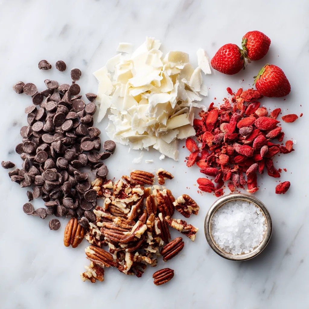 - While the dark chocolate is still wet, sprinkle the freeze-dried strawberries and chopped pecans evenly over the top. Gently press them down into the chocolate to ensure they adhere.