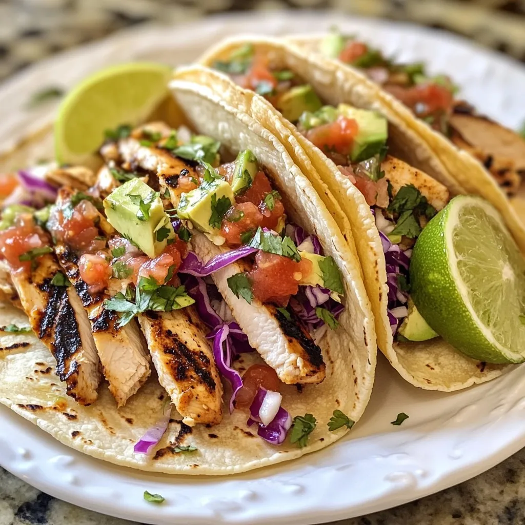 - Assemble the tacos: place a few strips of chicken on each tortilla, top with shredded cabbage or lettuce, avocado slices, and salsa or pico de gallo.