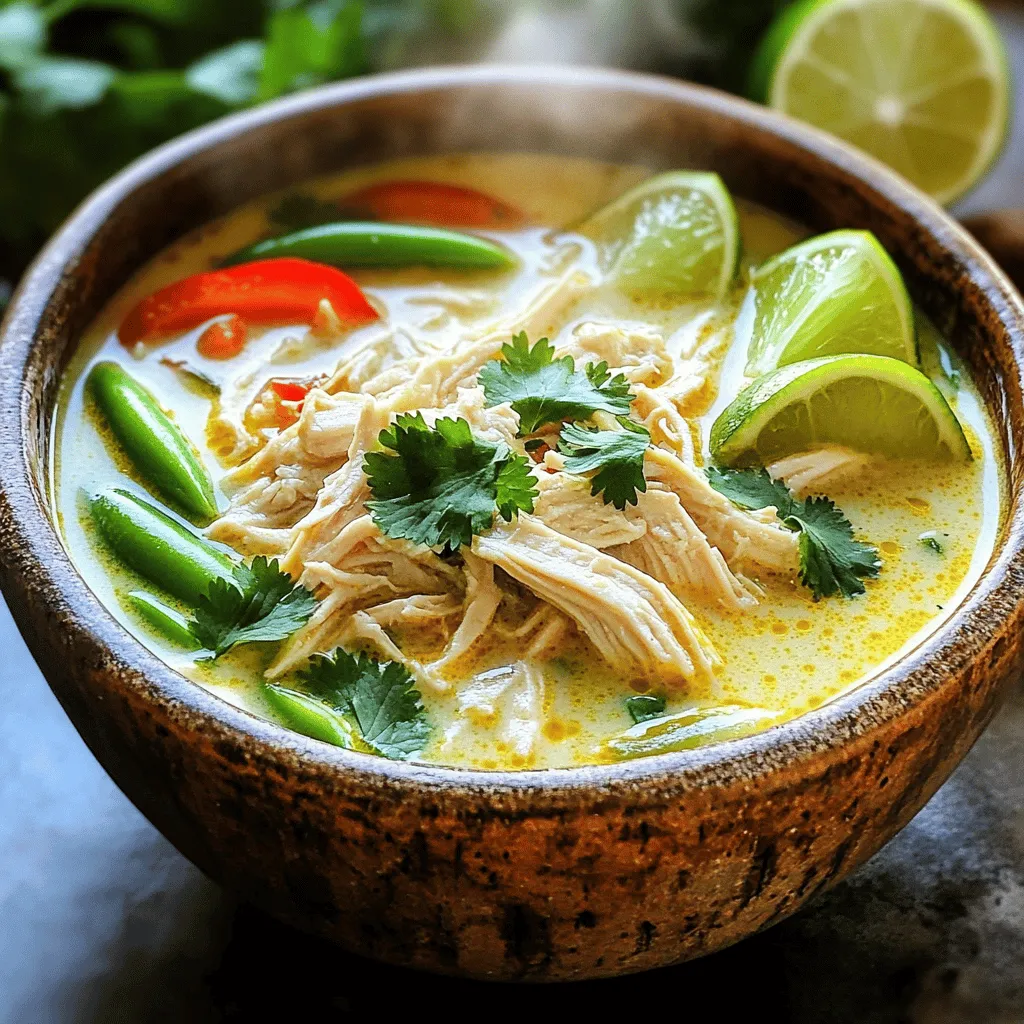 Serve the soup hot. Garnish with fresh cilantro for a burst of color and flavor. Add lime wedges on the side for an extra zing. This soup pairs well with rice or crusty bread. For a fun twist, try adding some avocado slices on top. Enjoy your Coconut Lime Chicken Soup!