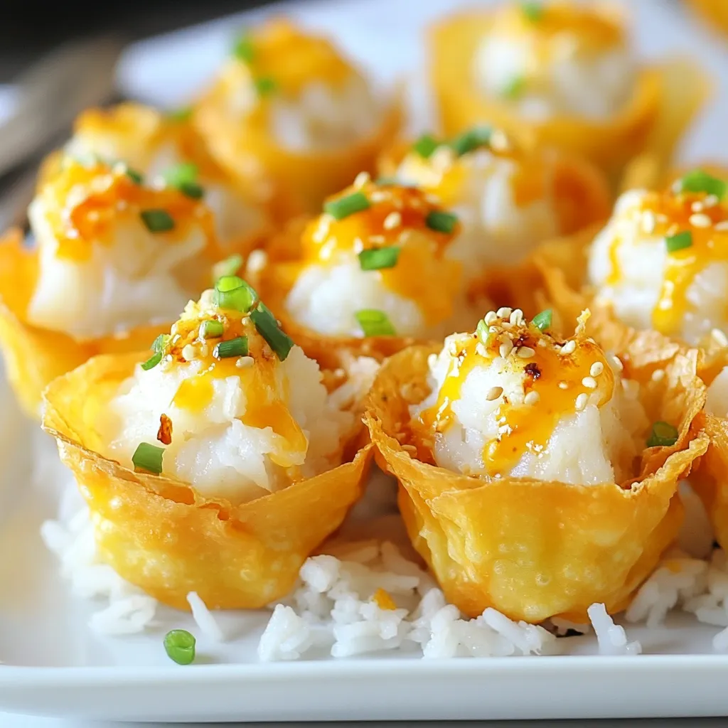 First, preheat your oven to 375°F (190°C). Then, lightly spray a muffin tin with olive oil spray. Take a wonton wrapper and fit it into a muffin cup. Press it gently against the sides. Repeat this with all the wrappers. Next, take a small amount of your sushi rice. Press it gently into the bottom of each wonton cup. This creates a solid base. Now, spoon the crab filling into each cup. Press down gently to secure it. Finally, bake in the preheated oven for 12 to 15 minutes. The wonton edges should be golden and crispy. Enjoy the delightful aroma filling your kitchen!