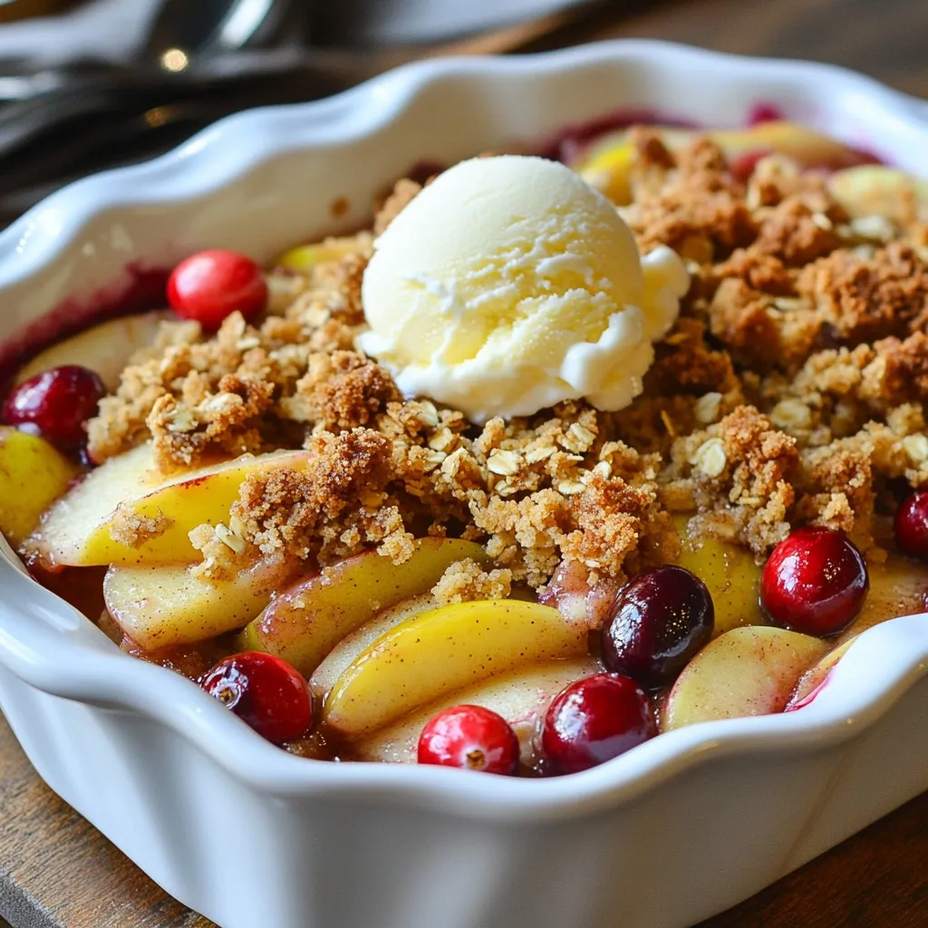 For this delightful dessert, you need three medium apples. I love using Granny Smith or Honeycrisp. They add a nice tartness that pairs well with sweet cranberries. You can use either fresh or frozen cranberries, about one cup will do. If using frozen, there's no need to thaw them. Next, gather your dry ingredients. You will need three-fourths cup of packed brown sugar. This gives the crisp a rich flavor. Add one teaspoon of ground cinnamon for warmth and a quarter teaspoon of ground nutmeg for depth. Lastly, you’ll need one cup of old-fashioned rolled oats and half a cup of all-purpose flour. These create the perfect texture for the topping. Butter makes everything better! Use half a cup of unsalted butter, softened to mix easily. It brings richness to the topping. Don't forget one tablespoon of lemon juice. This adds a bright zing to the fruit mixture, balancing the sweetness. These simple ingredients make this dessert a joy to prepare and eat. {{ingredient_image_1}} First, set your oven to 350°F (175°C). This temperature helps cook the crisp evenly. Next, take a 9x13 inch baking dish and grease it. You can use butter or cooking spray. Greasing prevents sticking and makes serving easier later. In a large bowl, combine the sliced apples and cranberries. Use three medium apples like Granny Smith or Honeycrisp for the best flavor. Add 3/4 cup of packed brown sugar. This sugar adds sweetness and depth. Then, sprinkle in 1 teaspoon of ground cinnamon and 1/4 teaspoon of nutmeg. These spices give warmth to the dish. Finally, drizzle in 1 tablespoon of lemon juice. The lemon brightens the flavors. Toss everything together until the fruit gets nicely coated. Once mixed, pour the fruit into your greased baking dish, spreading it evenly. In another bowl, mix together 1 cup of old-fashioned rolled oats, 1/2 cup of all-purpose flour, and 1/2 cup of softened unsalted butter. Use your hands or a pastry cutter to blend until it looks crumbly. This mixture will create a crunchy topping. Sprinkle the oat mixture evenly over the fruit layer. Make sure it covers all the apples and cranberries well. Place the baking dish in the preheated oven. Bake for 30-35 minutes. Watch for the top to turn golden brown and the fruit to bubble. This bubbling means the fruit is cooking well. Once done, take it out and let it cool slightly. This cooling helps the crisp set up before you serve. Enjoy your homemade cranberry apple crisp warm with ice cream or whipped cream! To make the best cranberry apple crisp, pick tart apples. Granny Smith and Honeycrisp work great. They balance the sweet cranberries well. Tart apples add flavor and keep their shape during baking. Avoid soft apples like Red Delicious. They turn mushy and lose texture. For a crunchy topping, mix oats, flour, and softened butter well. Use your hands or a pastry cutter. Aim for a crumbly texture, not a paste. The butter should coat the oats and flour. This helps create a golden, crispy layer when baked. Don’t skip the topping; it adds flavor and crunch. Serve your cranberry apple crisp warm. A scoop of vanilla ice cream makes it even better. You can also add whipped cream for extra richness. For a nice touch, sprinkle some cinnamon on top. This dessert looks great in a clear dish, showing off the colorful fruit. Enjoy it with family or friends for a special treat! Pro Tips Choose the Right Apples: For the best flavor and texture, use a mix of tart and sweet apples. Granny Smith adds tartness, while Honeycrisp offers sweetness and crunch. Make It Ahead: You can prepare the fruit mixture a day in advance and keep it in the fridge. Just add the topping before baking for a quick dessert! Experiment with Spices: Feel free to add a pinch of ginger or allspice to the topping for an extra layer of flavor that complements the apples and cranberries. Serve with a Twist: Add a scoop of caramel sauce or serve it with a slice of sharp cheddar cheese for a delicious contrast to the sweetness. {{image_2}} You can easily make this dish gluten-free. Use gluten-free oats and flour. These swaps keep the crisp's texture nice. You will still enjoy the great taste! Adding nuts brings a nice crunch. Try walnuts or pecans for a great flavor. You can also mix in other fruits. Pears or blueberries work well with apples and cranberries. Just remember to adjust the sugar if you add sweeter fruits. Spices can change the flavor of your crisp. Besides cinnamon and nutmeg, try ginger or cardamom for a twist. You can also add extracts. A splash of vanilla or almond extract can enhance the taste. These little changes make each crisp unique! After enjoying your Cranberry Apple Crisp, store any leftovers in an airtight container. Keep it in the fridge for up to three days. This helps keep the flavors fresh. I often use glass containers, but plastic works too. Just make sure the lid seals tightly. To reheat your crisp, preheat the oven to 350°F (175°C). Place the leftover crisp in a baking dish. Cover it with foil to prevent it from drying out. Heat for about 15-20 minutes. If you want it hot and bubbly, remove the foil for the last 5 minutes. You can also use a microwave if you’re in a hurry. Just heat in short bursts, checking often. You can freeze your Cranberry Apple Crisp for future treats. Let it cool completely first. Wrap it tightly in plastic wrap, then cover with foil. This helps prevent freezer burn. It stays good for up to three months. When ready to enjoy, let it thaw in the fridge overnight. Then reheat as mentioned above. Enjoy a taste of fall anytime! Yes, you can use frozen cranberries in this recipe. They work great! Just add them directly to the fruit mixture without thawing. This keeps the crisp fresh and tasty. The cooking time remains the same, so don’t worry about adjusting it. Frozen cranberries give a nice tart flavor that goes well with the sweet apples. You can tell the crisp is done when the top is golden brown. The fruit should bubble around the edges.