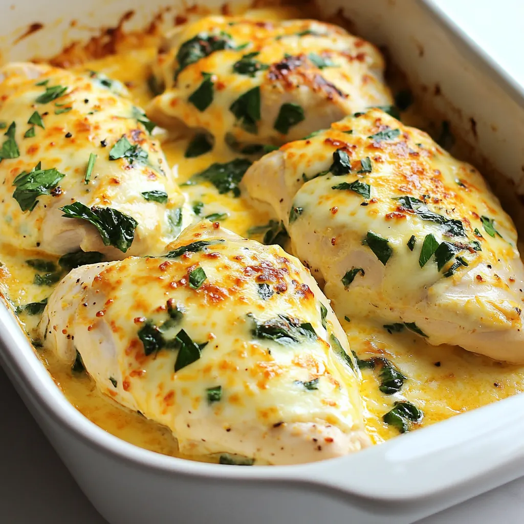 - 4 boneless, skinless chicken breasts - 1 cup cream cheese, softened - 1 cup shredded mozzarella cheese - 1/2 cup grated Parmesan cheese - 1 cup spinach, wilted (fresh or frozen, drained) - 3 cloves garlic, minced - 1 teaspoon Italian seasoning - 1/2 teaspoon paprika - Salt and pepper to taste - 2 tablespoons olive oil These ingredients work together to create a rich and creamy dish. The chicken breasts provide a great base. Cream cheese, mozzarella, and Parmesan create that luscious, cheesy layer. Spinach adds color and nutrition. Garlic and Italian seasoning give it depth and flavor. Paprika adds a nice hint of spice. Salt and pepper balance everything perfectly. Using fresh or frozen spinach is easy. Just make sure to drain it well if you use frozen. I love the combination of flavors in this dish. Each bite is a delight! You can even switch up the cheeses based on what you have at home. Enjoy the cooking process. It’s fun to mix and match! {{ingredient_image_1}} - Preheat the oven to 375Β°F (190Β°C). - Grease the baking dish with olive oil. Start by getting your oven nice and hot. This step is key for a perfect bake. While the oven warms, grab your baking dish and coat it with olive oil. This helps the chicken not stick and adds flavor. - Season chicken breasts with salt, pepper, and paprika. Next, take your chicken breasts. Sprinkle salt, pepper, and paprika evenly over them. This simple mix brings out the chicken's natural taste. Make sure to cover all sides for the best flavor. - Combine cream cheese, mozzarella, Parmesan, garlic, and Italian seasoning. - Fold in wilted spinach. Now, let’s make the creamy cheese mixture. In a bowl, mix together softened cream cheese, shredded mozzarella, grated Parmesan, minced garlic, and Italian seasoning. Stir it well until it’s smooth and creamy. Then, gently fold in the wilted spinach. This adds a pop of color and nutrients to your dish. - Spread cheese mixture over chicken and bake for 25-30 minutes. Take your cheese-spinach mix and spread it over the seasoned chicken. Cover it well for a rich flavor. Place the dish in the oven and bake for 25-30 minutes. Keep an eye on it until the chicken is cooked through and the top is golden and bubbly. Enjoy the delightful aroma filling your kitchen! - Use a meat thermometer to check if the chicken is cooked through. Aim for 165Β°F. - Let the dish cool slightly before serving. This helps the flavors settle. - Serve with a side of steamed broccoli or a mixed greens salad. This adds color and crunch. - Garnish with fresh parsley or basil for added flair. It makes the dish pop. - Experiment with different cheese combinations for varied flavors. Try cheddar or gouda. - Add red pepper flakes for a spicy kick. This gives your dish a nice heat. Pro Tips Use Fresh Spinach: Fresh spinach will give a brighter flavor and better texture than frozen. If using frozen, ensure it’s thoroughly drained to avoid excess moisture in the dish. Check Chicken Doneness: Always use a meat thermometer to check that the chicken has reached an internal temperature of 165Β°F (75Β°C) for safety and optimal juiciness. Experiment with Cheeses: Feel free to substitute with your favorite cheeses, such as gouda or cheddar, for a different flavor profile. Let it Rest: Allow the chicken to rest for a few minutes after baking. This helps retain the juices and makes for a more flavorful bite. {{image_2}} You can switch things up by using different proteins. Turkey or shrimp works well in this recipe. They bring their own flavors and keep the dish exciting. You can also use heavy cream instead of cream cheese. This change gives a richer sauce that enhances the meal. If you want a dairy-free option, try using non-dairy cream cheese. There are many cheese alternatives available now. These swaps let you enjoy the dish without dairy. Adding different herbs or spices can really change the taste. You might try thyme for a fresh note or cumin for a warm flavor. These simple changes can make the dish unique every time you cook it. To store leftovers in the fridge, first let the dish cool. Place it in an airtight container. This keeps the chicken moist and fresh. You can store it for up to three days. Always label the container with the date. For long-term storage, freezing works well. First, let the chicken bake cool completely. Then, wrap it tightly in plastic wrap. Place the wrapped dish in a freezer-safe bag. It can stay frozen for up to three months. When ready to eat, thaw it overnight in the fridge. To reheat, place the chicken bake in the oven. Preheat it to 350Β°F (175Β°C). Cover the dish with foil to keep it moist. Heat for about 20-25 minutes. Check the center with a fork to ensure it's hot. Enjoy the creamy flavors just like the first time! This recipe serves 4 people. You can share it with family or friends. If you need more, just double the ingredients. Yes, but adjust cooking time accordingly. Frozen chicken takes longer to cook. Make sure to check the internal temperature. It's great alongside low-carb vegetables or salads. Steamed broccoli or a mixed greens salad works well. You can add a light dressing for extra flavor. Use a meat thermometer to ensure it reaches 165Β°F (75Β°C). This way, you know it's safe to eat. The chicken should look white and no longer pink inside. This blog post covered a rich, creamy low-carb chicken bake recipe. You learned about the main and additional ingredients, along with step-by-step instructions. I shared tips for cooking, serving, and flavor options to make your dish shine. Remember, you can vary the recipe to suit your needs. Proper storage and reheating help keep leftovers fresh. Overall, this dish is easy, tasty, and perfect for any meal. Happy cooking!