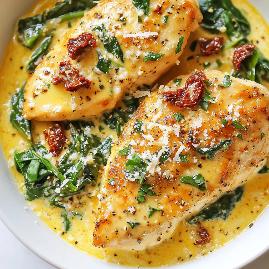 To make Creamy Sun-Dried Tomato Chicken, gather these items: - 4 boneless, skinless chicken breasts - 1 cup heavy cream - 1/2 cup sun-dried tomatoes, chopped - 1/2 cup chicken broth - 1 tablespoon olive oil - 2 cloves garlic, minced - 1 teaspoon dried basil - 1 teaspoon dried oregano - Salt and pepper to taste - Fresh spinach, for garnish - Grated parmesan cheese, for serving You can adjust some ingredients for your taste: - Use olive oil or butter. - Heavy cream can be swapped for half-and-half for a lighter sauce. - Chicken broth can be replaced with vegetable broth for a vegetarian option. - Fresh garlic can replace minced garlic. - Any cooked chicken can work, like rotisserie chicken. This dish can fit many diets: - Gluten-Free: All ingredients are gluten-free. - Low-Carb: This recipe is low in carbs, making it great for keto diets. - Dairy-Free: Substitute coconut cream for heavy cream and skip cheese. - Paleo-Friendly: Use full-fat coconut milk and avoid dairy. These options help everyone enjoy this delicious meal! {{ingredient_image_1}} Start with four boneless, skinless chicken breasts. First, season them with salt and pepper on both sides. This step gives the chicken flavor. Next, take a large skillet and add one tablespoon of olive oil. Heat the oil over medium heat. When the oil is hot, place the chicken breasts in the skillet. Cook them for about 6 to 7 minutes on each side. You want them golden and cooked through. Once done, remove the chicken from the skillet and set it aside. In the same skillet, add two cloves of minced garlic. Sauté them for about 30 seconds until you smell the garlic. This step adds a nice aroma. Next, add half a cup of chopped sun-dried tomatoes to the skillet. Then, sprinkle in one teaspoon each of dried basil and dried oregano. Stir everything and cook for another minute. This helps to blend the flavors. Now, slowly pour in half a cup of chicken broth. Scrape any bits stuck to the skillet. Let the mixture simmer for 2 to 3 minutes. After simmering, reduce the heat to low. Now, add one cup of heavy cream to the skillet. Stir it continuously until the sauce thickens a bit. This will create a creamy texture. Then, return the chicken breasts to the skillet. Make sure they are well coated with the sauce. Cook for an additional 2 to 3 minutes until the chicken is heated through. Finally, remove the skillet from heat. Garnish with fresh spinach and grated parmesan cheese before serving. Enjoy your meal! To cook chicken breasts just right, follow these tips: - Pound the chicken: Make the chicken even in thickness. This helps it cook evenly. - Don’t overcrowd the pan: Cook chicken in batches if needed. This keeps the heat steady. - Use a meat thermometer: Aim for 165°F (75°C) to ensure safety and juiciness. - Let it rest: Rest the chicken for a few minutes before slicing. This locks in the juices. Getting that perfect creamy sauce is key. Here’s how: - Use heavy cream: It gives the sauce a rich texture. - Add broth slowly: This helps the sauce blend well and prevents curdling. - Stir continuously: When adding cream, keep stirring to mix flavors and avoid separation. - Simmer gently: Let the sauce simmer on low heat. This thickens it without burning. Garnishing adds a nice touch. Try these ideas: - Fresh spinach: Sprinkle fresh spinach on top for color and flavor. - Grated parmesan: Add freshly grated parmesan cheese for a salty kick. - Serve with pasta or rice: Pair the chicken with pasta or rice to soak up the sauce. - Add herbs: Fresh herbs like basil or parsley can enhance the dish’s taste and look. Pro Tips Perfectly Cooked Chicken: Use a meat thermometer to ensure your chicken reaches an internal temperature of 165°F (75°C) for safe consumption. Enhance the Flavor: For an extra depth of flavor, consider marinating the chicken in olive oil, garlic, and herbs for at least 30 minutes before cooking. Adjust Creaminess: If you prefer a thicker sauce, let it simmer for a few extra minutes after adding the cream, stirring frequently to prevent burning. Garnish Ideas: Experiment with different garnishes like fresh basil, parsley, or even a squeeze of lemon juice for added brightness and flavor. {{image_2}} You can easily add vegetables to make this dish even better. Fresh spinach is a great start. It adds color and nutrients. You can also use bell peppers, mushrooms, or zucchini. Just sauté them before adding the sauce. This way, they blend well with the creamy flavor. If you want to switch up the protein, try shrimp or tofu. Shrimp cooks fast and works well with the sauce. Just sauté it until pink, and then add it to the sauce. For a vegan option, use firm tofu. Cut it into cubes and sauté until golden. Both options taste great with sun-dried tomatoes. You can change the flavor by using different spices and herbs. If you like heat, add red pepper flakes. For a fresh taste, try fresh basil or parsley. You can also mix in some lemon zest for a zesty twist. These small changes can make the dish feel new each time you cook it. After making creamy sun-dried tomato chicken, you may have some leftovers. Store them in an airtight container. Make sure the chicken is completely cool before you put it away. This helps keep the chicken fresh. You can keep it in the fridge for up to three days. If you want to save your creamy sun-dried tomato chicken for later, freezing is a great option. Place the cooled chicken in a freezer-safe container or bag. Remove as much air as you can to prevent freezer burn. You can freeze it for up to three months. When you’re ready to enjoy it, thaw it in the fridge overnight before reheating. When reheating, I recommend using a skillet. Heat it on low and add a splash of chicken broth or cream. This keeps the chicken moist and flavorful. Stir gently until heated through. You can also use the microwave, but be careful not to overcook it. Heat in short bursts and check often to keep it from drying out. Enjoy your creamy dish just