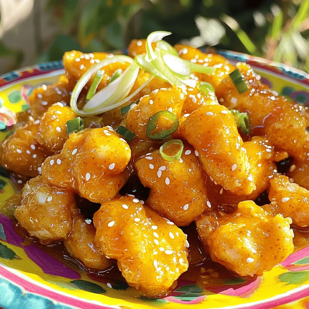 ![To make Easy Orange Chicken, gather these simple ingredients: - 1 lb (450g) boneless chicken thighs, cut into bite-sized pieces - 1/2 cup cornstarch - 2 tablespoons vegetable oil - 1 cup orange juice (freshly squeezed if possible) - Zest of 1 orange - 2 tablespoons soy sauce - 2 tablespoons honey - 1 teaspoon grated ginger - 2 cloves garlic, minced - 1 tablespoon rice vinegar - 1/2 teaspoon red pepper flakes (optional, for heat) You can make your dish pop with these fun garnishes: - 2 green onions, sliced - Sesame seeds If you need to swap ingredients, try these options: - Use chicken breast instead of thighs for a leaner choice. - Maple syrup can replace honey for a different sweetness. - You can use lime juice if you don't have orange juice. - If you want more heat, add sriracha instead of red pepper flakes. Now you have everything you need to create a tasty meal in minutes! For the full recipe, refer to the Easy Orange Chicken section. Start by cutting your chicken thighs into bite-sized pieces. This helps them cook evenly. Next, place the chicken in a large bowl. Add the cornstarch and toss until the pieces are well coated. Make sure to shake off any extra cornstarch. This step is key to getting that crispy texture. Heat vegetable oil in a large skillet or wok over medium-high heat. Once the oil is hot, add the coated chicken. Cook the chicken in batches to avoid crowding. It should take about 4-5 minutes per batch. Look for a nice golden brown color. Once cooked, remove the chicken and place it on a plate. In the same skillet, lower the heat to medium. Add minced garlic and grated ginger, sautéing for about 30 seconds. You want to smell their wonderful aroma. Now, pour in the orange juice, zest, soy sauce, honey, rice vinegar, and red pepper flakes if you want some heat. Stir the mixture well and bring it to a gentle simmer. Let the sauce simmer for about 3-5 minutes. This helps it thicken a bit. Once it’s ready, return the cooked chicken to the skillet. Toss everything together so the chicken gets coated in the sauce. Cook for another 2-3 minutes to meld the flavors. Now you have a tasty orange chicken ready to enjoy! For the full recipe, check here. To get crispy chicken, coat it well with cornstarch. This forms a nice crust. Heat the oil until it shimmers before adding the chicken. Cook in batches to avoid crowding. Each piece should have room to fry evenly. This step keeps the chicken crunchy and golden. For a thick sauce, let it simmer longer. This helps it reduce and intensify flavor. If it's too thin, mix a bit of cornstarch with water. Stir this mixture in and cook until it thickens. Adjust the thickness to suit your taste. A well-balanced sauce clings beautifully to the chicken. Add zest or herbs for more flavor. Fresh herbs like cilantro or basil can brighten the dish. You might also try adding a splash of orange liqueur for depth. For heat, mix in more red pepper flakes. Each tweak can make your orange chicken unique. Explore these options to find what you love. For the full recipe, check here: [Full Recipe]. {{image_2}} You can add colorful vegetables to your orange chicken. This makes the dish healthier and more fun. Try broccoli, bell peppers, and snap peas. Just sauté the veggies in the same skillet before adding the sauce. Cook them until they are bright and tender. Then, mix the chicken back in with the sauce. You get a tasty and vibrant meal. If you like a kick, make it spicy! Add more red pepper flakes to the sauce. Start with one teaspoon and adjust to your taste. You can also add fresh chili peppers for extra heat. Just slice them thin and sauté them with the garlic and ginger. This brings out their flavor. Your spicy orange chicken will excite your taste buds! You can switch up the protein in this recipe. Try shrimp or tofu for a different taste. For shrimp, cook them until they turn pink, then add the sauce. If you want to use tofu, press it to remove moisture, then cube it. Cook it until it's golden before mixing in the sauce. Each protein brings a unique flavor to the dish, making it versatile and fun. For the full recipe, check out the link. To store your leftover Easy Orange Chicken, place it in an airtight container. Make sure it cools down first. This helps keep the chicken juicy and fresh. Store it in the fridge for up to three days. If you want to enjoy it later, freezing is a great option. When you're ready to eat the leftovers, reheating is simple. You can use a microwave or a skillet. For the microwave, place the chicken in a bowl and cover it. Heat for 1-2 minutes until warm. If you use a skillet, add a splash of water or orange juice to keep it moist. Heat on medium until it’s hot. If you want to freeze Easy Orange Chicken, do this right after it cools. Use a freezer-safe container or bag. It can last for up to three months in the freezer. When you're ready to eat, thaw it overnight in the fridge. Then, reheat as mentioned above. This way, you'll have a tasty meal ready in minutes! For the full recipe, check out the Easy Orange Chicken section. You can make Easy Orange Chicken healthier by using less oil. Try baking the chicken instead of frying it. You can also use skinless chicken thighs or even chicken breast for a leaner option. Replace honey with a natural sweetener like agave or maple syrup. Add fresh veggies like bell peppers or broccoli to boost nutrients. Yes, you can use chicken breast instead of thighs. Chicken breast has less fat and can be just as tasty. Slice the breast into bite-sized pieces. It cooks quickly, so watch it closely to avoid overcooking. Adjust the cooking time to about 3-4 minutes per batch. You can serve Easy Orange Chicken with steamed rice or quinoa. These sides soak up the sauce well. Adding a fresh salad or stir-fried veggies adds color and crunch. You can also try it with noodles for a fun twist. To thicken the sauce, let it simmer longer. This reduces the liquid and concentrates the flavors. If you wan