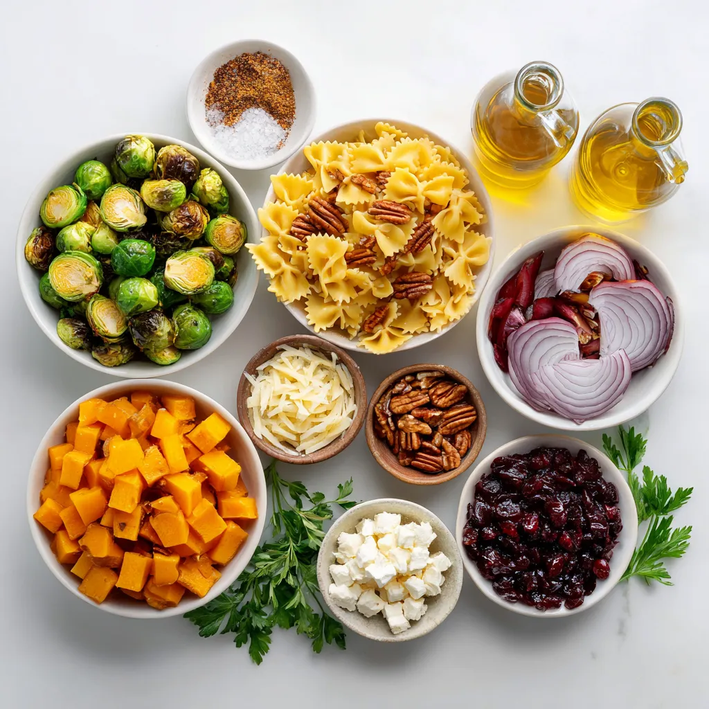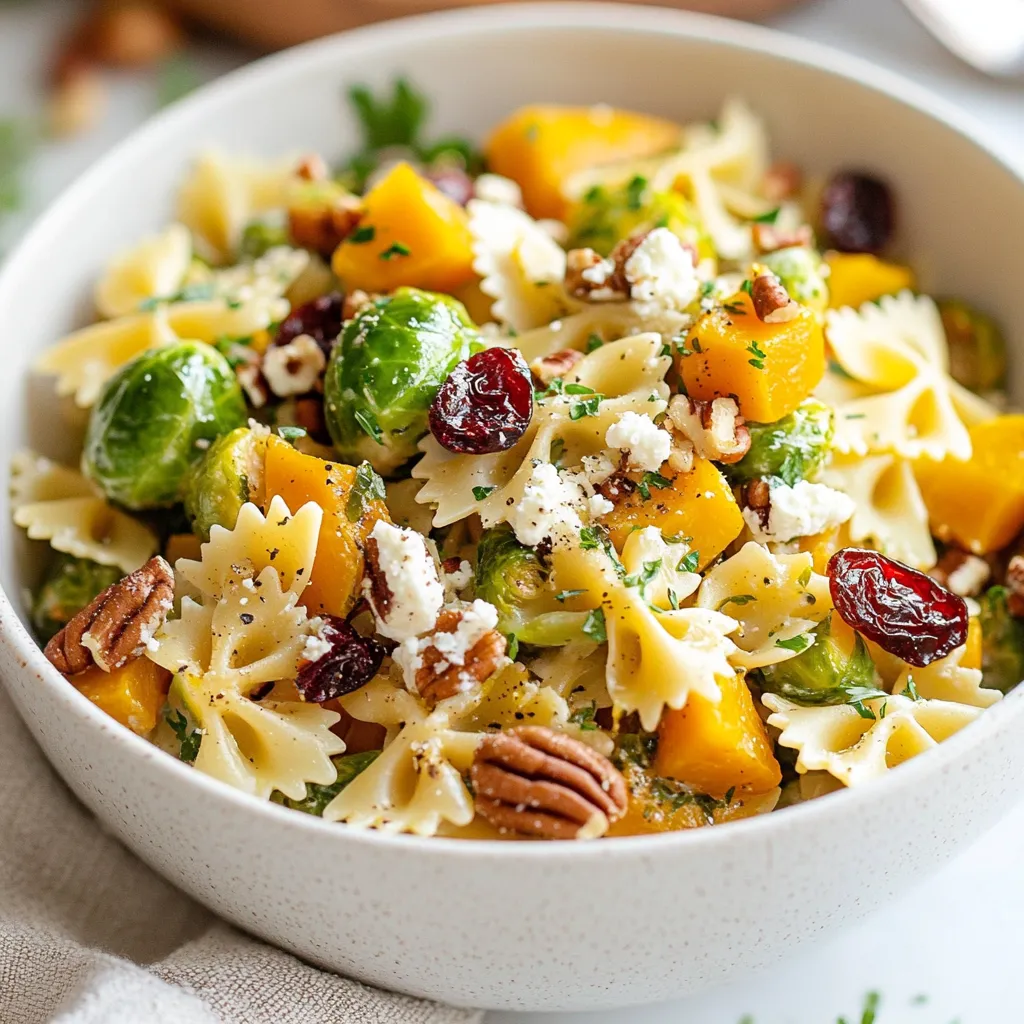 - In a large mixing bowl, combine the cooked pasta, roasted butternut squash, Brussels sprouts, dried cranberries, crumbled goat cheese, chopped pecans, and sliced red onion.