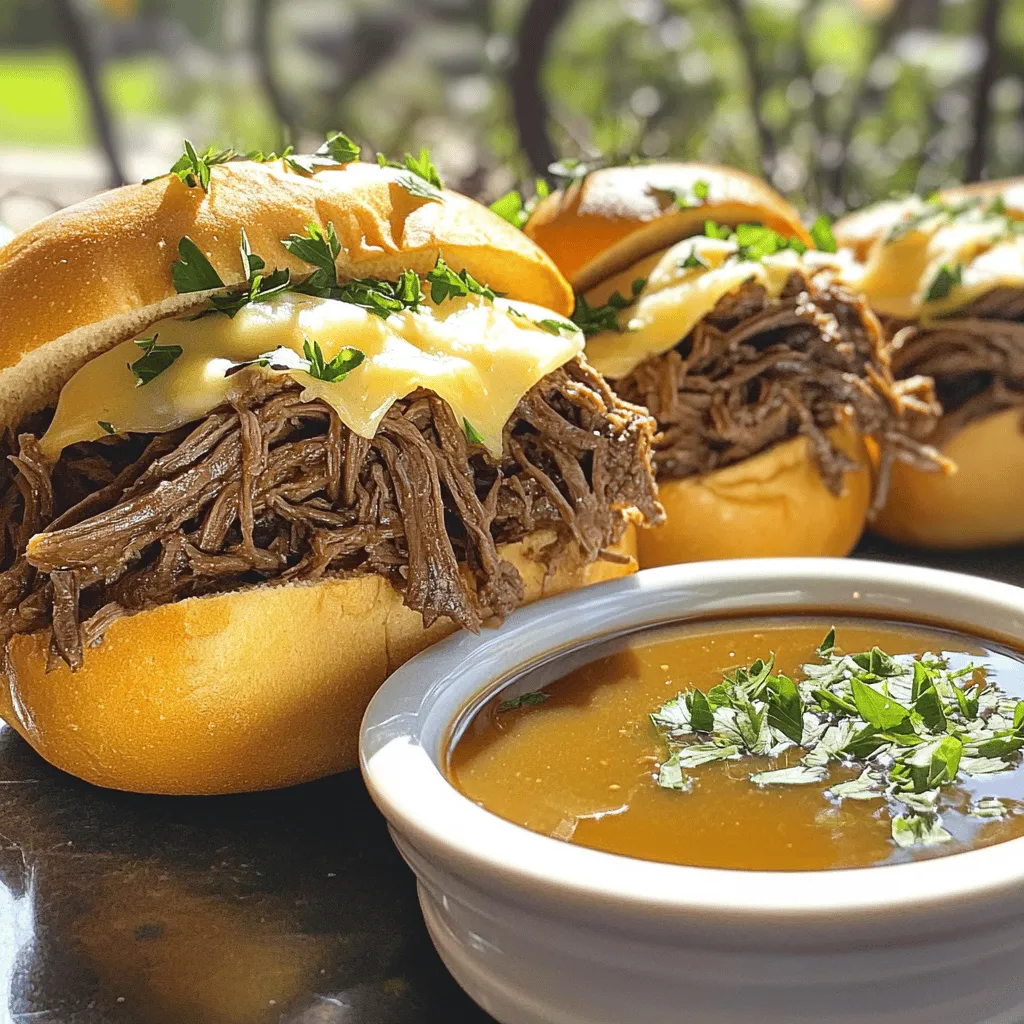 - 3 lbs beef chuck roast - 1 onion, sliced - 4 cloves garlic, minced - 4 cups beef broth - 2 tablespoons Worcestershire sauce - 2 teaspoons dried thyme - 1 teaspoon black pepper - 1 tablespoon olive oil - 6 hoagie or sub rolls - 6 slices provolone cheese - Fresh parsley for garnish (optional) When making French dip sandwiches, start with the beef chuck roast. This cut is perfect for slow cooking. It becomes tender and juicy. Slicing one onion adds sweetness. The minced garlic gives a nice kick. Next, you need beef broth. This is the heart of your au jus. Worcestershire sauce adds depth and umami flavor. For seasoning, dried thyme and black pepper enhance the roast. Olive oil helps with searing, locking in flavors. When serving, choose fresh hoagie rolls. They hold the beef well and add texture. Provolone cheese melts beautifully on top. A sprinkle of fresh parsley adds color and flavor. These ingredients come together for a rich and satisfying meal. - Seasoning the roast Start with a 3-pound beef chuck roast. Rub it well with black pepper and dried thyme. This adds a rich, savory taste. - Searing the meat Heat 1 tablespoon of olive oil in a skillet over medium-high heat. Once hot, add the roast. Sear each side for about 4 to 5 minutes. Look for a nice brown crust. This step locks in flavor and moisture. - Transferring ingredients to the slow cooker After searing, place the roast in your slow cooker. Add 1 sliced onion, 4 minced garlic cloves, 4 cups of beef broth, and 2 tablespoons of Worcestershire sauce. Mix them gently. - Cooking time and temperature Cover the slow cooker and set it to low. Cook for 8 hours. The beef should be very tender and shred easily. - Shredding the beef After cooking, take the roast out carefully. Use two forks to shred the beef. Return it to the slow cooker so it can soak in the juices. - Filling the rolls Cut 6 hoagie rolls in half. Spoon a generous amount of shredded beef into each roll. - Melting the cheese Top each sandwich with a slice of provolone cheese. Place the filled rolls under the broiler for 2 to 3 minutes. Watch closely until the cheese is melted and bubbly. To get great flavor, searing is key. This step locks in juices and adds depth. Heat olive oil in a skillet. Sear the beef on all sides until brown. This takes about 4-5 minutes per side. The crust adds a rich taste to the meat. Using homemade broth makes a big difference. Store-bought broth can be salty. Homemade broth is fresh and full of flavor. If you don’t have time, choose a low-sodium option. This helps control the salt level in your dish. Slow cooking makes the meat tender. Cooking on low for 8 hours breaks down tough fibers. This results in juicy, easy-to-shred beef. The longer you cook, the better the flavor. For the cheese, broiling is the best method. Once you fill the hoagie rolls, place them under the broiler. This melts the cheese perfectly. Keep an eye on it. It only takes 2-3 minutes to get bubbly and golden. Garnishing the sandwiches can elevate your dish. A sprinkle of fresh parsley adds a pop of color. It also brightens the flavor. Serve your sandwiches with dill pickles. They add a nice crunchy contrast. Consider pairing your French Dip sandwiches with chips or a salad. A simple green salad complements the rich meat. This balance enhances the meal’s appeal. {{image_2}} You can swap the beef chuck roast for brisket or round roast. These cuts also work well and add different flavors. If you want a meatless option, try using mushrooms or jackfruit. Both provide a nice texture and soak up the rich au jus. Provolone is classic, but you can use Swiss or cheddar for a twist. Each cheese melts differently and adds unique taste. You can also add toppings like sautéed mushrooms or caramelized onions. These extras enhance the flavor and make each bite special. Hoagie rolls are great, but you can use baguettes or ciabatta. These options give you different textures. If you need gluten-free bread, look for gluten-free rolls. Many stores offer tasty choices that hold up well with the juicy filling. Store any leftover French Dip Sandwiches in the fridge. Use airtight containers to keep them fresh. Leftovers can last up to four days. If you want to keep them longer, consider freezing. To freeze sandwiches, wrap each one tightly in plastic wrap. Then place them in a freezer-safe bag. This helps prevent freezer burn. When ready to eat, thaw them in the fridge overnight. Reheat in the oven for the best taste. Use glass or plastic containers for storage. Make sure they have tight lids. Label containers with the date you made the sandwiches. This helps you know how long they have been stored. You can tell the beef is done when it is very tender. After about 8 hours in the slow cooker, it should shred easily with two forks. If you check it and it still feels tough, let it cook longer. The right texture makes all the difference in your sandwich. Yes, you can! For Instant Pot cooking, use the sauté function first. Sear the beef for a rich flavor. Then, add the broth and other ingredients. Cook on high pressure for about 60-70 minutes. Let it naturally release pressure for best results, then shred as usual. These sandwiches pair well with various sides. Consider serving them with: - Dill pickles - Potato chips - Coleslaw - French fries - A simple green salad These sides add crunch and freshness to your meal. To reheat, you have a few easy options. You can warm the beef in the microwave or on the stove. Just add a little au jus to keep it moist. If you want to melt the cheese, place the filled rolls under the broiler for a few minutes. Watch closely to prevent burning! Absolutely! While beef broth is classic, you can mix it up. Use chicken broth for a lighter taste or vegetable broth for a vegetarian option. Each will add its own unique flavor to the sauce, making your dish special every time. This blog post shared a simple way to make French Dip Sandwiches. You learned about key ingredients,