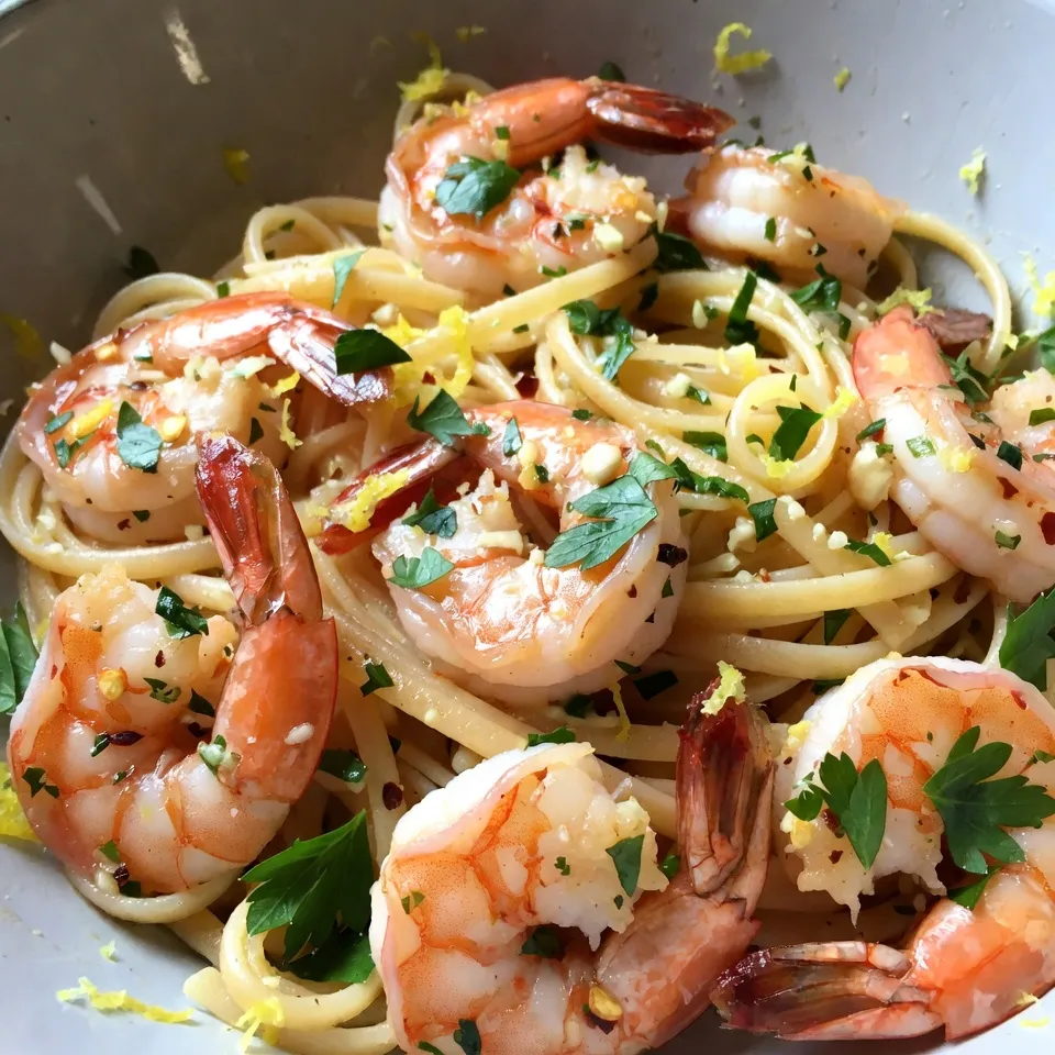 A delicious shrimp scampi recipe with garlic, herbs, and lemon, served over pasta.