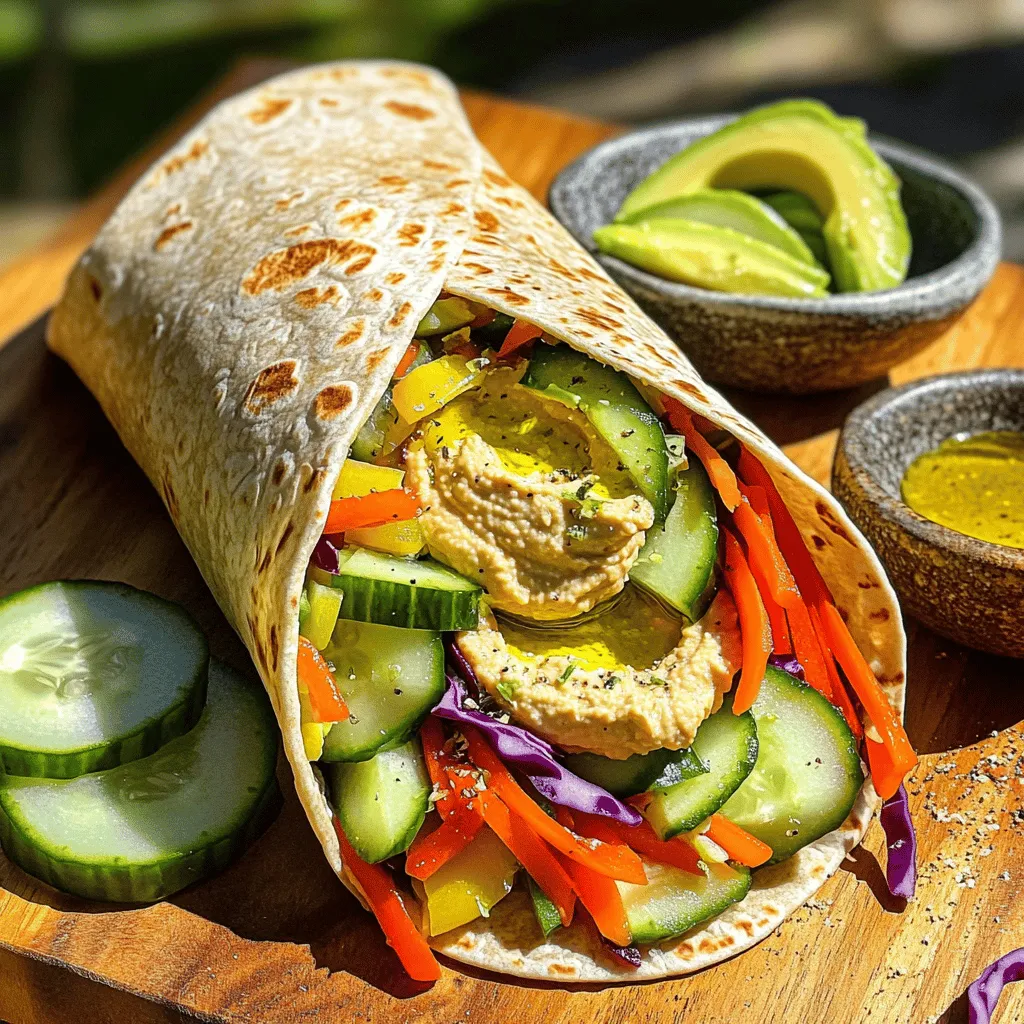 - 1 large whole wheat wrap or tortilla - 1/2 cup hummus (store-bought or homemade) - 1/2 cup cucumber, thinly sliced - 1/2 cup bell pepper, thinly sliced (use a mix of colors for visual appeal) - 1 medium carrot, julienned or grated - 1/4 cup red cabbage, shredded - 1/4 avocado, sliced - 1 tablespoon fresh lemon juice - 1 tablespoon olive oil - Salt and pepper to taste - A handful of fresh spinach or mixed salad greens You can change the wrap's taste and look with fun extras. Try adding olives, sun-dried tomatoes, or even roasted red peppers. Each ingredient adds flavor and color. You can also switch out the hummus for a different spread like tzatziki or guacamole. This wrap is packed with good-for-you nutrients. It has fiber from the whole wheat wrap and veggies. It also has healthy fats from the avocado and olive oil. Each wrap has about: - Calories: 350 - Protein: 10g - Carbohydrates: 40g - Fiber: 12g - Fat: 15g This meal is light, fresh, and full of flavor. It's a great choice for lunch or a snack. Plus, you can feel good knowing you’re eating a healthy meal. Enjoy! Start by washing the vegetables well. Cleanliness is key to a great wrap. Next, slice the cucumber and bell peppers thinly. The colors will make your wrap pop. Then, julienne or grate the carrot. Shred the red cabbage and set everything aside. If you like, you can add some fresh spinach or salad greens for extra crunch. Now, lay the whole wheat wrap or tortilla flat on a clean surface. If the wrap feels stiff, warm it in a dry skillet or microwave for about 10 seconds. This helps it bend better. Take 1/2 cup of hummus and spread it evenly across the wrap, leaving a small border around the edges. This base is creamy and rich. Begin layering your veggies right in the center of the hummus. Start with the cucumber slices, then add the bell peppers, grated carrot, shredded cabbage, and avocado. If you’re using spinach or salad greens, sprinkle them on top. This adds freshness. Drizzle fresh lemon juice and olive oil over the veggies. Sprinkle with salt and pepper to taste for added flavor. To wrap it up, start from one side. Fold in the edges of the wrap to keep the filling inside. Then, roll it tightly from the bottom to the top. Make sure it’s snug to avoid spills. A tight roll makes the wrap easier to eat. For serving, cut the wrap diagonally in half with a sharp knife. This gives it a nice look. Place the wrap on a wooden cutting board or plate. You can add a small bowl of hummus for dipping. A sprinkle of sesame seeds or fresh herbs on the plate adds flair and makes it more appealing. When picking veggies, look for bright colors. Choose firm cucumbers and bell peppers. Check for fresh greens without wilting. Smell the produce; it should be fresh and not sour. Ask your local market for the best options in season. Seasonal produce tastes better and is often cheaper. To boost flavor, add herbs or spices to the hummus. You can mix in garlic powder, cumin, or paprika. A splash of hot sauce adds a nice kick! Consider adding a drizzle of balsamic glaze for sweetness. Mix textures by using crunchy veggies like radishes or jicama. Avoid overstuffing the wrap. Too much filling makes it hard to roll. Don’t skip seasoning; a little salt and pepper make a difference. If your wrap tears, don’t panic! Just use a little extra hummus to seal it back together. Lastly, always wash your veggies to remove dirt and pesticides. {{image_2}} You can mix up your wrap with other veggies. Try using roasted red peppers or zucchini. Spinach adds a nice green touch. You can also add radishes for a crunch. If you like a bit of heat, jalapeños are great too. These swaps keep your wrap interesting and full of flavor. Hummus comes in many flavors. Classic hummus is always a hit. You might enjoy garlic or roasted red pepper hummus. For a twist, try adding jalapeños or sun-dried tomatoes to your base. You can even make a sweet hummus with chocolate or vanilla for a fun dessert wrap. Explore these flavors to find your favorite! To make your wrap more filling, add proteins. Grilled chicken or turkey slices work well. For a veggie option, consider chickpeas or black beans. You can also sprinkle in some feta cheese for a salty kick. These proteins turn your wrap into a satisfying meal, perfect for lunch or dinner. To keep your leftover wraps fresh, wrap them tightly in plastic wrap. This prevents air from drying them out. You can also place them in an airtight container. Store the wraps in the fridge for up to two days. If you see any moisture, use a paper towel to absorb it before sealing. To maintain the freshness of your ingredients, store them separately. Keep sliced veggies in airtight containers in the fridge. For longer-lasting produce, consider using a damp paper towel inside the container. This keeps them crisp. Avocado should be stored cut-side down in lemon juice to prevent browning. If you want to enjoy your wrap warm, reheat it gently. Use a skillet over low heat for about two minutes on each side. This warms it through without making it soggy. You can also microwave it for 10 to 15 seconds. Just make sure to wrap it in a damp paper towel to keep it soft. Yes, you can make this wrap ahead of time. Just wrap it tightly in plastic wrap or foil. Store it in the fridge until you're ready to eat. The flavors will blend well, making it tasty. However, if you add fresh greens, wait until just before eating to add them. This keeps them crisp and fresh. Absolutely! This wrap is great for meal prep. You can make several wraps at once and store them. Keep them in airtight containers in the fridge. This way, you have a quick meal ready for busy days. Just remember to add any fresh ingredients right before eating. If you want something different, try using avocado spread or tzatziki sauce. Both add creaminess and flavor. You can also use bean dips or any other spread you enjoy. Just make sure it complements the veggies you choose. To make a gluten-fr