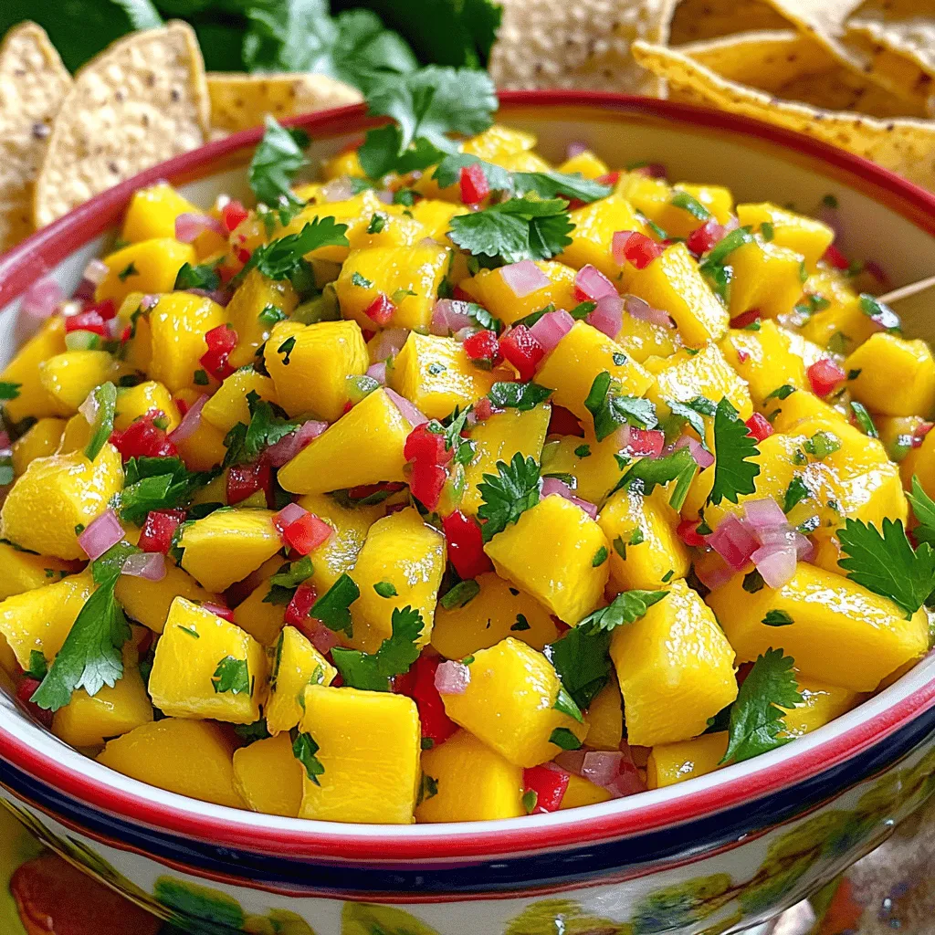 - Ripe mangoes - Red bell pepper - Red onion - Jalapeño - Fresh cilantro - Lime juice - Salt and pepper - Optional ingredient: Honey To make a great mango salsa, you need fresh and ripe ingredients. Ripe mangoes are key. They should be soft but not mushy. Pick them by gently pressing the skin. If it gives a little, it is ready. You will also need a red bell pepper. It adds a nice crunch and sweet flavor. Next, get a small red onion. It provides a sharp taste that balances the sweet mango. For some heat, use a jalapeño. Make sure to deseed it if you want less spice. Fresh cilantro adds a burst of flavor. Lime juice adds tang and brightness. Don’t forget to season with salt and pepper. If you like sweet salsa, add honey for extra flavor. Mangoes are packed with vitamins and minerals. They have vitamin C, which boosts your immune system. They also have fiber, helping with digestion. Jalapeños contain antioxidants. These compounds help keep your body healthy. They may also help with pain relief. Fresh herbs like cilantro are great, too. They add flavor without extra calories. They also have vitamins and can help with digestion. Eating mango salsa is not only tasty but also good for you. For the full recipe, check out the Mango Tango Salsa. - Start by peeling and dicing the ripe mangoes into small cubes. - Place the diced mangoes in a mixing bowl. - Next, finely chop the red bell pepper, red onion, and jalapeño. - Add these chopped ingredients to the bowl with the mango. - Finally, chop the fresh cilantro and toss it into the mix. - Squeeze the juice of two limes over the ingredients in the bowl. - If you like a touch of sweetness, add a tablespoon of honey. - Mix everything gently, being careful not to mash the mango pieces. - Season the salsa with salt and pepper to taste. - Stir well and adjust seasoning if needed. - Cover the bowl and refrigerate the salsa for at least 30 minutes. - This step lets the flavors meld together for a better taste. - Remember, the longer it sits, the more delicious it becomes. - Serve the salsa fresh, and enjoy the burst of flavors. For the full recipe, make sure to check the detailed instructions provided above! To make great mango salsa, you must choose the right mango. Look for ripe mangoes. They should feel slightly soft when you press them gently. A ripe mango has a sweet smell at the stem. Unripe mangoes are hard and taste sour. For salsa, the best varieties are the Haden and Ataulfo mango. Haden has a sweet taste and bright color. Ataulfo is creamy and very sweet. Both varieties will add a rich flavor to your salsa. Heat can make salsa exciting. You can adjust the spice level by adding or removing jalapeños. If you like it mild, use less jalapeño or remove the seeds. For more heat, add more jalapeño. You can also try other peppers like serrano or poblano for different flavors. If you want a sweet heat, add some diced bell pepper too. Mango salsa pairs well with many dishes. Use it as a topping for grilled chicken or fish. It also tastes great with tacos or burritos. For a fun twist, serve it with tortilla chips. When presenting your salsa, use a colorful bowl. Garnish with extra cilantro on top for a fresh look. This adds a pop of color and makes the dish even more appealing. For the full recipe, check out the instructions above. {{image_2}} To spice up your mango salsa, you can add extra chilies or a splash of hot sauce. This gives your dish a nice kick. Use serrano peppers for a sharper heat, or add a few dashes of your favorite hot sauce. Adjust the spice to suit your taste. If you want a milder version, just use less jalapeño. Remember, it’s all about balancing the flavors. For a tropical twist, incorporate pineapple or creamy avocado into your salsa. Diced pineapple adds sweetness and acidity, while avocado creates a smooth texture. You can also mix in other fruits like kiwi or papaya for unique flavors. This combination makes your salsa even more vibrant and refreshing. Try different fruit blends to find your favorite! Using different herbs or citrus fruits can give your salsa a unique flavor. Instead of cilantro, try using fresh mint or basil for a fresh taste. You can also add lime zest or orange juice for an extra citrus punch. Experimenting with flavors keeps your mango salsa exciting. Don’t be afraid to mix and match to create your own signature salsa. For the full recipe, check out the Mango Tango Salsa! To keep your leftover mango salsa fresh, store it in the fridge. Place it in an airtight container. This method prevents air from spoiling the flavors. Glass containers work well, but plastic containers are fine too. Always use a clean spoon to scoop out the salsa. This keeps bacteria from getting in. Fresh mango salsa lasts about 2 days in the fridge. After that, it loses flavor and texture. If you store it properly, it can last up to a week. Check for signs of spoilage before using. If you see any mold or strange colors, throw it away. A sour smell is also a clear sign it's gone bad. You can freeze mango salsa if you have too much. First, pour it into a freezer-safe bag. Remove as much air as you can to avoid freezer burn. Label the bag with the date. It can last up to 3 months in the freezer. When you're ready to use it, take the salsa out and let it thaw in the fridge overnight. Avoid thawing in the microwave, as it can change the texture. Once thawed, use it within 2 days for the best taste. Enjoy the flavors of your mango salsa even after freezing! For the full recipe, check out Mango Tango Salsa. Yes, you can make mango salsa ahead of time. I suggest making it up to 24 hours in advance. This allows the flavors to mix well. If you prepare it too early, the mango may get mushy. Store it in an airtight container in the fridge. Always stir gently before serving to refresh the mix. Mango salsa is very versatile. Here are some great options: - Grilled fish or chicken - Tacos or burritos - Tortilla chips - Quesadillas - Rice or 