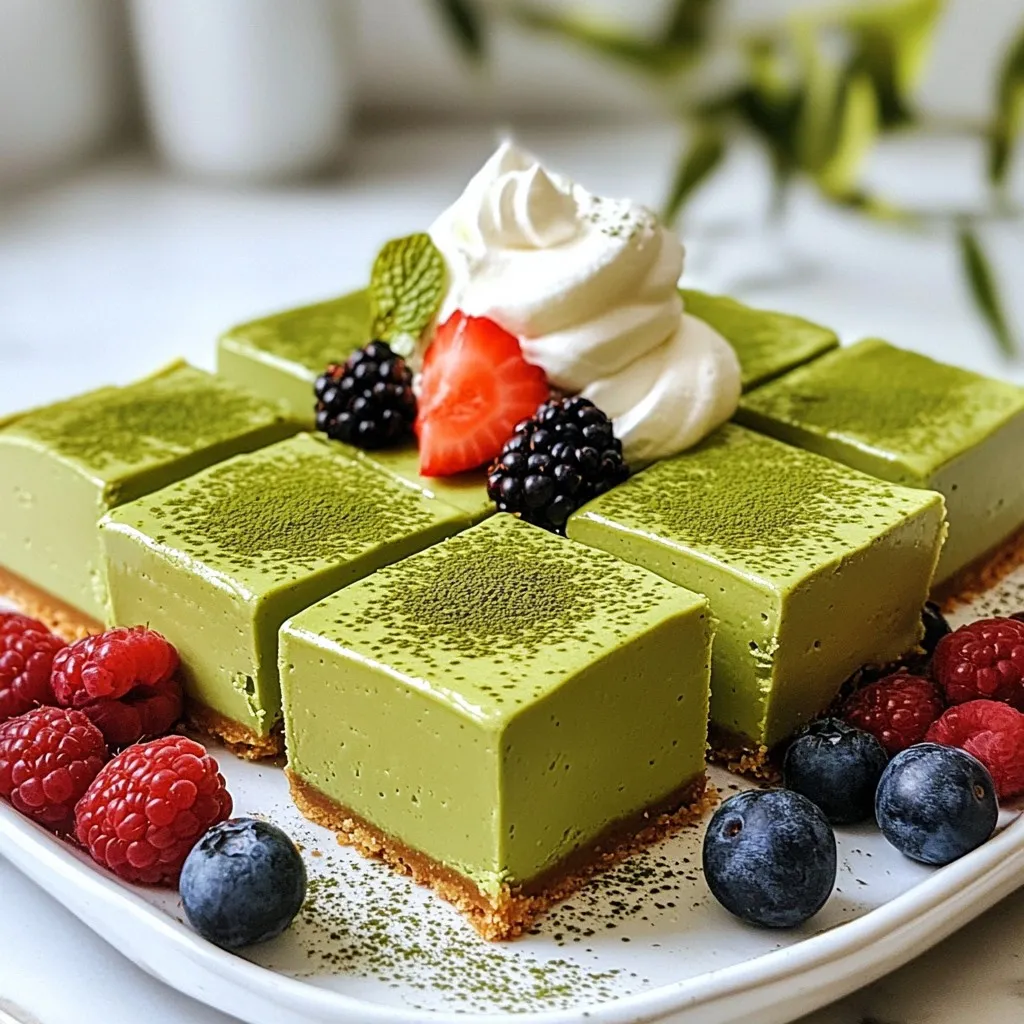 Adding garnishes makes your matcha cheesecake squares even more special. A light dusting of matcha powder on top looks beautiful. Fresh berries add color and freshness. I love how they contrast with the creamy filling.