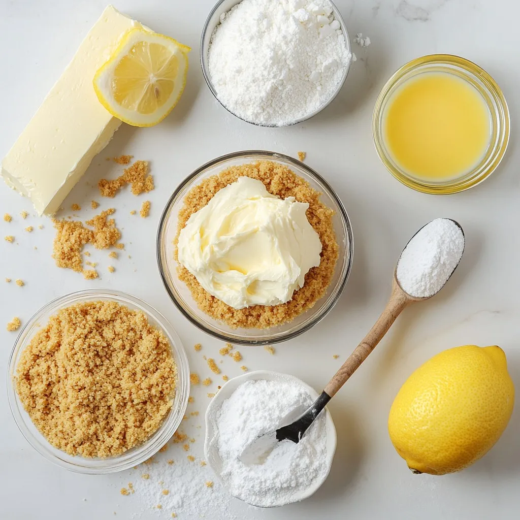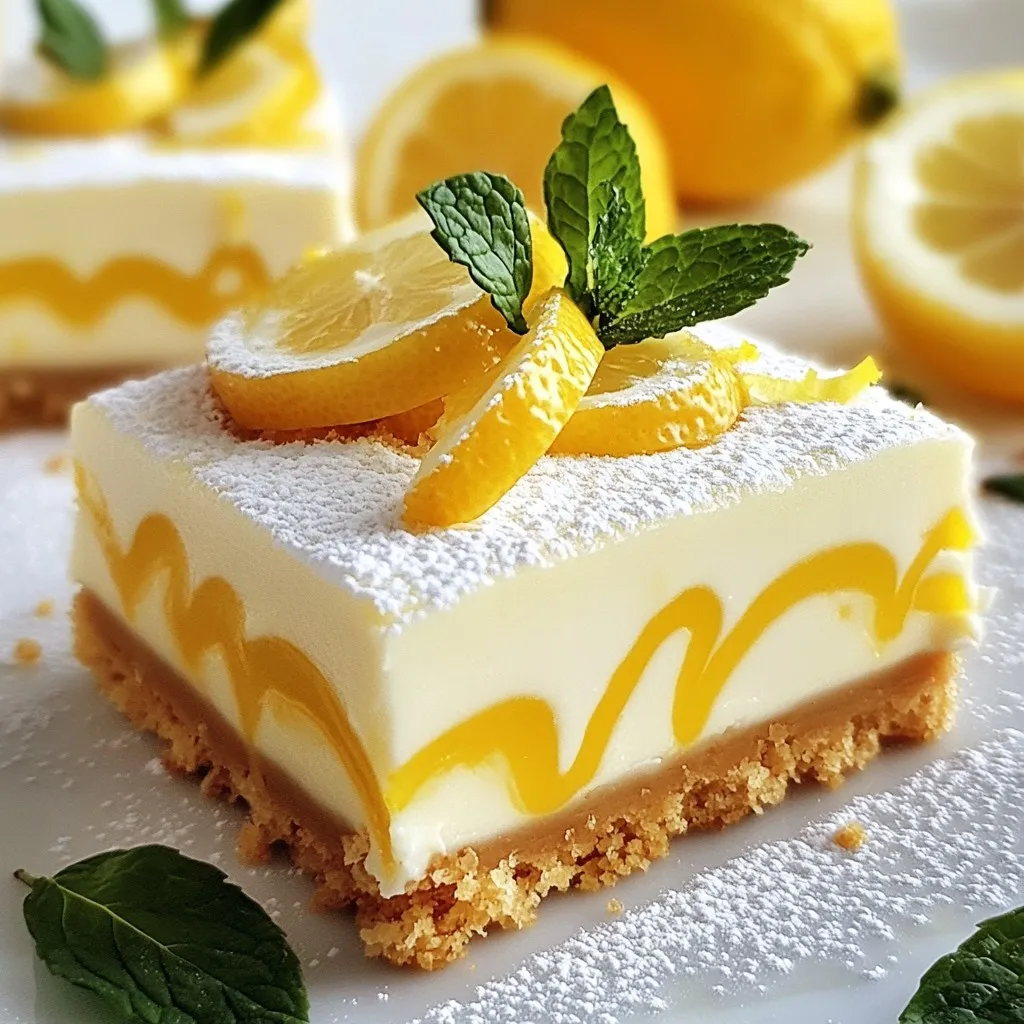 To make these no-bake lemon cheesecake bars, gather the following: - 1 Β½ cups graham cracker crumbs - Β½ cup unsalted butter, melted - 1/4 cup granulated sugar - 16 oz cream cheese, softened - 1 cup powdered sugar - 1/3 cup fresh lemon juice - Zest of 2 lemons - 1 teaspoon vanilla extract - 1 cup heavy whipping cream These ingredients work together to create a creamy and zesty treat. If you need to swap some ingredients, here are a few ideas: - Use coconut oil instead of unsalted butter for a dairy-free option. - Replace granulated sugar with honey or maple syrup for a natural sweetener. - If you don’t have fresh lemons, bottled lemon juice can work in a pinch. - For a lighter version, you can substitute low-fat cream cheese. These swaps can still yield a tasty result while fitting your needs. Fresh ingredients will make your cheesecake bars taste the best. Always use fresh lemons for juice and zest. The zest adds a bright flavor that makes the dessert pop. When picking cream cheese, choose a brand known for its creamy texture. Avoid expired products, as they can ruin the taste. Keeping your ingredients fresh ensures a delicious treat every time you make it. {{ingredient_image_1}} To start, grab a mixing bowl. Combine 1 Β½ cups of graham cracker crumbs, Β½ cup of melted unsalted butter, and ΒΌ cup of granulated sugar. Mix these ingredients well until they look like wet sand. This step is important for a great base. Next, take a lined 9x9-inch baking dish and firmly press the mixture into the bottom. Make sure it's even. Chill the crust in the fridge for 15 minutes. This helps it set up nicely. In a large mixing bowl, beat 16 oz of softened cream cheese with an electric mixer. Mix it until it's smooth and creamy. Gradually add 1 cup of powdered sugar. Keep mixing until everything is well blended. Now, pour in β…“ cup of fresh lemon juice, the zest from 2 lemons, and 1 teaspoon of vanilla extract. Mix again until it's smooth. In another bowl, whip 1 cup of heavy cream until you see stiff peaks. Carefully fold this whipped cream into your lemon mixture. Be gentle! You want it to stay light and fluffy. Now, pour the cheesecake filling over your chilled crust. Use a spatula to spread it evenly. Smooth out the top for a nice finish. Cover your dish with plastic wrap and place it in the fridge. Chill for at least 4 hours, but overnight is best. Once it's set, lift the cheesecake bars out using the parchment paper. Cut them into squares or rectangles. Serve them chilled and enjoy! If you want to impress, dust some extra powdered sugar on top and add lemon slices and fresh mint leaves for decoration. To get that creamy texture, ensure your cream cheese is very soft. You can leave it out for an hour before mixing. Whipping the heavy cream until it forms stiff peaks is key. This gives the bars a light, airy feel. When you fold the whipped cream, do it gently. This keeps the mixture fluffy. Let the bars chill for at least four hours. Leaving them overnight works best for a smooth cut. A common mistake is not chilling the crust enough. If it’s warm, the filling can make it soggy. Another error is over-mixing the cheesecake filling. Mix just until smooth to keep it light. Don’t skip the lemon zest! It adds a burst of flavor. Lastly, avoid cutting the bars too soon. They need time to set properly for the best results. For a flavor boost, try adding more lemon zest. You can also mix in some lemon extract for a stronger taste. If you like berries, fold in fresh raspberries or blueberries before chilling. They add color and extra flavor. For a fun twist, serve with a berry sauce or a sprinkle of crushed graham crackers on top. This adds texture and looks beautiful too! Pro Tips Chill the Cream Cheese: Before mixing, ensure your cream cheese is at room temperature for a smoother texture, preventing lumps in your cheesecake filling. Fresh Lemon Juice: Always opt for fresh lemon juice rather than bottled for a brighter, more vibrant flavor in your cheesecake. Whip the Cream to Stiff Peaks: Ensure your heavy cream is whipped to stiff peaks before folding it into the mixture for a light and airy cheesecake. Use a Sharp Knife: When slicing your cheesecake bars, use a sharp knife dipped in hot water for clean, precise cuts. {{image_2}} You can make these cheesecake bars gluten-free. Simply use gluten-free graham crackers. They taste just as good! Check labels to ensure they fit your needs. This small swap lets everyone enjoy the dessert. Want a twist on the lemon flavor? You can add berries! Mix in fresh raspberries or blueberries. They add a fun color and taste. You can also swap lemon juice for lime juice. This gives a different, tangy flavor that is just as tasty. Toppings can change the look and taste of your bars. Try fresh fruit like strawberries or kiwi on top. You can also drizzle chocolate sauce for a sweet touch. Dusting with powdered sugar adds a nice finish. For a fresh look, add mint leaves. These simple changes make each bite special! You can store leftover cheesecake bars in the fridge. Place the bars in an airtight container. This keeps them fresh and tasty. Make sure the container is sealed well. You can also cover the bars with plastic wrap. They will stay good for up to five days. To freeze your cheesecake bars, first let them cool completely. Cut the bars into squares or rectangles. Wrap each piece in plastic wrap. Then place them in a freezer-safe bag. Remove as much air as possible. They can last up to three months in the freezer. When you're ready to eat them, thaw them in the fridge overnight. The best time to eat these cheesecake bars is within a few days. They taste best when fresh. After about five days in the fridge, the texture may change. If you freeze them, enjoy them within three months for the best flavor. Always check for any signs of spoilage before serving. Following these tips helps you enjoy every bite of your no-bake lemon cheesecake bars! Yes, you can
