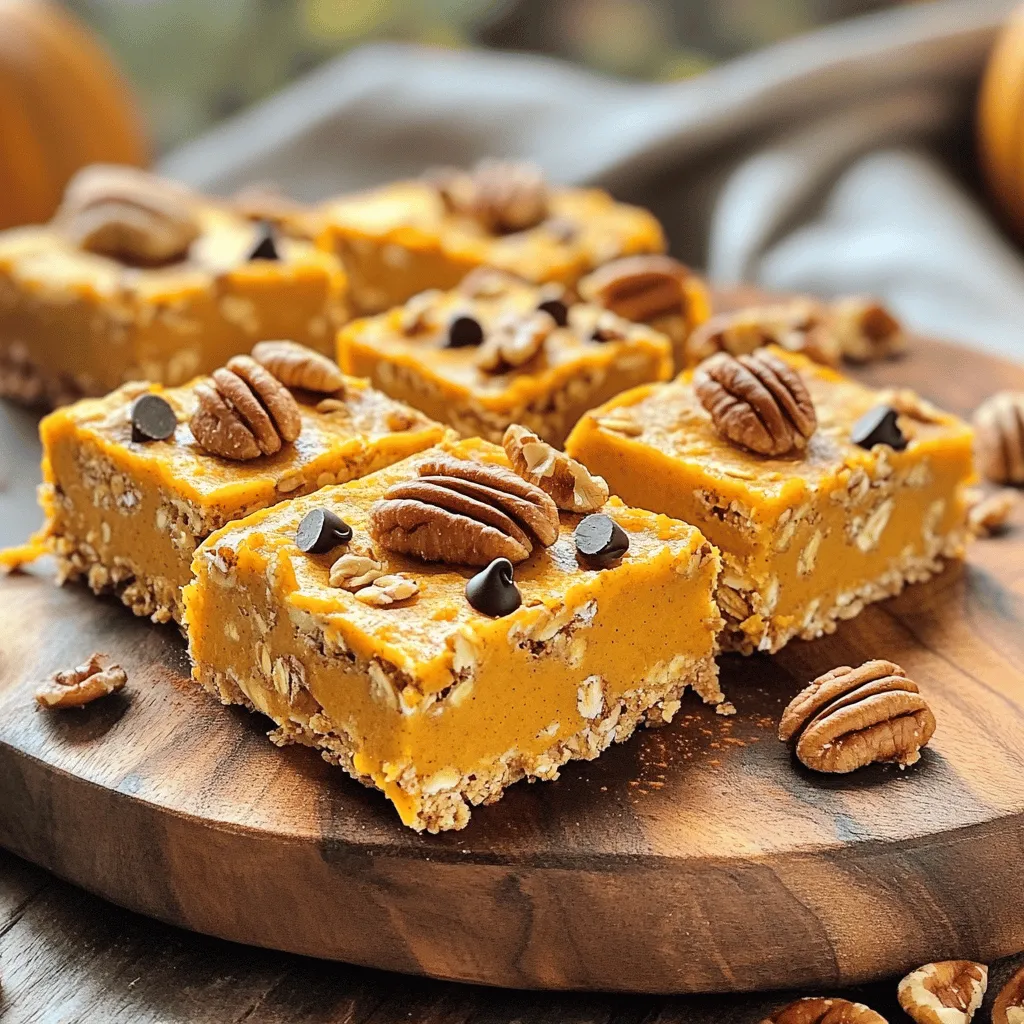 For serving, presentation matters. Place the bars on a rustic wooden platter. Add pecan halves on top for crunch. A dusting of pumpkin pie spice looks inviting. These bars pair well with a warm cup of tea or coffee. For a fun twist, serve with a dollop of yogurt or whipped cream. Enjoy them as a snack or dessert. They are great for sharing at gatherings or enjoying solo.