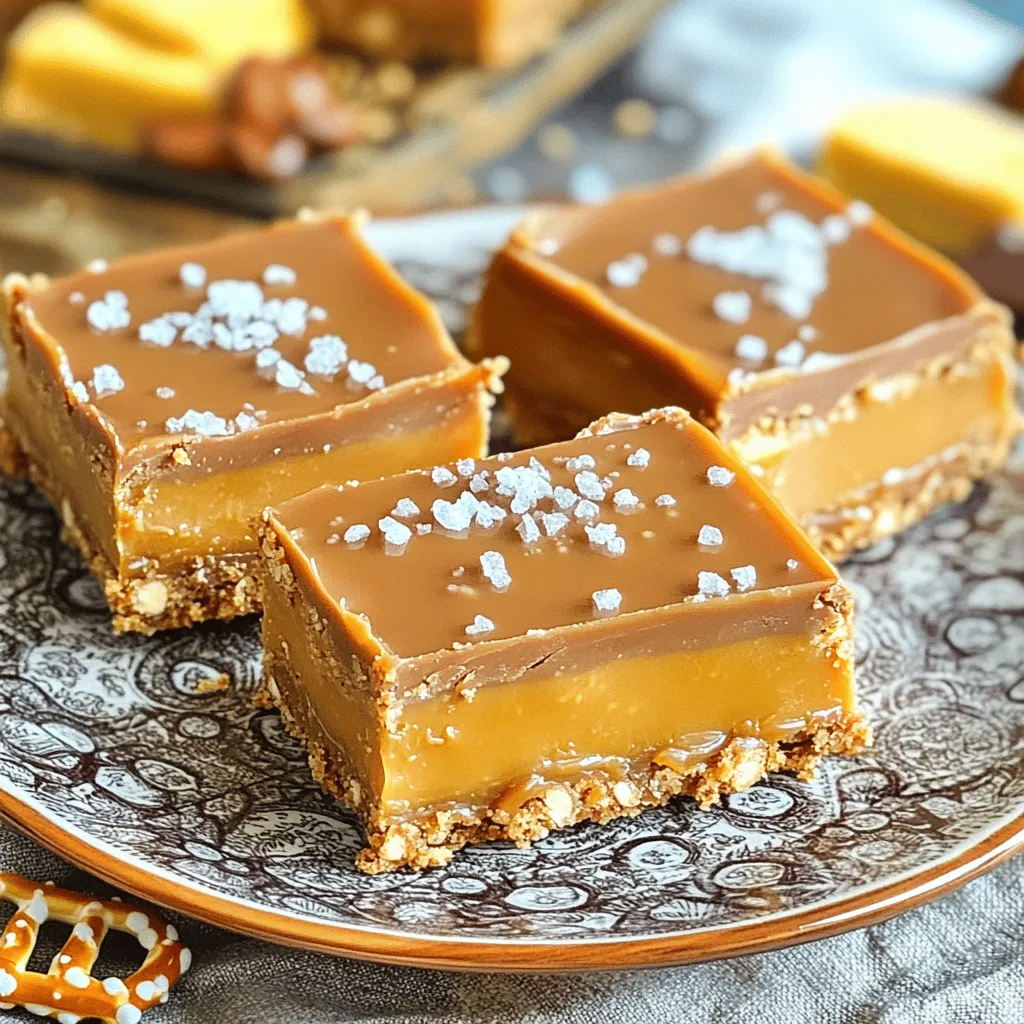 These ingredients come together to create tasty bars. The pretzel sticks bring a salty crunch, while the graham cracker crumbs add sweetness. Unsalted butter helps bind it all together. Creamy peanut butter and powdered sugar form a smooth layer that balances the rich caramel sauce. A sprinkle of sea salt adds a wonderful contrast. You can also drizzle chocolate for extra flavor.
