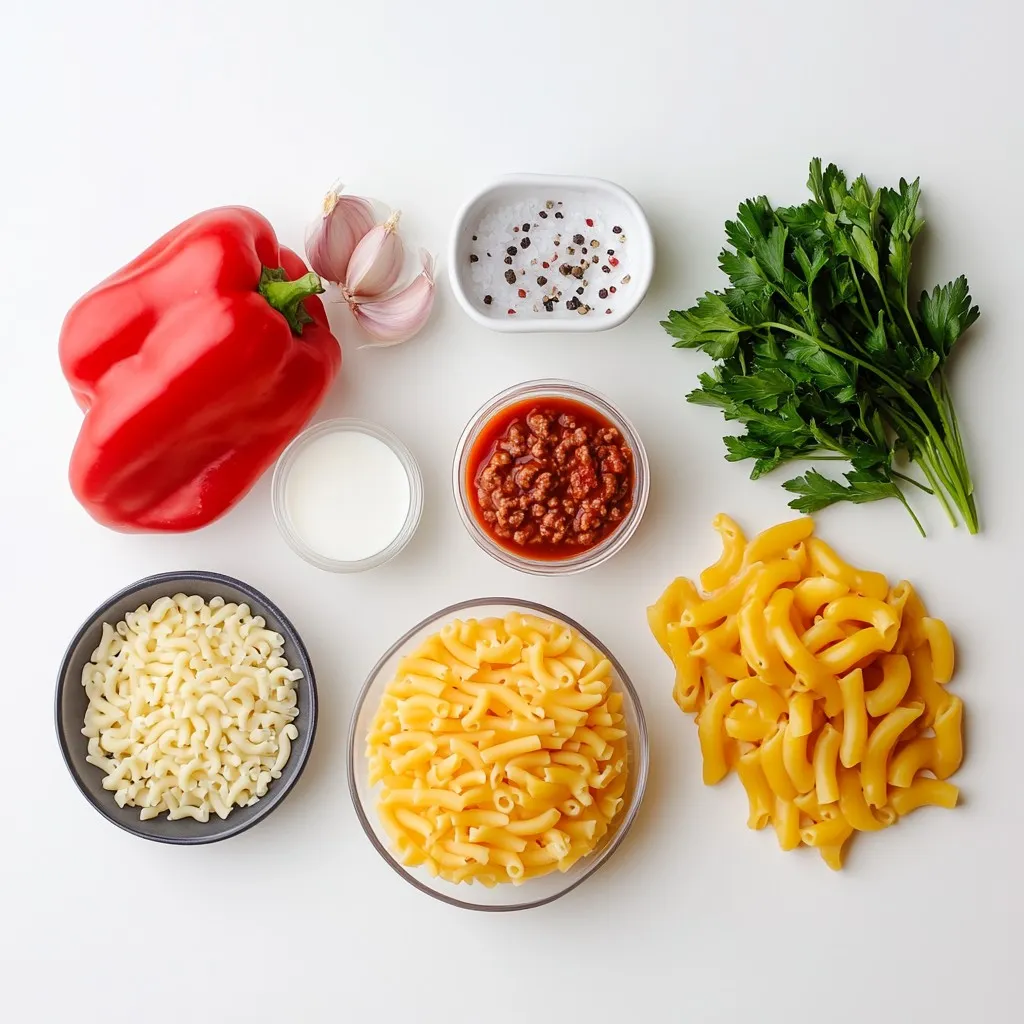 You will need one pound of ground beef. This is the main protein. A medium onion adds flavor and sweetness. Use three cloves of garlic for a nice kick. One bell pepper adds color and crunch. Worcestershire sauce gives that classic cheeseburger taste. Two cups of beef broth keep the dish rich and hearty. You will need twelve ounces of elbow macaroni for the pasta base. One cup of shredded cheddar cheese makes it creamy. One cup of milk helps blend the flavors. A tablespoon of tomato paste adds depth. Salt and pepper will enhance the taste, while paprika adds warmth. Finally, fresh parsley is great for a touch of freshness.