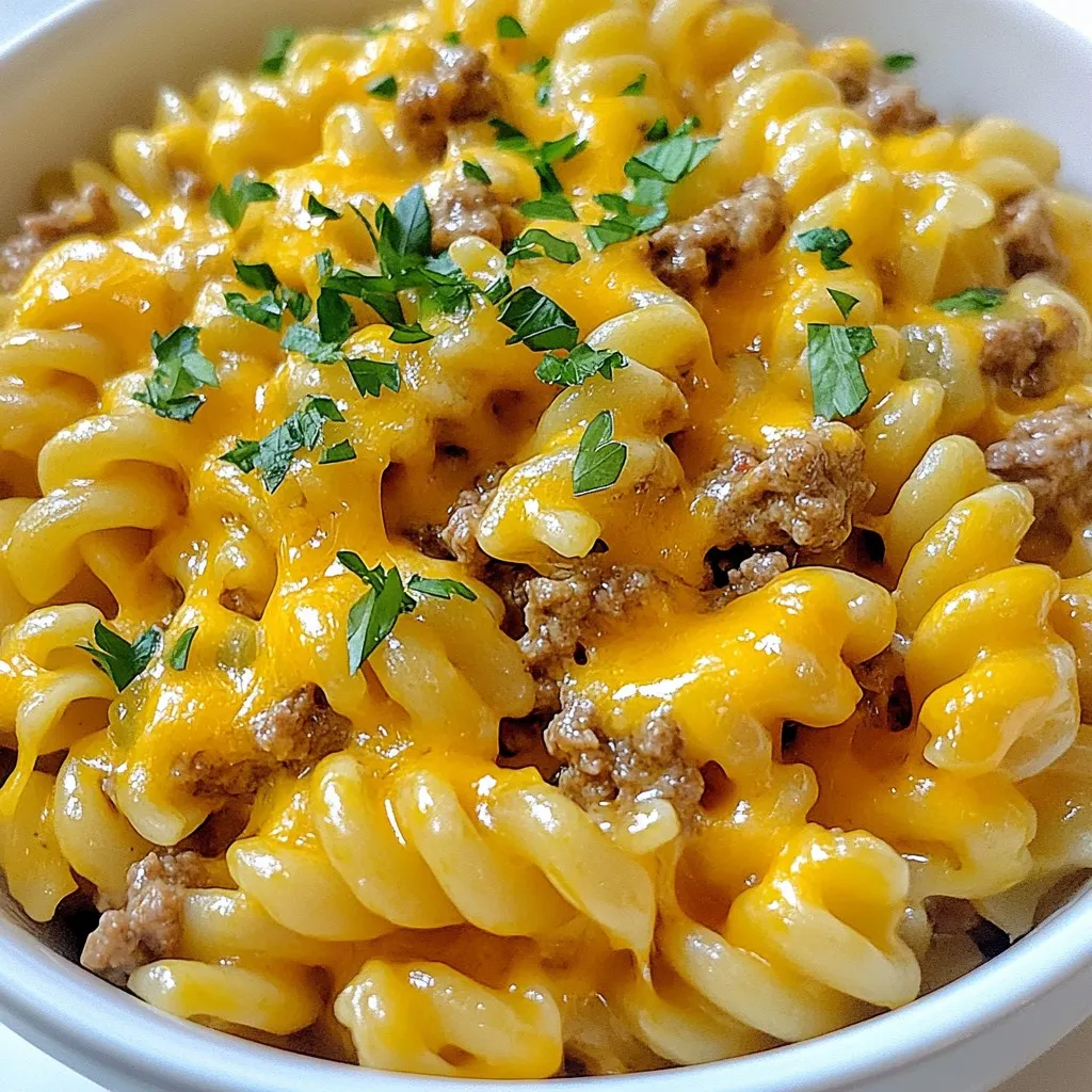 - 1 lb ground beef - 1 medium onion, diced - 3 cloves garlic, minced - 1 bell pepper, diced (any color) - 1 teaspoon Worcestershire sauce - 2 cups beef broth - 12 oz elbow macaroni - 1 cup shredded cheddar cheese - 1 cup milk - 1 tablespoon tomato paste - Salt and pepper to taste - 1 teaspoon paprika - Fresh parsley, chopped (for garnish) You will need one pound of ground beef. This is the main protein. A medium onion adds flavor and sweetness. Use three cloves of garlic for a nice kick. One bell pepper adds color and crunch. Worcestershire sauce gives that classic cheeseburger taste. Two cups of beef broth keep the dish rich and hearty. You will need twelve ounces of elbow macaroni for the pasta base. One cup of shredded cheddar cheese makes it creamy. One cup of milk helps blend the flavors. A tablespoon of tomato paste adds depth. Salt and pepper will enhance the taste, while paprika adds warmth. Finally, fresh parsley is great for a touch of freshness. To make this dish even tastier, consider adding some fun extras. Try a splash of hot sauce for heat. Chopped pickles can give a nice crunch. You can also add diced tomatoes for freshness. For a smoky flavor, smoked paprika works well. If you're a fan of spices, consider adding chili powder or cumin. Each of these ingredients can elevate your One-Pot Cheeseburger Pasta in a unique way. {{ingredient_image_1}} First, get a large pot and place it on medium heat. Add 1 lb of ground beef. Use a spatula to break it apart into small pieces. Cook for about 5 to 7 minutes. You want it to turn brown and crumbly. If there is extra fat, drain it off. This keeps the dish from being too greasy. Next, add in the diced onion, minced garlic, and bell pepper. I like to use any color bell pepper, as it adds a nice touch. Sauté these veggies for 3 to 4 minutes. This makes them soft and fragrant. Then stir in 1 teaspoon of Worcestershire sauce, 2 cups of beef broth, and 1 tablespoon of tomato paste. Sprinkle in 1 teaspoon of paprika, along with salt and pepper to taste. Mix it well, and let it simmer for a moment. Now, it’s time to add the elbow macaroni. You need 12 oz for this dish. Bring the mixture to a boil. After it boils, lower the heat to a simmer. Cover the pot and let it cook for about 10 to 12 minutes. Stir it occasionally to prevent sticking. The pasta should be tender, and most of the liquid will be absorbed. Once done, take the pot off the heat. Stir in 1 cup of milk and 1 cup of shredded cheddar cheese. Mix until it’s melted and creamy. Taste and adjust the seasoning if needed. Let it sit for a couple of minutes before serving. Garnish with chopped fresh parsley for a nice look. To get that nice creamy texture, use full-fat milk. You can also add more cheese. Stir it in slowly after cooking. Let it melt well for the best results. This makes the dish rich and smooth. If you like it spicy, add a pinch of cayenne pepper. You can also use more paprika for a smoky flavor. For milder tastes, skip the paprika or use less. Always taste as you go to find the right balance for you. Choose a large, shallow bowl for serving. This allows everyone to scoop easily. You can also use clear glass dishes to show off the colorful layers. Add some fresh parsley on top for a nice touch. It makes the dish look even more inviting! Pro Tips Choose Lean Meat: Using lean ground beef helps reduce excess fat and makes the dish lighter without compromising on flavor. Customize Your Veggies: Feel free to add or substitute your favorite vegetables like zucchini or spinach for added nutrition and color. Cheese Variations: Experiment with different cheeses such as mozzarella or pepper jack for a unique twist on the classic cheeseburger flavor. Leftovers Tip: Store any leftovers in an airtight container in the fridge for up to three days, and reheat gently on the stove with a splash of milk. {{image_2}} You can switch up the protein in this dish. Ground turkey or chicken works well. They both add a lighter taste. If you like sausage, try Italian sausage for a spicy kick. Just cook it the same way as the beef. You can also use cooked bacon for a smoky flavor. It’s all about what you enjoy! To make this dish vegetarian, you can use meat substitutes. Try lentils or plant-based ground meat. They add great texture and flavor. You can also pack in more veggies. Add mushrooms, zucchini, or spinach for extra nutrients. This option keeps the comfort of the pasta while being meat-free. If you want a different cheese, go for it! Pepper jack cheese adds a nice kick. Cream cheese makes the dish super creamy. For a lighter option, use reduced-fat cheese. Nutritional yeast is a great choice too, giving a cheesy flavor without dairy. Choose what suits your taste! To keep your One-Pot Cheeseburger Pasta fresh, first let it cool. Then, place it in an airtight container. Store it in the fridge for up to three days. If you want to enjoy it later, use a freezer-safe container. This way, it can last for up to three months. Just make sure to label the container with the date. When you're ready to eat, take the pasta out of the fridge or freezer. If frozen, let it thaw in the fridge overnight. To reheat, place the pasta in a pot over medium heat. Add a splash of milk to help it stay creamy. Stir it often until it's hot, about 5-7 minutes. You can also use the microwave. Heat it in a microwave-safe bowl for about 2-3 minutes. Stir halfway through to heat evenly. Freezing One-Pot Cheeseburger Pasta is simple. Portion it into smaller containers for easy meals later. Make sure to cool it down before freezing. This helps keep its taste and texture. To thaw, place it in the fridge overnight. Always reheat it thoroughly to make sure it’s safe to eat. Enjoy your tasty meal anytime! Yes, you can make One-Pot Cheeseburger Pasta ahead of time. Just cook it fully, let it cool, and store it in an airtight container. It will last in the fridge for about 3 days. When you're ready to eat, reheat it on the s