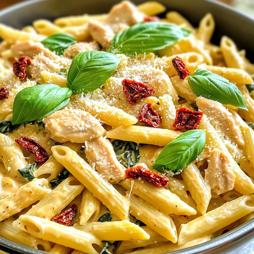 Herbs like dried basil and an Italian herb blend enhance the dish. Chicken broth helps cook the pasta and adds flavor. Penne pasta is great for soaking up the sauce. Heavy cream makes it rich and creamy. Fresh spinach adds color and nutrients. Finally, Parmesan cheese brings a salty kick. Garnish with fresh basil for a lovely finish.