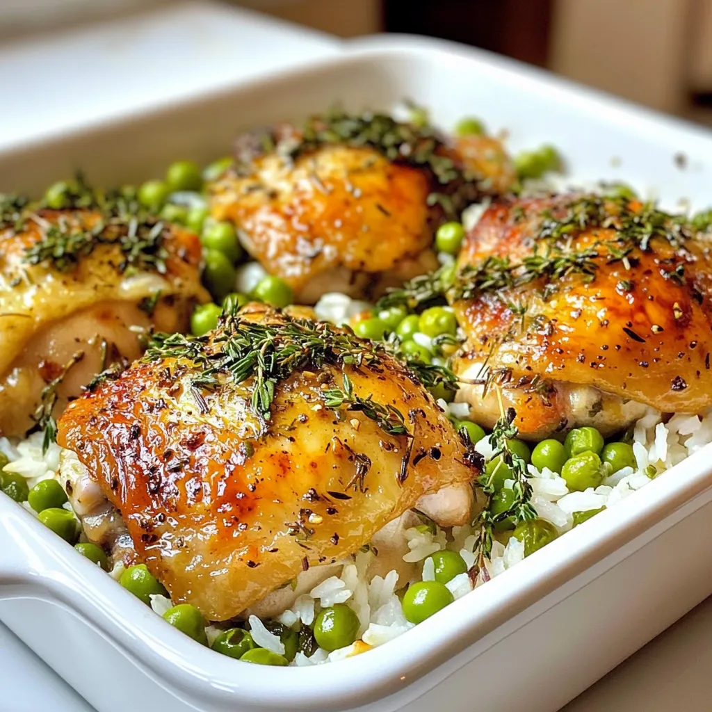- After 35 minutes, remove the foil, sprinkle the frozen peas over the dish, and return to the oven uncovered. Bake for an additional 15 minutes, or until the chicken skin is golden brown and the internal temperature of the chicken reaches 165Β°F (74Β°C).