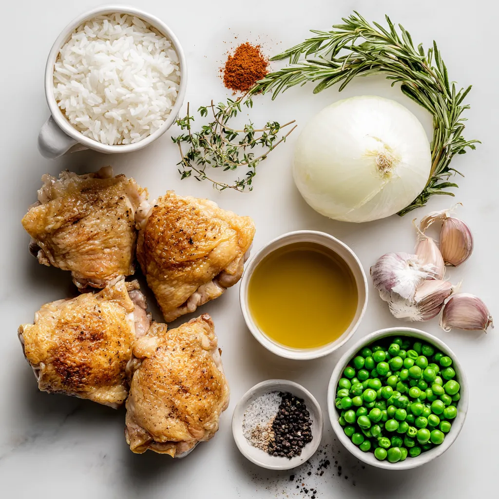 To make this oven-baked chicken and rice, you need a few key ingredients. First, we use bone-in, skin-on chicken thighs. The skin adds crispiness, and the bones keep the meat juicy. Next, jasmine rice gives a nice aroma and taste to the dish.