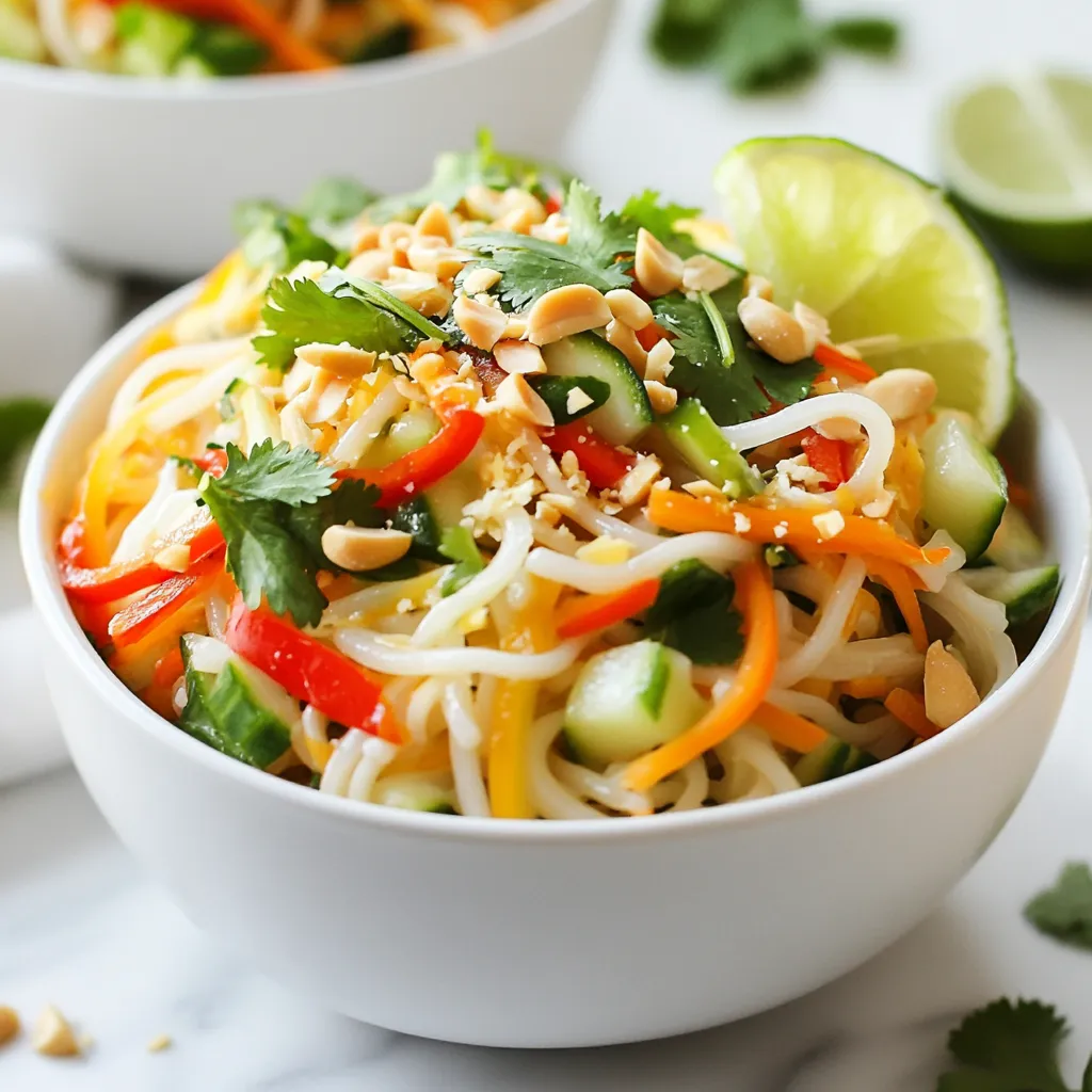 - 8 oz rice noodles - 1 cup red bell pepper, julienned - 1 cup cucumber, julienned - 1 cup carrots, shredded - 1/2 cup green onions, chopped - 1/4 cup fresh cilantro, chopped - 1/4 cup peanuts, chopped (plus more for garnish) - 1/4 cup creamy peanut butter - 3 tablespoons soy sauce - 2 tablespoons lime juice - 1 tablespoon sesame oil - 1 tablespoon honey (or agave syrup for a vegan option) - 1 teaspoon ginger, grated - 1 clove garlic, minced - Salt and pepper to taste These ingredients create a fresh and tasty salad. Rice noodles serve as the base. They soak up the flavors of the peanut sauce well. The colorful veggies add crunch and nutrition. Red bell peppers, cucumbers, and carrots bring bright colors. Green onions and cilantro add a fresh taste. The peanut sauce is key to this dish. It blends creamy peanut butter with soy sauce and lime juice. Honey adds a touch of sweetness. Ginger and garlic infuse depth and warmth. You can adjust the flavors to your liking. Add more lime for tartness or extra peanuts for crunch. This salad is perfect for a light meal or side dish. {{ingredient_image_1}} - Boiling & Timing Tips: Start by boiling a large pot of water. Once it's bubbling, add 8 oz of rice noodles. Cook them for 5-7 minutes, or until they are al dente. Keep an eye on them, as overcooking can make them mushy. - Rinsing Techniques: After cooking, drain the noodles in a colander. Rinse them under cold water for a few seconds. This stops the cooking and keeps them from sticking together. Set them aside while you prep the other ingredients. - Cutting Techniques for Uniformity: While the noodles cook, you can chop the veggies. Julienne 1 cup of red bell pepper and 1 cup of cucumber. Shred 1 cup of carrots. Chop 1/2 cup of green onions and 1/4 cup of fresh cilantro. This will make your salad look nice and even. - Vegetable Substitutions: If you don’t have some veggies, you can swap them out. Try using snap peas or cabbage instead of cucumbers. The goal is to keep the crunch and color. - Achieving the Perfect Consistency: In a medium bowl, add 1/4 cup of creamy peanut butter, 3 tablespoons of soy sauce, 2 tablespoons of lime juice, 1 tablespoon of sesame oil, 1 tablespoon of honey, 1 teaspoon of grated ginger, and 1 clove of minced garlic. Whisk everything until it’s smooth. If it’s too thick, add a little water to thin it out. - Alternative Sauce Ingredients: If you want to switch it up, use almond butter instead of peanut butter. You can also try adding a dash of chili sauce for some heat. - Mixing Techniques: In a large mixing bowl, combine the cooked rice noodles with your prepared veggies: red bell pepper, cucumber, carrots, green onions, and cilantro. - Ensuring Even Distribution: Pour the peanut sauce over the noodle and veggie mix. Gently toss everything together. Make sure all the noodles and veggies get coated with the sauce for the best flavor. - Adjusting Flavor Profiles: Taste your salad and add salt and pepper as needed. You can also squeeze in more lime juice if you want it tangier. - Presentation Techniques: Serve the salad in a large bowl or individual plates. For a pretty touch, sprinkle chopped peanuts on top. Add lime wedges and extra cilantro for a fresh look. If you want more crunch, consider adding toasted sesame seeds. - Make-Ahead Component Tips: You can make the peanut sauce a day in advance. Store it in the fridge. This saves time on busy days. Prepare the veggies and noodles ahead too. Keep them separate until you are ready to serve. This helps keep everything fresh and crunchy. - Storage Strategies: If you have leftovers, store them in an airtight container. This keeps the salad fresh for about two days. Avoid adding peanuts until you serve. This way, they stay crunchy and tasty. - Suggested Additional Spices: Add a dash of red pepper flakes for some heat. You can also try sesame seeds for a nutty taste. A pinch of salt can enhance the overall flavor too. - Using Fresh Herbs for Improved Taste: Fresh herbs make a big difference. You can use mint, basil, or more cilantro. Just chop them finely and mix them in for a fresh burst. - Vegan and Gluten-Free Options: To make this salad vegan, use agave syrup instead of honey. Check the soy sauce for gluten-free brands. This way, everyone can enjoy this dish. - Substitutions for Allergies: If you have nut allergies, use sunflower seed butter. It gives a creamy texture without nuts. You can also leave out the peanuts for a safe option. Pro Tips Fresh Ingredients: Use fresh veggies for the best flavor and crunch. The vibrant colors also enhance the visual appeal of your salad. Perfectly Cooked Noodles: Make sure not to overcook the rice noodles; they should be al dente. Rinsing them in cold water stops the cooking process and keeps them from becoming mushy. Adjusting the Sauce: If the peanut sauce is too thick, add a teaspoon of warm water at a time until you reach your desired consistency. This will help it coat the noodles evenly. Meal Prep Friendly: This salad can be made ahead of time! Store the salad and the dressing separately in the refrigerator, and combine just before serving to keep it fresh. {{image_2}} You can boost your Peanut Lime Noodle Salad by adding protein. Chicken, tofu, or shrimp works great. Each option adds flavor and makes the meal more filling. - Chicken: Cook bite-sized pieces in a pan until golden brown. This takes about 5-7 minutes. - Tofu: Press and cube firm tofu. Sauté it until crispy on all sides. This takes about 8-10 minutes. - Shrimp: Use peeled and deveined shrimp. Sauté until pink and firm, about 3-4 minutes. Make sure to cook your protein separately before adding it to the salad. This keeps the flavors fresh and tasty. You can switch the rice noodles for whole wheat or zucchini noodles. Each choice changes the salad's texture and nutrition. - Whole Wheat Noodles: They have a nutty flavor. Cook them according to the package instructions, which usually takes 8-10 minutes. - Zucchin