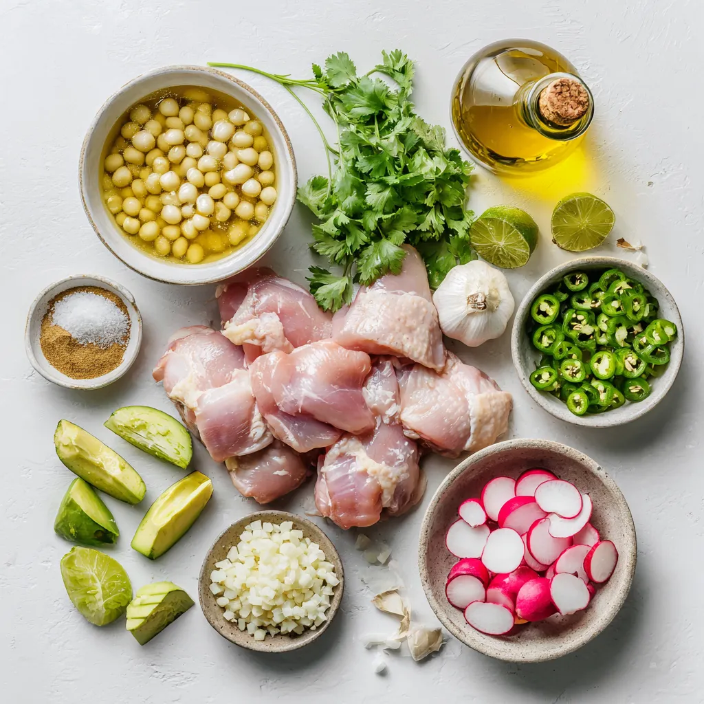 When you make Pozole Verde Chicken, you need simple and fresh ingredients. Start with the main ingredients. Chicken thighs give great flavor and are tender. You can use either canned or dried hominy. Hominy adds a chewy texture that is so nice.
