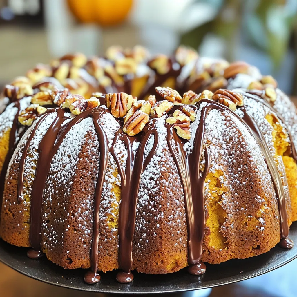 To make a delicious Pumpkin Chocolate Chip Bundt Cake, you need a few key ingredients. These ingredients work together to create a moist and flavorful cake that is perfect for fall. - 2 cups pumpkin puree - 1 cup granulated sugar - 1 cup brown sugar, packed - 1 cup vegetable oil - 4 large eggs - 3 cups all-purpose flour - 2 teaspoons baking soda - 1 teaspoon baking powder - 1 teaspoon salt - 2 teaspoons ground cinnamon - 1 teaspoon ground nutmeg - 1 teaspoon ground ginger - 1 teaspoon vanilla extract - 1 cup semi-sweet chocolate chips - 1/2 cup chopped pecans (optional) Pumpkin puree is the star of this cake. It gives the cake its lovely orange color and rich flavor. Using both granulated and brown sugar helps create a sweet and moist texture. Vegetable oil keeps the cake tender and helps it rise. Eggs are key to binding the ingredients together. They also add moisture and richness. The dry ingredients, like flour, baking soda, and baking powder, give structure to the cake. Spices like cinnamon, nutmeg, and ginger add warmth and aroma. Finally, the chocolate chips bring a sweet surprise in every bite. If you love nuts, feel free to add chopped pecans for extra crunch. These ingredients all work together to create a delightful fall treat that everyone will enjoy. Start by preheating your oven to 350°F (175°C). This step warms the oven evenly and helps the cake rise. Next, grease and flour your Bundt pan generously. I like to use cooking spray and then add flour. This method helps the cake slide out easily. Proper preparation is key. If the pan is not greased well, the cake may stick. In a large mixing bowl, combine 2 cups of pumpkin puree, 1 cup of granulated sugar, 1 cup of brown sugar, and 1 cup of vegetable oil. Mix these ingredients well until smooth. This blend gives the cake its rich flavor and moist texture. Next, add 4 large eggs one at a time. Whisk well after each egg. Stir in 1 teaspoon of vanilla extract. This adds a nice depth of flavor to the batter. In a separate bowl, whisk together 3 cups of all-purpose flour, 2 teaspoons of baking soda, 1 teaspoon of baking powder, 1 teaspoon of salt, and your spices. Use 2 teaspoons of ground cinnamon, 1 teaspoon of ground nutmeg, and 1 teaspoon of ground ginger. These spices give the cake its warm, fall flavor. Gradually add the dry mixture to the wet ingredients. Stir gently until just combined. Be careful not to over-mix, as this can make the cake tough. Pour the batter into your prepared Bundt pan. Smooth the top with a spatula for an even bake. Bake in the preheated oven for 55 to 65 minutes. Check for doneness by inserting a toothpick in the center. If it comes out clean, the cake is ready. Once baked, remove the cake from the oven. Let it cool in the pan for 15 to 20 minutes. Then, transfer it to a wire rack to cool completely. This cooling step helps set the cake's texture. - Avoiding over-mixing: When you mix the batter, do it gently. Over-mixing can make the cake tough. Stir until just combined. This keeps the cake soft and fluffy. - Baking at the right temperature: Set your oven to 350°F (175°C). An accurate temperature helps the cake bake evenly. Use an oven thermometer to check if needed. - Dusting with powdered sugar: Once the cake cools, sprinkle powdered sugar on top. This adds a sweet touch and looks nice. - Using melted chocolate and pecans for an elegant presentation: Drizzle melted chocolate over the cake for a rich flavor. Add chopped pecans on top for crunch. This makes the cake not only tasty but also pretty. - Over-greasing the pan: Use just enough grease to coat the pan. Too much can make the cake greasy and affect the texture. - Not letting the cake cool properly: After baking, let the cake sit for 15-20 minutes. This helps it firm up and makes it easier to remove from the pan. If you take it out too soon, it might break. {{image_2}} To make this cake gluten-free, you can use almond flour or a gluten-free blend. Both options work well and keep the cake moist. If using a gluten-free mix, check the label for xanthan gum. This helps bind the ingredients together. You may need to bake the cake a bit longer, so check for doneness at 65-70 minutes. To create a vegan version, replace the eggs with flax eggs. Mix one tablespoon of ground flaxseed with three tablespoons of water. Let it sit for five minutes to thicken. For the dairy, use almond milk or coconut milk instead of regular milk. Make sure the chocolate chips are dairy-free too. This way, everyone can enjoy a slice! You can give the cake a new twist by adding nuts or dried fruits. Chopped walnuts or pecans add crunch. Dried cranberries or raisins bring a sweet burst. To enhance the flavor, consider adding a pinch of cloves or allspice. They pair well with the warm spices and give the cake a cozy taste. Mixing these elements makes your Bundt cake unique and fun! To keep your leftover Pumpkin Chocolate Chip Bundt Cake fresh, you have two options. You can store it at room temperature or in the fridge. If you choose room temperature, make sure to cover it well. Use plastic wrap or foil to keep it moist. It can last about three days this way. If you want to keep it longer, refrigerating is best. Place the cake in an airtight container. This helps prevent it from drying out. In the fridge, it will stay fresh for about a week. If you have more cake than you can eat, freezing is a great choice. First, let the cake cool completely. Wrap it tightly in plastic wrap. Then, place it in a freezer-safe bag or container. This helps keep out air and moisture. To enjoy the cake later, simply take it out of the freezer. Let it thaw in the fridge overnight for best results. You can also leave it on the counter for a few hours. Just remember, thawing in the fridge keeps the cake nice and moist. Enjoy your delicious treat anytime! Pumpkin Chocolate Chip Bundt Cake stays fresh for about three days at room temperature. Make sure you keep it covered. If you put it in the fridge, i