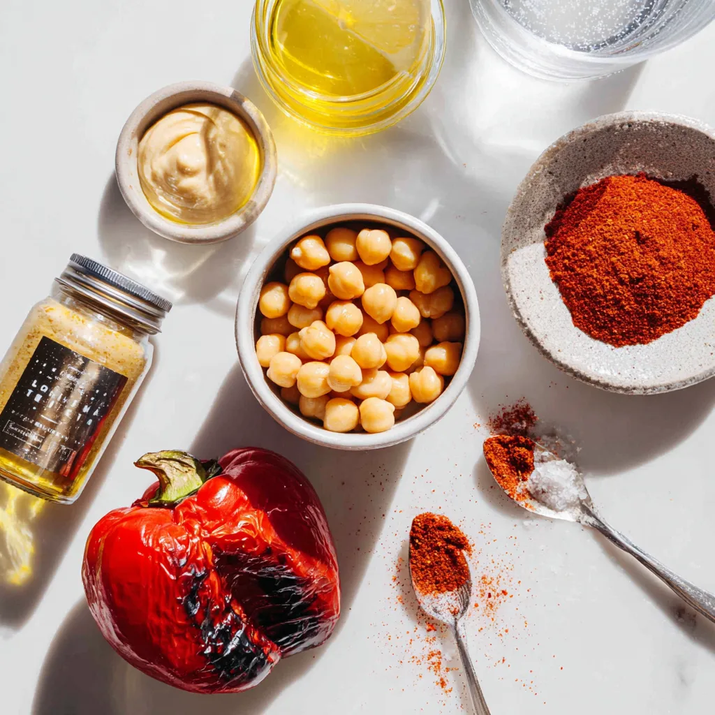 Each ingredient plays an important role in the flavor and texture of the hummus. Chickpeas give it a creamy base. The roasted red pepper adds a sweet and smoky taste. Tahini gives richness, while olive oil adds smoothness.