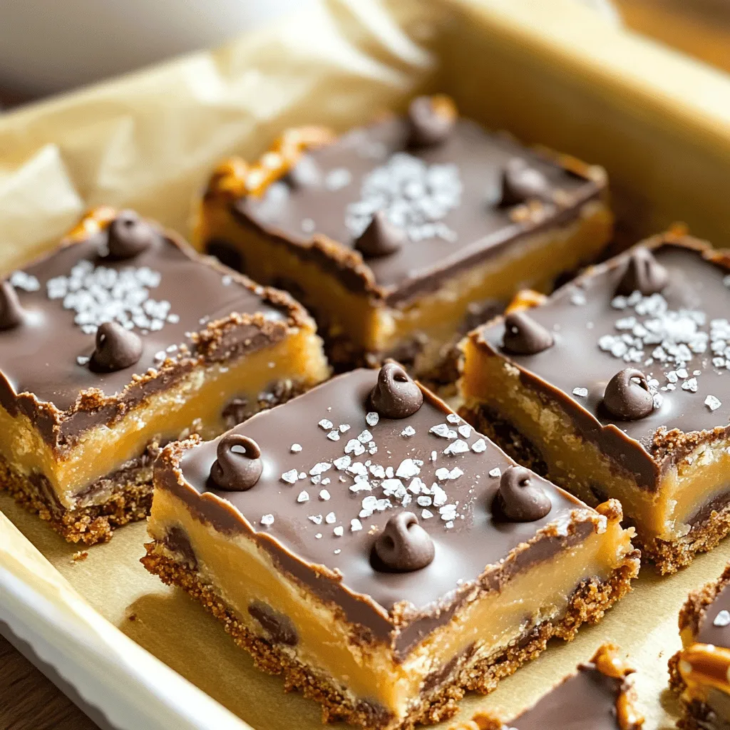 These bars are best served chilled. Cut them into squares for easy sharing. For a fun twist, add extra toppings. A sprinkle of flaky sea salt gives a nice crunch. You could also drizzle some melted chocolate on top. Serve with cold milk or coffee for a perfect treat. Enjoy your sweet and salty delight!