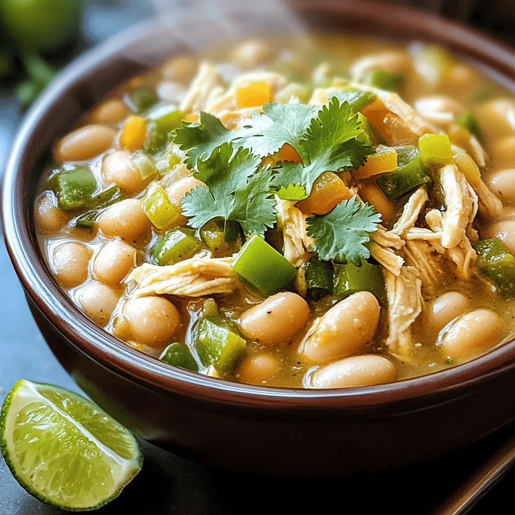 To make this cozy chili, gather these key ingredients: - 1 lb boneless, skinless chicken breasts - 2 cups cooked white beans (cannellini or great northern) - 1 medium onion, diced - 3 cloves garlic, minced - 1 green bell pepper, diced - 1 can (4 oz) diced green chilies - 1 teaspoon ground cumin - 1 teaspoon chili powder - 1/2 teaspoon smoked paprika - 1 teaspoon salt (adjust to taste) - 1/2 teaspoon black pepper - 4 cups chicken broth - Juice of 1 lime - Fresh cilantro, for garnish These ingredients work together to create a rich and flavorful chili. The beans add creaminess, while the spices give it warmth. You can make your chili even better with some tasty toppings. Here are a few ideas: - Sliced jalapeños for heat - Shredded cheese for creaminess - Avocado for a fresh touch - Sour cream for a cool contrast - Tortilla chips for crunch These toppings give your chili a fun twist. Mix and match to find your favorite combination. If you don't have some ingredients, don't worry! Here are some easy swaps: - Use rotisserie chicken instead of raw chicken for quicker prep. - Swap green bell pepper with red or yellow for sweetness. - Canned beans can replace dried beans for ease. - Vegetable broth can replace chicken broth for a vegetarian option. These substitutions keep the dish delicious while fitting your pantry. Feel free to experiment and make it your own! 1. Start with the chicken. Place the boneless, skinless chicken breasts at the bottom of the slow cooker. 2. Next, add the base ingredients. Scatter the cooked white beans, diced onion, minced garlic, and diced green bell pepper over the chicken. 3. Now, season the mix. Add the diced green chilies, cumin, chili powder, smoked paprika, salt, and black pepper. Stir the spices well to spread the flavors evenly. 4. Pour the broth. Carefully add the chicken broth over the entire mixture. Ensure everything is as submerged as possible. 5. Time to slow cook. Cover the slow cooker and choose your setting. Cook on low for 6-8 hours or on high for 3-4 hours. The chicken should be fully cooked and tender. 6. About 30 minutes before serving, remove the chicken. Use two forks to shred the chicken into bite-sized pieces. Return the shredded chicken to the pot. 7. Finish with lime. Stir in the lime juice to brighten the flavors. Taste the chili and adjust the seasoning as needed. 8. Serve hot. Ladle the chili into bowls and garnish with fresh cilantro for a pop of color and flavor. For the best taste and texture, cook your chili on low for 6 to 8 hours. If you are in a hurry, you can choose the high setting. This will take about 3 to 4 hours. Always check the chicken's doneness. It should reach an internal temperature of 165°F. To boost the flavor, try adding a bit of lime juice before serving. It brightens the dish. Fresh cilantro adds a nice touch too. You can also add more spices, like cayenne pepper, for heat. For a smoky flavor, consider using chipotle chilies. One common mistake is overcooking the chicken. It can become dry. Make sure to shred it at the right time. Another mistake is not seasoning enough. Always taste and adjust the salt and spices. Lastly, don’t skip the lime juice; it makes a big difference. {{image_2}} You can easily make this chili vegetarian or vegan. Replace the chicken with 1 cup of diced mushrooms or 1 cup of chopped zucchini. Use vegetable broth instead of chicken broth. For protein, add 2 cups of cooked lentils or more white beans. This keeps the dish hearty and filling while keeping it plant-based. You can switch up the beans for fun. Try black beans, pinto beans, or kidney beans. Each type gives a new taste and texture. If you want a creamier chili, use navy beans or great northern beans. Feel free to mix different beans for a unique flavor profile. If you like heat, add more spice! Increase the green chilies to two cans or add jalapeños. You can also stir in a teaspoon of cayenne pepper or hot sauce. This adds a great kick and makes each bite exciting. Just be careful not to overpower the other flavors. To keep your white bean chicken chili fresh, let it cool first. Once cooled, transfer the chili to an airtight container. Store it in the fridge for up to four days. Make sure to label the container with the date. This way, you won’t forget how long it has been there. If you want to save your chili for later, freezing is a great option. Use freezer-safe containers or bags. Leave some space at the top, as the chili will expand when frozen. You can keep it in the freezer for up to three months. When you’re ready to eat, just thaw it in the fridge overnight before reheating. Reheating your chili is easy! For the stovetop, pour the chili into a pot. Heat it over medium heat, stirring often until it’s hot. If you prefer the microwave, put it in a microwave-safe bowl. Cover it with a lid or plate to avoid splatters. Heat it on high for about two to three minutes. Stir halfway through to ensure even warming. Enjoy every bite of your delicious chili! Yes, you can use frozen chicken. Just place it in the slow cooker as is. Cooking time may increase by one to two hours. Always ensure the chicken reaches a safe internal temperature of 165°F. This chili pairs well with several sides. You can serve it with: - Cornbread - Rice - Tortilla chips - Avocado slices - A fresh salad These options add texture and flavor to your meal. Slow Cooker White Bean Chicken Chili lasts about three to four days in the fridge. Store it in an airtight container to keep it fresh. If you notice any changes in smell or texture, it’s best to discard it. Yes, you can cook this chili on the stovetop. Start by sautéing the onion and garlic in a pot. Then, add all other ingredients, including the chicken. Bring it to a boil, then let it simmer for about 30-40 minutes. Shred the chicken before serving for the best texture. You now know the key ingredients and steps for making delicious Slow Cooker White Bean Chicken Chili. Remember to pick your t