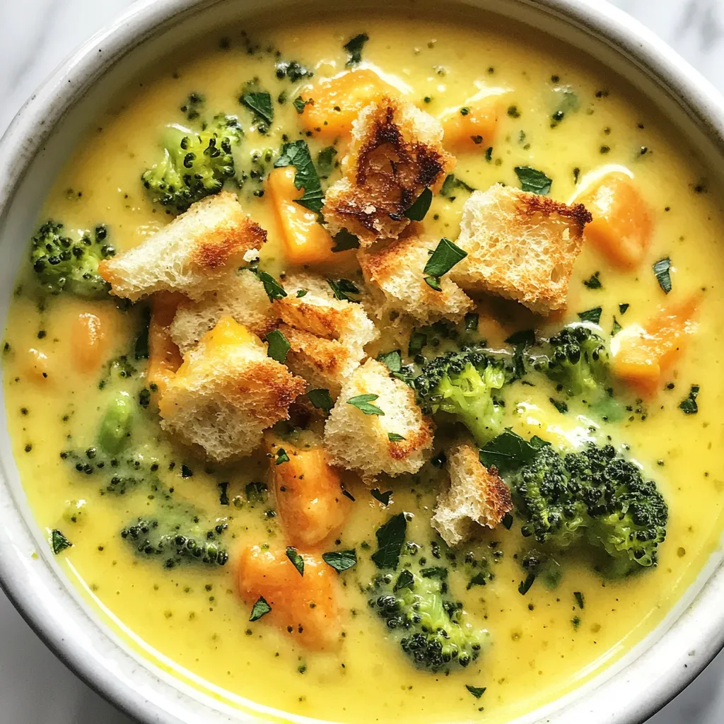 - Broccoli and Carrots You need 2 cups of fresh broccoli florets. Broccoli adds a nice crunch and flavor. Use 1 cup of diced carrots for sweetness and color. Both vegetables make this soup hearty and healthy. - Aromatics: Onion and Garlic One small onion, chopped, gives a base of flavor. Two cloves of minced garlic add depth. These two work together to create a fragrant aroma. - Broth and Cream Use 4 cups of vegetable broth. This makes the soup rich and savory. Add 1 cup of heavy cream for creaminess. It helps create that smooth texture. - Cheese Selection The star of the show is 2 cups of sharp cheddar cheese, shredded. It melts well and gives a bold taste. You can experiment with other cheeses, but cheddar is classic. - Croutons Croutons add crunch to your warm soup. You can buy them or make your own for a fresh touch. - Fresh Herbs Fresh parsley is a great choice for garnish. It adds color and a hint of freshness. You can also use chives or thyme for added flavor. {{ingredient_image_1}} First, heat one tablespoon of olive oil in a large pot over medium heat. Once the oil is hot, add one small chopped onion. Sauté the onion for about 3 to 4 minutes until it turns translucent. This step builds a great flavor base. Next, add two minced cloves of garlic and one cup of diced carrots. Sauté these for another 2 to 3 minutes. You want the carrots to soften a bit but not lose their color. Now, stir in two cups of broccoli florets. Add four cups of vegetable broth and one teaspoon of dried thyme. Bring the mixture to a boil, then reduce the heat to let it simmer. Cook for about 15 minutes or until the broccoli is tender. This step allows the flavors to blend beautifully. Once the veggies are soft, it’s time to blend. If you have an immersion blender, use it directly in the pot. Blend until the soup reaches your desired creaminess. If you don't have one, carefully transfer the soup to a regular blender in batches. Blend until smooth, then return it to the pot. Now, turn the heat to low and stir in one cup of heavy cream. Mix well until combined. Slowly add two cups of shredded sharp cheddar cheese, a little at a time. Stir continuously until the cheese melts and the soup becomes creamy. Season with salt and pepper to taste. If the soup is too thick, add a bit more vegetable broth until it's just right. Serve hot and enjoy! To make your soup creamy, start with vegetable broth. It adds depth without overpowering. Use a mix of broth and cream for balance. When you add heavy cream, do it slowly. Stir constantly to blend it in well. This prevents curdling and promotes a smooth texture. For cheese melting, always use shredded cheddar. It melts better than block cheese. Add cheese slowly while stirring. This helps it melt evenly and creates that rich, creamy feel you want. Fresh herbs can boost your soup's taste. Try adding parsley or thyme for a fresh twist. You can mix in some spinach or kale too. These greens add color and nutrients. When it comes to cheese, don’t just stick to cheddar. You can mix in Gruyère or Monterey Jack. Each cheese adds a unique flavor that makes your soup stand out. If you want to prepare your soup early, you can do that! Just store it in the fridge. When you reheat, do it slowly over low heat. Stir often to keep it from sticking. If it thickens too much, add a splash of broth. For freezing, let the soup cool first. Use airtight containers for storage. It can last up to three months in the freezer. To thaw, place it in the fridge overnight before reheating. This keeps the flavors intact. Pro Tips Freshness Counts: Always use fresh broccoli for the best flavor and texture. Frozen broccoli can be used, but it may alter the final taste. Cheese Choices: For a richer flavor, consider mixing different types of cheese, such as Gruyère or Monterey Jack, with the cheddar. Texture Control: Adjust the creaminess of your soup by blending to your desired texture—smooth or chunky, it's up to you! Seasoning Tips: Taste as you go! Adjust salt and pepper to your preference, and consider adding a squeeze of lemon juice for brightness. {{image_2}} You can make this soup vegetarian by swapping chicken broth for vegetable broth. This change keeps all the flavor while making it plant-based. You can also add more vegetables like peas or bell peppers. These veggies add color and nutrients. For a low-carb option, swap the heavy cream with pureed cauliflower. This gives a creamy feel without the carbs. Also, consider using alternative cheeses like mozzarella or a dairy-free option. These changes keep it light and tasty. If you love heat, add red pepper flakes while cooking. This gives the soup a nice kick. For an even spicier version, infuse the soup with jalapeños. Just chop them finely and add them early in the cooking. This twist makes the soup exciting and full of flavor. How Long It Lasts After cooking, your broccoli cheddar soup will stay fresh in the fridge for about 3 to 5 days. Make sure to check for any off smells or changes in color before using. Storing in Airtight Containers To keep your soup fresh, place it in airtight containers. These containers help keep moisture in and bacteria out. Label the containers with the date so you can track how long they have been stored. Best Practices for Freezing You can freeze broccoli cheddar soup for up to 3 months. Allow the soup to cool completely before freezing. Pour it into freezer-safe bags or containers. Leave some space at the top, as the soup will expand when frozen. Thawing and Reheating Directions To thaw your soup, move it from the freezer to the fridge overnight. For quick thawing, place the bag in cold water. When ready to eat, reheat on the stove over low heat. Stir often to prevent sticking. If it’s too thick, add a splash of broth or water to reach your desired texture. I recommend using sharp cheddar cheese for the best flavor. Its rich taste adds depth. You can also mix in some mild cheddar for creaminess. Other great 