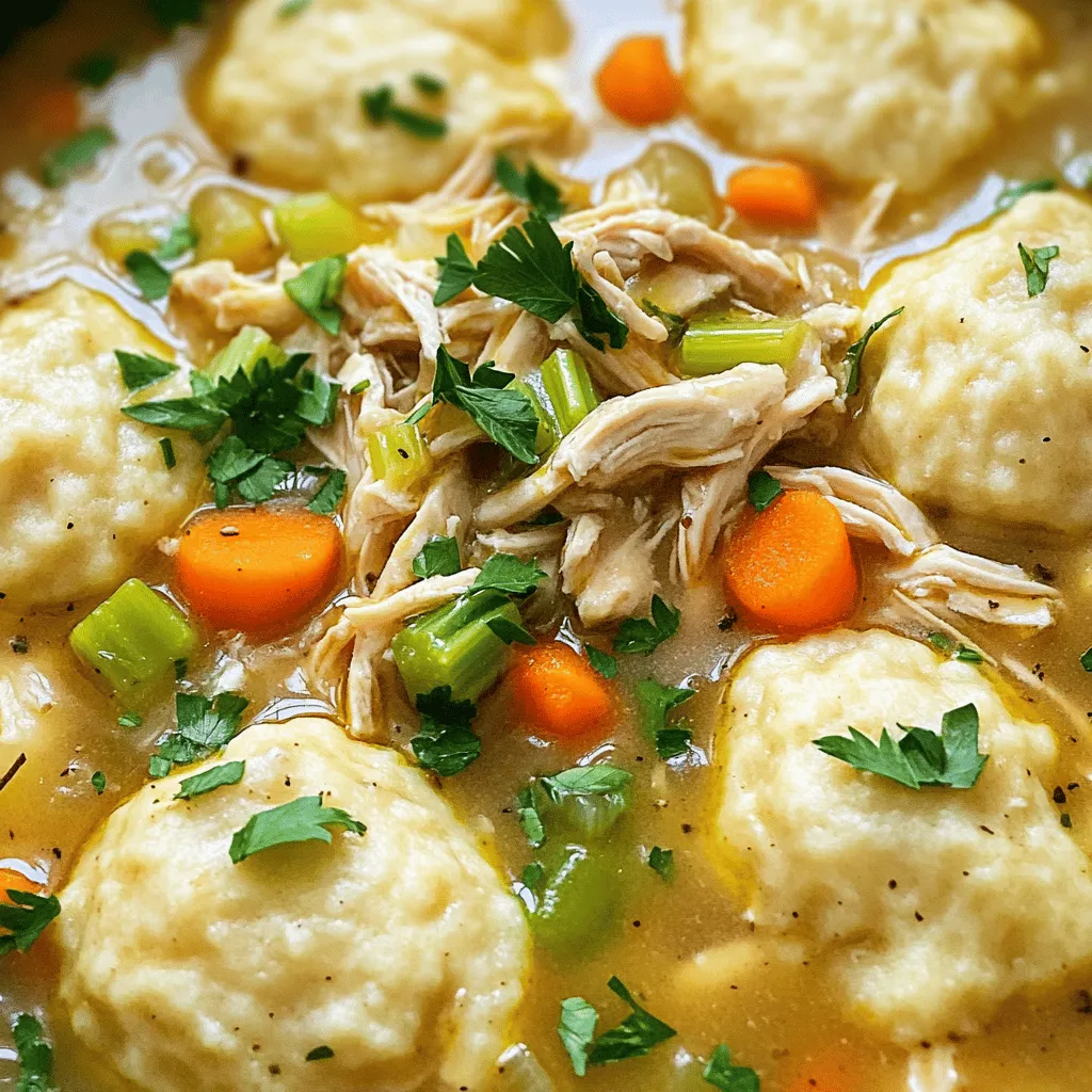 - 4 chicken thighs, skinless and boneless - 1 cup carrots, diced - 1 cup celery, diced - 1 onion, chopped - 3 cloves garlic, minced - 4 cups chicken broth For this dish, I always choose chicken thighs. They stay moist and tender. Next, I add a mix of vegetables. Diced carrots, celery, chopped onion, and minced garlic bring great flavor. The chicken broth ties it all together, giving it a rich base. - 1 teaspoon thyme - 1 teaspoon rosemary - 1 teaspoon paprika - 2 cups frozen peas - 1 can (biscuits) refrigerated biscuit dough I like to add thyme, rosemary, and paprika for warmth. These herbs enhance the chicken's flavor. Frozen peas add a pop of color and sweetness. The biscuit dough becomes fluffy dumplings, soaking up all the tasty broth. - Salt and pepper to taste - Fresh parsley for garnish At the end, I season with salt and pepper. This step ensures the dish tastes just right. I also sprinkle fresh parsley on top for a nice finish. It adds a bright touch and a bit of freshness. Layering the Chicken and Vegetables Start by placing the skinless, boneless chicken thighs at the bottom of your slow cooker. This helps them cook evenly. Next, season the chicken with salt, pepper, thyme, rosemary, and paprika. Then, add your diced carrots, celery, chopped onion, and minced garlic right on top. This layering keeps the flavors locked in. Adding Chicken Broth Pour in the chicken broth. Ensure it covers all the ingredients. This broth adds depth to the dish and keeps the chicken moist. Make sure the vegetables are fully submerged for the best flavor. Cooking Times for Low and High Settings Cover the slow cooker with the lid. If you cook on low, set it for 6 to 7 hours. For high, set it for 3 to 4 hours. The chicken should be fully cooked and tender when done. Shredding Chicken and Adding Peas After cooking, carefully remove the chicken thighs. Use two forks to shred them into bite-sized pieces. Return the shredded chicken to the slow cooker. Next, stir in the frozen peas. Allow them to cook for an additional 10 minutes, adding a pop of color and sweetness. Cutting and Adding Biscuit Dough While the chicken and peas cook, take your refrigerated biscuit dough. Cut each biscuit into quarters. Carefully drop these pieces onto the top of the mixture in the slow cooker. Space them evenly for even cooking. Cooking Dumplings in the Slow Cooker Cover the slow cooker again. Cook the dumplings on high for 30 minutes. They should become fluffy and fully cooked. Taste and adjust the seasoning if needed, then garnish with fresh parsley before serving. Enjoy this warm, comforting dish! To get the best taste in your chicken and dumplings, season well. Use thyme, rosemary, and paprika for a rich flavor. Adjust these herbs based on your taste. You can add more thyme for a stronger herb taste. Also, try a splash of lemon juice for brightness. For tender chicken, layer the chicken thighs at the bottom. This keeps them moist as they cook. Use low heat for a longer time, about 6-7 hours. This method lets flavors blend and keeps the chicken juicy. To make fluffy dumplings, do not overwork the dough. Cut the biscuit dough into quarters and drop them gently onto the stew. Space them out so they cook evenly. Avoid dense dumplings by not pressing them down into the broth. Let them float on top. Cook them on high for 30 minutes for the best rise. If they feel too thick, check the time and add a splash of broth if needed. If your chicken is not tender, it may need more time. Cook on low for an extra hour. Check if the chicken shreds easily. For overcooked dumplings, you can fix them by adding a little broth. Stir gently to moisten them. If they are too hard, add a bit more liquid and cover for a few minutes. This can help soften them. {{image_2}} You can change the chicken thighs for chicken breasts. Breasts are leaner and cook faster. This swap will give you a lighter dish while keeping it tasty. You can also add different vegetables. Potatoes bring a nice creaminess. Corn adds sweetness and crunch. Feel free to mix and match veggies based on what you have in your kitchen. If you want to cut back on salt, try low-sodium chicken broth. It keeps the dish flavorful without the extra sodium. For a gluten-free meal, use gluten-free biscuit dough. Many brands offer this, and it works well in the slow cooker. Adding herbs can really boost the taste. Fresh parsley or dill can add a bright note. You can also try adding a pinch of red pepper flakes for a hint of heat. For a creamier dish, mix in some heavy cream or sour cream at the end. This will make the broth rich and smooth, perfect for cold days. After enjoying your slow cooker chicken and dumplings, you can store leftovers in the fridge. Place the dish in a container with a tight lid. Glass or plastic containers work well. Make sure to cool the dish before sealing it. This helps avoid moisture buildup. To freeze chicken and dumplings, let the dish cool completely. Then, use freezer-safe bags or containers. Remove as much air as possible to prevent freezer burn. When you're ready to eat, thaw in the fridge overnight. Reheat gently on the stove or in the microwave. Stir occasionally for even heating. In the fridge, your chicken and dumplings last about 3 to 4 days. If frozen, they can stay fresh for up to 3 months. Always check for signs of spoilage before eating. Look for off smells, color changes, or mold. If you notice any, it’s best to toss the dish. Yes, you can use frozen chicken in the slow cooker. However, it is best to follow some safety tips. First, ensure the chicken is fully cooked to a safe temperature of 165°F. Cooking frozen chicken may take longer than fresh chicken. Here are some quick tips: - Place frozen chicken at the bottom of the slow cooker. - Cook on high for 4-5 hours or low for 8-9 hours. - Always check the chicken's internal temperature before serving. Making dumplings from scratch is easy and fun. Here’s a simple recipe for fluffy dumplings: - In