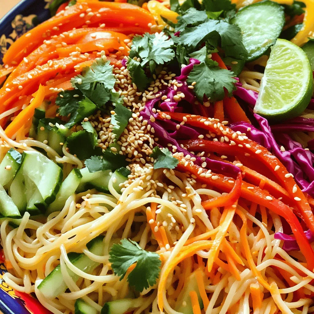 ![- 8 ounces rice noodles - 1 cup shredded carrots - 1 bell pepper (red or yellow), thinly sliced - 1 cucumber, julienned - 1 cup red cabbage, shredded - 1/4 cup scallions, chopped - 1/4 cup fresh cilantro, chopped - 1/4 cup sesame seeds (toasted) - 3 tablespoons soy sauce - 2 tablespoons sesame oil - 1 tablespoon fresh ginger, grated - 1 garlic clove, minced - 1 tablespoon honey or maple syrup - Juice of 1 lime - Pinch of red pepper flakes (optional) This salad serves four people. Each serving has about 200 calories. The macronutrient breakdown is as follows: - Carbohydrates: 30g - Protein: 5g - Fats: 8g This dish is gluten-free if you use the right soy sauce. It is also vegan-friendly. The mix of fresh veggies adds vitamins and minerals while keeping the dish light and bright. Enjoying this salad gives you a tasty way to eat healthy. For the full recipe, check out the [Full Recipe]. To start, bring water to a boil in a large pot. Use enough water to let the noodles move freely. Once the water boils, add 8 ounces of rice noodles. Cook them according to the package instructions, which usually takes about 5 to 7 minutes. When they are done, drain the noodles and rinse them under cold water. This step stops the cooking process and keeps them from getting mushy. Set the noodles aside while you prepare the vegetables. While your noodles cook, let's prep the veggies. First, shred 1 cup of carrots. Then, take 1 bell pepper, either red or yellow, and slice it thinly. For the cucumber, julienne it into thin strips. Shred 1 cup of red cabbage, then chop 1/4 cup of scallions and 1/4 cup of fresh cilantro. Keep all the veggies ready in a bowl for easy mixing later. Now, we create the dressing. In a small bowl, whisk together the following ingredients: - 3 tablespoons soy sauce - 2 tablespoons sesame oil - 1 tablespoon fresh ginger, grated - 1 garlic clove, minced - 1 tablespoon honey or maple syrup - Juice of 1 lime - Optional: A pinch of red pepper flakes for some heat Mix these well until they blend into a smooth dressing. In a large mixing bowl, add the cooked noodles. Then, toss in the prepared vegetables: shredded carrots, bell pepper, cucumber, red cabbage, scallions, and cilantro. Pour the dressing over the top. Gently toss everything together until well combined. The noodles and veggies should be coated with the dressing. For that extra crunch, toast the sesame seeds. Take a small pan and heat it over medium heat. Add 1/4 cup of sesame seeds to the pan. Stir them frequently for a few minutes until they turn golden and smell fragrant. Watch them closely, so they don't burn. Divide the noodle salad into serving bowls. Sprinkle the toasted sesame seeds on top for garnish. For a colorful touch, add extra cilantro and some lime wedges on the side. This salad looks great and tastes even better. Enjoy it as a light meal or a side dish. For the full recipe, refer back to the earlier section. To avoid mushy noodles, watch the cooking time closely. Rice noodles cook quickly. Follow the package instructions, usually around 5-7 minutes. After cooking, drain the noodles and rinse them under cold water. This stops the cooking process and keeps them firm. You can also toss them with a bit of sesame oil. This adds flavor and keeps them from sticking. Want to boost the taste? Try adding more ginger for a zing. Red pepper flakes bring heat. You could mix in sliced jalapeños or sriracha for a spicy kick. Adding crushed peanuts gives a nutty crunch. You can also use a splash of rice vinegar for a tangy twist. Fresh herbs like mint or basil can brighten the dish too. Make your salad pop with color! Use a mix of bell peppers—red, yellow, and orange. Add purple cabbage for a vibrant touch. You can also include green edamame or bright cherry tomatoes. To make it more appealing, serve in large, colorful bowls. A sprinkle of extra cilantro and lime wedges on the side adds freshness. This will make your dish look as good as it tastes! {{image_2}} You can boost your Sesame Ginger Noodle Salad with protein. Try adding cooked chicken, shrimp, or tofu. - Chicken: Grill or sauté chicken breast, then slice it thin. - Shrimp: Sauté shrimp in a bit of oil until pink and cooked through. - Tofu: Press and cube firm tofu. Pan-fry until golden for extra flavor. These additions make the salad heartier and give you more options. Feel free to swap out vegetables based on what you have. The salad is very flexible. - Zucchini: Use spiralized zucchini for a fresh twist. - Snap Peas: These add a nice crunch and sweet flavor. - Radishes: Thinly sliced, they bring a peppery bite. Using seasonal veggies can make the dish fresh and exciting. You can play with the dressing to keep it interesting. - Peanut Dressing: Add peanut butter for a rich, nutty flavor. - Spicy Variations: Include sriracha or chili paste for heat. Experimenting with the dressing can change the whole vibe of your salad. Check out the Full Recipe for more ideas! To store leftovers of your Sesame Ginger Noodle Salad, put it in an airtight container. Keep it in the fridge. Make sure it cools down before sealing it. This helps keep the flavors fresh. Use it within three days for best taste. You can freeze this noodle salad, but it may change a bit. First, leave out the fresh veggies and sesame seeds. They do not freeze well. Place the noodles and dressing in a freezer-safe bag. Squeeze out extra air before sealing. It can stay in the freezer for up to two months. When ready to eat, thaw it in the fridge. Add fresh veggies and seeds just before serving. The salad stays fresh for about three days in the fridge. After that, the veggies may lose their crunch. The dressing can last longer, but mix it with fresh ingredients before serving. Always check for any signs of spoilage before enjoying your dish again. Yes, you can make this salad ahead of time! To do this, prepare the salad up to the point of mixing in the dressing. Store the cooked noodles and vegetables in separat