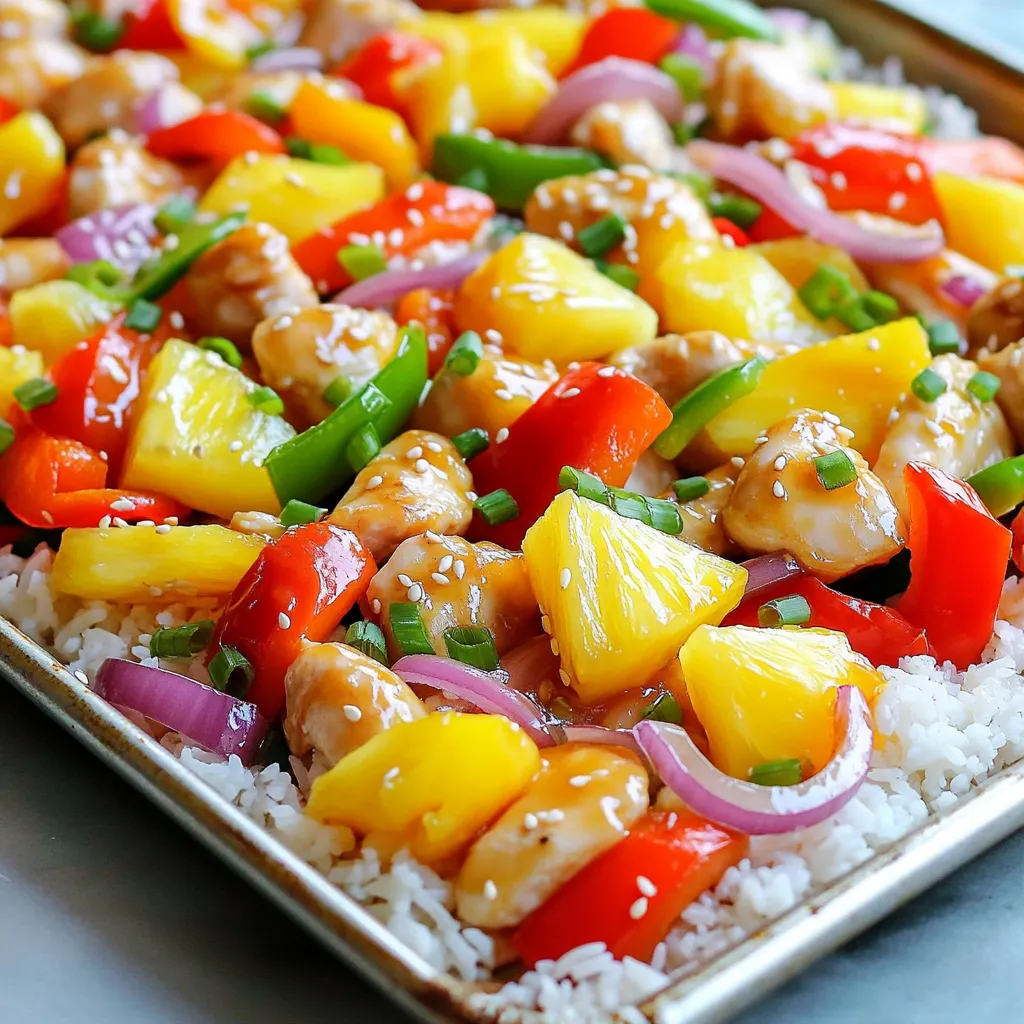 - 1 pound chicken breast, cut into bite-sized pieces - 2 cups bell peppers (red, yellow, and green), sliced - 1 cup red onion, sliced - 1 cup pineapple chunks (fresh or canned) - 3 tablespoons olive oil - 1 teaspoon garlic powder - 1 teaspoon ginger powder - Salt and pepper to taste - 1/4 cup honey - 1/4 cup apple cider vinegar - 2 tablespoons soy sauce (or tamari for gluten-free) - Cooked rice (white, brown, or cauliflower rice for a low-carb option) - Green onions, chopped (for garnish) - Sesame seeds (for garnish) The main ingredients are simple yet vibrant. The chicken gives protein, while the bell peppers add crunch and color. Red onions offer a sweet bite, and pineapple gives a juicy burst of flavor. For seasonings, olive oil helps everything cook evenly. Garlic and ginger powders bring warmth and depth. Honey adds sweetness, while apple cider vinegar gives a zing. Soy sauce ties all the flavors together. I like serving this dish over rice. It soaks up the sauce well and makes each bite satisfying. Green onions and sesame seeds on top provide a nice finish. They add color and a little crunch. Don’t hesitate to mix up the veggies. You can use broccoli or snap peas too. This recipe is all about bright flavors and fun colors! - Preheat the oven to 425°F (220°C). - Spread chicken pieces, bell peppers, red onion, and pineapple on the sheet pan. I find that starting with a hot oven helps cook the chicken and veggies just right. This heat locks in flavors and keeps things juicy. - Drizzle olive oil, sprinkle seasonings, and toss everything together. Using your hands is the best way to mix. Feel the ingredients combine as you coat them in oil and spices. This helps every bite burst with flavor. - Whisk together sauce ingredients, pour over the mixture, and bake for 20-25 minutes. - Stir halfway through baking for even cooking. The sauce adds a sweet and tangy touch. Stirring halfway makes sure everything cooks evenly. You want the chicken tender and the veggies crisp. - Prepare rice and serve over bowls with chicken and vegetable mix. - Garnish with green onions and sesame seeds. The rice is a perfect base for this dish. It soaks up the sauce nicely. Don’t forget the green onions and sesame seeds. They add color and crunch to each bowl! - Ensure even layering of ingredients on the sheet pan for optimal cooking. This helps everything cook at the same rate. - Use a meat thermometer to check that chicken reaches 165°F for safety. This step keeps your meal safe and tasty. - Use mismatched bowls for a colorful presentation. Different sizes and colors make your meal pop. - Arrange rice in a mound topped with chicken and veggies for visual appeal. This creates a beautiful and inviting dish. - Adjust sweetness by varying the amount of honey. More honey means a sweeter dish, while less gives it a tangier taste. - Experiment with different vegetables or add crushed red pepper for heat. This can change the whole flavor profile and make it your own. {{image_2}} You can switch the chicken for tofu to make a great vegetarian meal. Tofu soaks up flavors well, giving you a tasty dish. For a different twist, consider using shrimp or pork. Shrimp cooks fast and adds a nice touch, while pork gives a hearty flavor. Using fresh, seasonal veggies can really lift the dish. Zucchini and asparagus add bright colors and crunch. You can also swap in fruits like mango or peach for a sweet change. These fruits bring a fun twist to your bowls and balance the savory flavors. If you need to avoid gluten, choose gluten-free soy sauce or tamari. It works just as well in this recipe. For a low-carb option, try using cauliflower rice instead of regular rice. This swap keeps your meal light while still being filling. Store leftovers in an airtight container in the refrigerator for up to 3 days. This keeps your sweet and sour chicken fresh and tasty. When you’re ready to eat, just take it out and enjoy. Freeze portions in freezer-safe containers for up to one month. This is great for meal prep! Make sure to label the containers with the date. When you want a quick meal, you have a delicious option ready to go. Reheat in the oven for best texture, or microwave for quick serving. If you use the oven, set it to 350°F (175°C) and warm it for about 15 minutes. This way, the chicken stays juicy and the veggies keep their crunch. If you need it fast, the microwave works too. Just heat in 1-minute intervals until hot. You can prep the chicken and veggies ahead of time. Cut the chicken and slice the bell peppers and red onion. Store them in separate airtight containers in the fridge. You can also mix the sauce ingredients and keep them in a small jar. This way, when you're ready to cook, you just need to combine everything on the sheet pan. It saves time and helps you enjoy a quick meal. Yes, you can use frozen chicken or veggies. If you use frozen chicken, you should thaw it first. This helps it cook evenly. For frozen veggies, you may need to increase the cooking time by a few minutes. Just make sure everything is hot and cooked through before serving. Several side dishes go great with this meal. Here are some ideas: - A fresh green salad with a light vinaigrette. - Crunchy spring rolls for texture. - Steamed broccoli or snap peas for added color and nutrition. These sides will enhance your meal and add more flavors to your dining experience. This blog post covered everything you need for great sheet-pan sweet and sour chicken bowls. We discussed the key ingredients, step-by-step instructions, and helpful tips for cooking and presentation. You can also customize the recipe to suit your tastes. Whether you stick with chicken or try tofu, the dish is sure to please. Storing leftovers is easy too. Remember, cooking should be fun and rewarding. Enjoy making this meal with your favorite ingredients. Happy cooking!