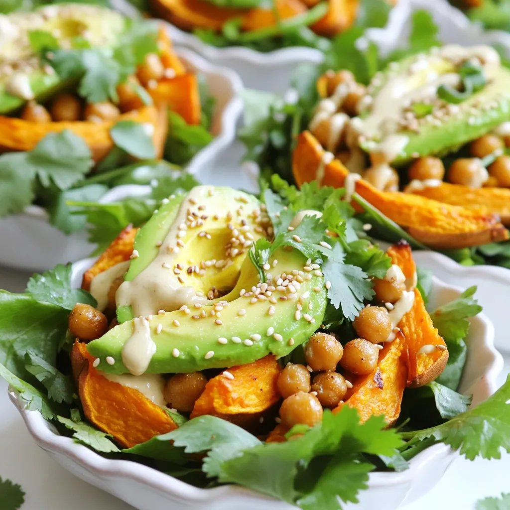 Use vibrant bowls to showcase the colors of your ingredients. Layer the greens, sweet potatoes, and chickpeas in sections. This makes the dish look inviting. Sprinkle sesame seeds and cilantro on top for added color.