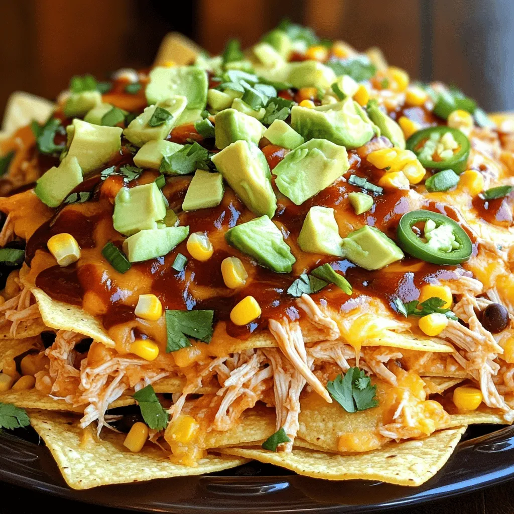 - 2 lbs boneless, skinless chicken breasts - 1 cup BBQ sauce (your choice of flavor) - 1 teaspoon garlic powder - 1 teaspoon onion powder - 1 teaspoon smoked paprika - Salt and pepper to taste - 1 bag tortilla chips - 2 cups shredded cheddar cheese - 1 cup black beans, rinsed and drained - 1 cup corn (fresh or frozen) - 1 avocado, diced - 1/4 cup green onions, chopped - Jalapeños, sliced (optional) - Sour cream, for serving (optional) If you need swaps, I have you covered. You can use chicken thighs instead of breasts. They add more flavor and stay juicy. For BBQ sauce, use a homemade blend. You can mix ketchup, vinegar, and brown sugar. This allows you to control the sweetness. If you want a vegan option, try jackfruit. It shreds similar to chicken. Swap cheese for a dairy-free version, like cashew cheese or nutritional yeast. For a crunch, use pita chips instead of tortilla chips. These nachos can fit many diets. To make them gluten-free, choose gluten-free tortilla chips. If you want a dairy-free dish, skip the cheese or use a vegan version. You can also add more veggies, like bell peppers or olives, for extra fiber. If you are watching calories, use less cheese or skip the sour cream. This way, everyone can enjoy these tasty nachos. First, gather your ingredients. You need 2 lbs of boneless, skinless chicken breasts, BBQ sauce, garlic powder, onion powder, smoked paprika, salt, and pepper. Place the chicken in the slow cooker. Sprinkle garlic powder, onion powder, smoked paprika, salt, and pepper over the chicken. Pour one cup of BBQ sauce on top. Make sure the chicken is well-coated. Cover the slow cooker. Set it to low for 6-7 hours or high for 3-4 hours. Your chicken will become tender and easy to shred. Once time is up, it’s time to shred the chicken. Use two forks to pull the chicken apart right in the slow cooker. Mix it well with the BBQ sauce. This adds flavor to every bite. Now, let’s build your nachos. Preheat your oven to 350°F (175°C). On a large baking sheet, spread half of the tortilla chips. Layer half of the shredded chicken on top. Add half of the black beans and corn. Then, sprinkle half of the cheddar cheese. Repeat these layers with the rest of the chips, chicken, beans, corn, and cheese. Bake your nachos for 10-15 minutes. You want the cheese to melt and bubble. After that, remove the nachos from the oven. Top them with diced avocado, green onions, and jalapeños if you like. Serve with sour cream on the side for dipping. Enjoy your delicious nachos! To make the chicken tasty, use good BBQ sauce. I suggest a sauce with a nice balance of sweet and tangy. The spices add depth to the flavor. Garlic powder, onion powder, and smoked paprika work wonders. Always season well with salt and pepper. Let the chicken cook long enough so it shreds easily. This enhances the flavor when mixed with BBQ sauce. For best results, cook on low heat. To keep nachos crispy, layer them properly. Start with a layer of chips, then add the chicken and toppings. Avoid adding too much sauce on top. Use thick tortilla chips; they hold up better. You can also bake the chips before adding toppings. This extra step helps them stay crunchy. Serve the nachos right away for the best texture. Serve your nachos hot and fresh from the oven. Top them with diced avocado and chopped green onions for color and taste. Add sliced jalapeños for a spicy kick. A side of sour cream makes a great dip for those who want a cool taste. You can also add fresh cilantro for a touch of brightness. Enjoy these nachos as a fun meal or snack for gatherings! {{image_2}} You can change the whole taste by using different BBQ sauces. Sweet, tangy, or spicy sauces all work well. Try honey BBQ for a sweeter bite. For a smoky flavor, use a hickory BBQ. You can even mix sauces for a unique taste. This way, your nachos stay exciting every time you make them. Toppings can make your nachos extra special. Here are some ideas you can try: - Sliced olives for a briny kick. - Refried beans for added creaminess. - Fresh cilantro for a burst of color and flavor. - Diced tomatoes for a fresh touch. - Pickled onions for a tangy crunch. Feel free to get creative with your toppings. Each choice adds its own flair and flavor. If you love heat, add some spice! Jalapeños are a great start. You can use fresh or pickled jalapeños for varying heat levels. Want more? Try adding chili powder or cayenne pepper to the chicken while it cooks. For an extra kick, consider adding diced habanero peppers. Just remember, a little spice goes a long way! To store leftover nachos, place them in an airtight container. Make sure the nachos cool down first. This method keeps them fresh for up to three days in the fridge. If you want to avoid soggy chips, store the pulled chicken and nachos separately. To reheat your nachos, preheat the oven to 350°F (175°C). Spread the nachos on a baking sheet. Heat them for about 10 minutes or until the cheese melts again. You can also use the microwave, but the chips might get soft. If you have extra pulled chicken, freeze it for later use. Place the chicken in a freezer-safe bag. Squeeze out as much air as possible before sealing. The pulled chicken can last up to three months in the freezer. When ready to use, thaw it overnight in the fridge before reheating. Yes, you can use other meats! Pulled pork is a great option. You can also try beef or turkey. Just adjust cooking times as needed. For beef, cook longer for tenderness. Each meat brings its own flavor and texture. Experiment with your favorite! To prevent soggy nachos, layer your ingredients wisely. Start with a base of tortilla chips. Then, add the pulled chicken and other toppings in a way that keeps moisture away from the chips. Serve the nachos right after baking. You can also place a layer of cheese directly on the chips to act as a barrier. Yes, you can make these nachos in the oven! Begin by shredding your cooked chicken as usual. Preheat your oven to 35