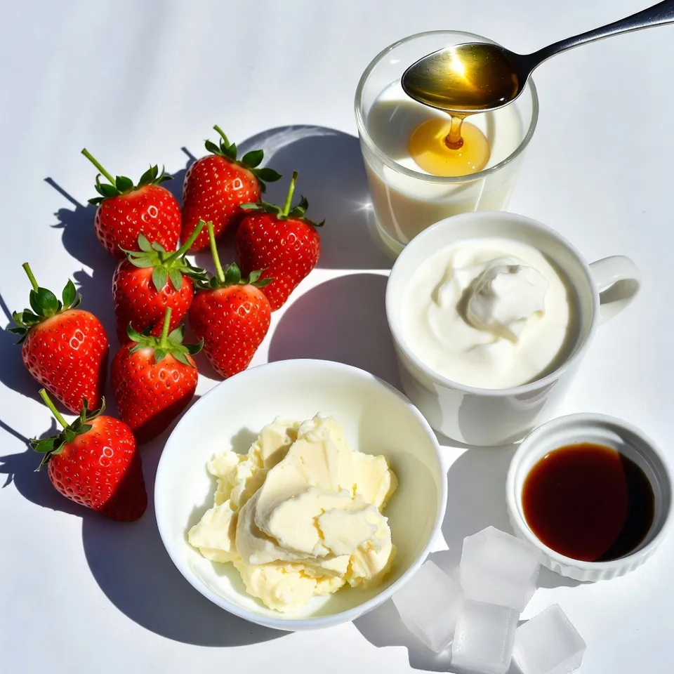 First, gather your ingredients. You will need fresh strawberries, cream cheese, Greek yogurt, milk, honey, vanilla extract, graham cracker crumbs, and ice cubes. Start by hulling and halving the strawberries. This helps them blend easily. Make sure the cream cheese is softened. This makes mixing smooth and easy.