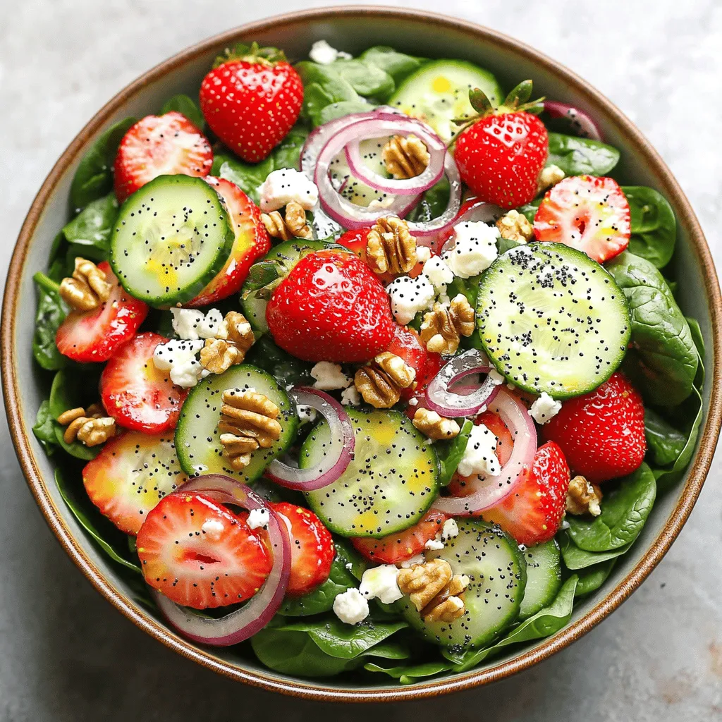 To make this salad shine, you need fresh baby spinach. It serves as a great base. Strawberries add juicy sweetness and a pop of color. Cucumber gives the salad a nice crunch. Thinly sliced red onion brings a sharpness that balances the sweetness. The feta cheese adds a creamy texture and salty flavor. For a nutty crunch, use walnuts or pecans. This mix of ingredients makes the salad tasty and exciting.
