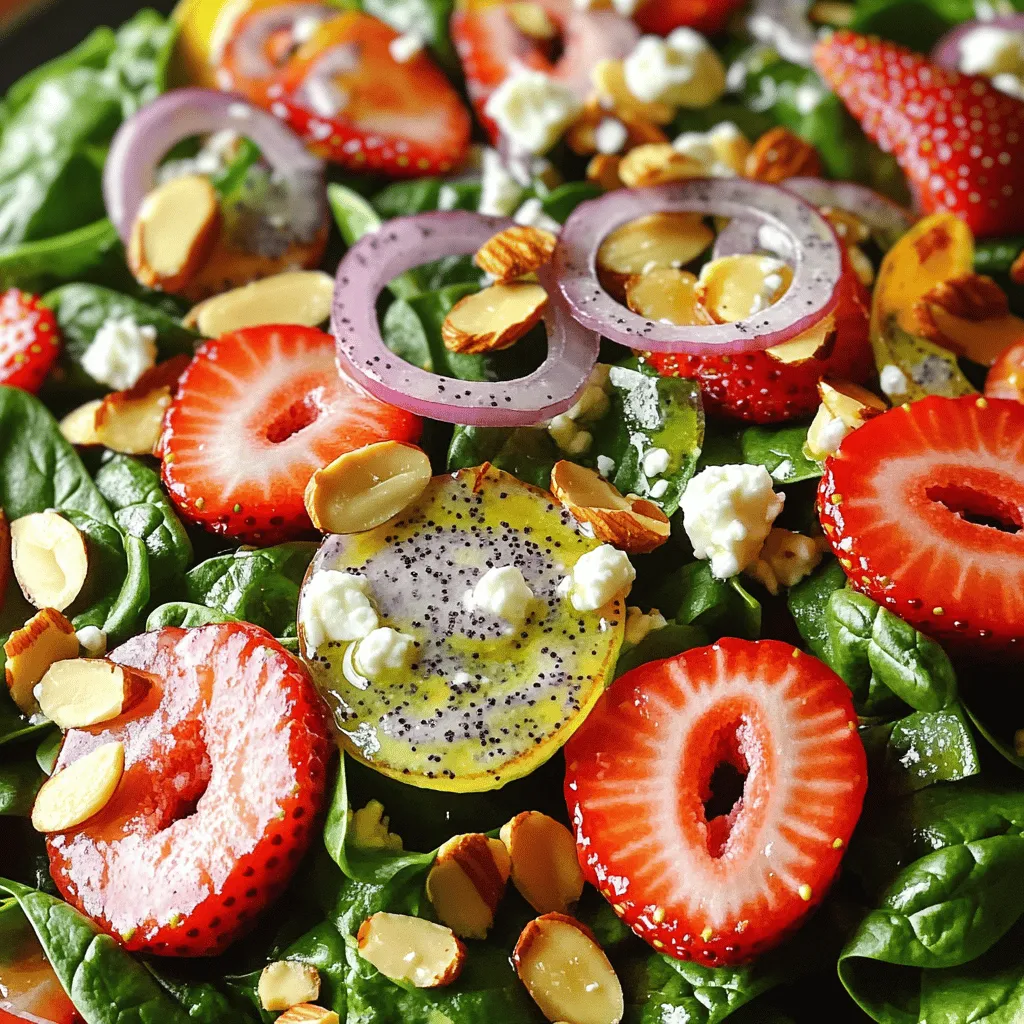 ![- 4 cups fresh spinach - 1 cup fresh strawberries - 1/2 cup sliced almonds - 1/4 cup red onion - 1/2 cup feta cheese - 1/4 cup poppyseed dressing For a great salad, start with fresh, quality ingredients. Fresh spinach should be bright and crisp. Look for strawberries that are firm and red, with no soft spots. You want almonds that are sliced and toasted for added crunch. The red onion should be thinly sliced for a mild bite. Feta cheese adds creaminess and a tangy flavor. Lastly, the poppyseed dressing ties everything together with a sweet and tangy note. Each serving contains about: - Calories: 210 - Fat: 14g - Carbs: 18g - Protein: 6g This salad is light yet filling. It offers a balance of vitamins from the spinach and strawberries. The nuts provide healthy fats and protein. Feta adds calcium and flavor. Overall, it’s a nutritious option for any meal. When picking strawberries, choose those that smell sweet. They should feel firm but not hard. Avoid berries with bruises or mold. For spinach, look for vibrant green leaves. Leaves should not be wilted or yellowed. Always wash your produce right before using it. This keeps them fresh and removes any dirt or pesticides. This salad is quick to make and perfect for any meal. You can prep it in just 10 minutes. Gather your ingredients before you start. This will help everything go smoothly. 1. Start with the Spinach: Place 4 cups of fresh spinach in a large salad bowl. This is your base. 2. Add Strawberries: Layer 1 cup of sliced strawberries evenly over the spinach. Spread them out so each bite has some sweetness. 3. Top with Almonds and Onion: Sprinkle 1/2 cup of toasted sliced almonds and 1/4 cup of thinly sliced red onion on top. This adds crunch and flavor. 4. Feta Cheese Time: Crumble 1/2 cup of feta cheese over the salad. This gives it a creamy touch that contrasts nicely with the other flavors. 5. Dress the Salad: Pour 1/4 cup of poppyseed dressing over the salad. 6. Toss Gently: Use two large spoons to toss the salad. Make sure the dressing coats all the ingredients evenly. This step is key to flavor. 7. Let It Rest: Allow the salad to sit for about 5 minutes. This helps the flavors mix before serving. - Image 1: Show the fresh spinach in the bowl. - Image 2: Capture the strawberries being layered. - Image 3: Display the almonds and onions sprinkled on top. - Image 4: Highlight the crumbled feta cheese. - Image 5: Illustrate the dressing being drizzled. - Image 6: Feature the tossed salad ready to serve. These images will guide you through each step. For the complete recipe, check out the Full Recipe link. Enjoy the process! This salad pairs well with grilled chicken or fish. You can serve it as a light lunch or side dish. A crispy baguette makes a great companion. For a more filling meal, add quinoa or farro. You can also enjoy it with a chilled glass of white wine. To boost flavors, consider adding other fruits. Blueberries or raspberries can add sweetness. You might also try sliced peaches or mango. Nuts like walnuts or pecans give crunch. For a bit of spice, sprinkle in some pepper flakes. Fresh herbs like mint or basil can brighten the dish. Making your own poppyseed dressing is easy. Combine oil, vinegar, honey, and poppy seeds. Store-bought dressings work too, but watch for added sugars. If you want a lighter version, try yogurt-based dressings. You can also swap the dressing for a balsamic glaze for a twist. Check the taste and adjust the balance. For the complete preparation steps, check out the Full Recipe. {{image_2}} If you want to switch things up, consider these easy swaps. You can replace feta cheese with goat cheese or a vegan cheese. Both add a nice creamy texture. For nuts, sliced almonds are great, but walnuts or pecans work too. They give a different crunch and flavor. You can adapt this salad for every season. In spring, add fresh peas for a pop of green. Summer is perfect for adding blueberries or raspberries. Fall calls for sliced apples or pears, which add sweetness. In winter, try roasted butternut squash for a warm touch. Making this salad fit your diet is simple. For a vegan option, skip the cheese and use a plant-based dressing. To make it gluten-free, ensure your dressing has no gluten. For a low-calorie option, use less dressing or swap in a light vinaigrette. These changes keep the salad fresh and tasty. For the full recipe, check the [Full Recipe]. To keep leftovers fresh, store the salad in an airtight container. Make sure to separate the dressing from the salad. This keeps the spinach and strawberries crisp. If you mix in the dressing, the salad may become soggy. Store it in the fridge and eat within two days for the best taste. You can prep ingredients ahead of time. Wash and dry the spinach a day before. Slice the strawberries and store them in a sealed container. Toast the almonds and keep them in a cool place. You can mix the ingredients just before serving. This helps keep everything fresh and crunchy. Can you freeze parts of the salad? Freezing is not a good idea for this salad. Spinach and strawberries do not freeze well. They become mushy when thawed. You can freeze the poppyseed dressing if you want. Just store it in a freezer-safe container. Use it within three months for the best flavor. To make this salad vegan, replace the feta cheese with avocado. You can also use a vegan poppyseed dressing. Look for dressings that do not contain dairy or eggs. This way, you keep the salad fresh and tasty while making it plant-based. To keep the salad fresh, store it in an airtight container. Place a paper towel inside to absorb extra moisture. This helps prevent wilting and sogginess. Avoid adding dressing until you are ready to eat. This keeps the greens crisp and vibrant. You can prep the salad in advance, but with care. Wash and dry the spinach, then store it separately. Slice the strawberries and keep them in a sealed bag. You can mix the dry ingredients, like nuts and onions, ahead of time. Ad