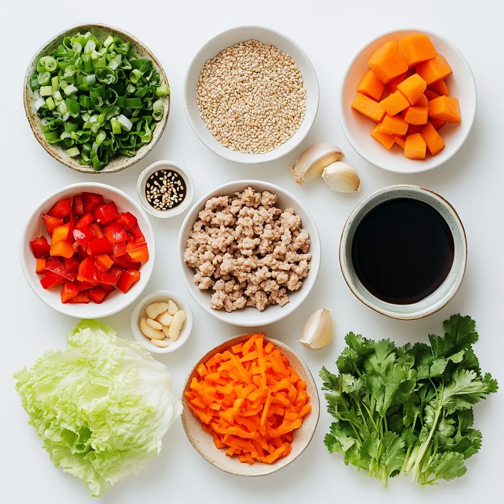 When choosing fresh ingredients, look for bright colors and firm textures. The ground chicken should be pink and moist, with no gray areas. Pick a red bell pepper that feels heavy for its size. It should have smooth skin and no blemishes. The carrot should be crisp and free from soft spots. For lettuce, choose leaves that are vibrant and crisp. Avoid any wilted or brown edges. Fresh ginger should feel firm and have a strong aroma. Garlic cloves need to be plump and unblemished.