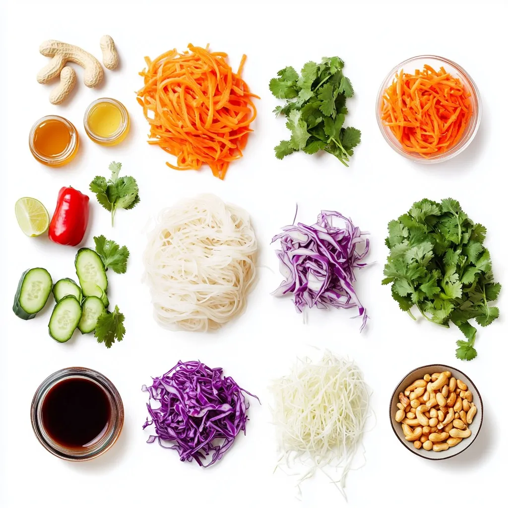 - In a large mixing bowl, combine the cooked rice noodles, shredded carrots, sliced red bell pepper, julienned cucumber, shredded red cabbage, chopped green onions, and cilantro leaves.