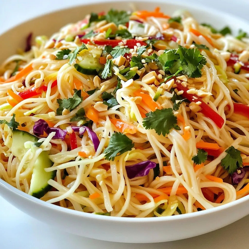 In a large mixing bowl, combine the cooked rice noodles with the veggies. Add 1 cup of shredded carrots, 1 thinly sliced red bell pepper, 1 cup of julienned cucumber, and 1 cup of shredded red cabbage. Toss in 1/2 cup of chopped green onions and 1/4 cup of chopped cilantro leaves. Pour the peanut sauce over this colorful mix. Toss everything gently to coat well. Chill the salad in the fridge for about 15 to 20 minutes. This helps the flavors mix together. Before serving, sprinkle 1/2 cup of chopped peanuts on top for a nice crunch. Toss it gently again, and enjoy your fresh, flavorful meal!