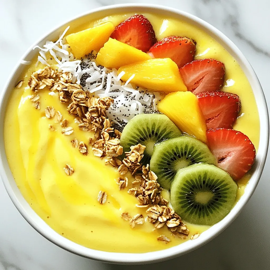 - 1 cup frozen pineapple chunks - 1 ripe banana, sliced - 1/2 cup coconut milk (or almond milk) - 1/2 cup Greek yogurt (or dairy-free yogurt) - 1 tablespoon honey or agave syrup (optional) The main ingredients for this smoothie bowl create a tropical delight. I love using frozen pineapple chunks because they add a chill and creamy texture. Ripe bananas bring sweetness and creaminess to the mix. You can choose coconut milk for a rich flavor or almond milk for a lighter touch. Greek yogurt adds protein and thickness, while honey or agave syrup can enhance sweetness if you like. - Sliced fresh fruits (kiwi, strawberries, mango) - Granola - Shredded coconut - Chia seeds Toppings make this smoothie bowl fun and pretty. I enjoy adding sliced fresh fruits like kiwi, strawberries, and mango for color and taste. Granola gives a nice crunch, while shredded coconut adds a tropical flair. Chia seeds offer extra nutrition and texture. You can mix and match toppings based on your preferences or what you have at home. Enjoy the process of creating your perfect bowl! {{ingredient_image_1}} Start by gathering your ingredients. You will need frozen pineapple, banana, coconut milk, and yogurt. In a blender, combine 1 cup of frozen pineapple chunks, one sliced ripe banana, 1/2 cup of coconut milk, and 1/2 cup of Greek yogurt. If you want a touch of sweetness, add 1 tablespoon of honey or agave syrup. Blend everything until smooth and creamy. If the mixture is too thick for your liking, simply add a little more coconut milk until you achieve your desired texture. Once your smoothie is blended, pour the mixture into a chilled bowl. The chill helps keep your smoothie fresh and cool. Next, it's time to add some color! Slice fresh fruits like kiwi, strawberries, or mango, and arrange them on top of your smoothie mixture in a fun and attractive way. This step not only makes your bowl look great but also adds different flavors and nutrients. Now comes the fun part: garnishing! Sprinkle some granola over the top for a crunchy bite. Add shredded coconut for a tropical twist and sprinkle chia seeds for extra nutrition. These toppings not only enhance the look of your bowl but also boost its texture and flavor. Enjoy your beautiful and delicious Tropical Pineapple Smoothie Bowl right away! To make a thick smoothie bowl, use coconut milk. Start with half a cup. If the mixture is too thick, add more coconut milk. Blend until smooth and creamy. For a great texture, blend at high speed. Stop to scrape down the sides. This helps mix all the ingredients well. Pick ripe bananas for the best flavor. A ripe banana feels soft and has brown spots. For fresh berries, choose ones that are firm and colorful. You can also swap tropical fruits. Try using mango or papaya if you want a twist. They add sweetness and flavor too. If you like it sweeter, add honey or agave syrup. Start with one tablespoon. Blend it in and taste. You can always add more if needed. This way, you control the sweetness. It allows you to make it just the way you like! Pro Tips Fresh Fruits are Best: For the most vibrant flavors, use fresh fruits as toppings. They add a burst of color and enhance the smoothie bowl's taste. Chill Your Bowl: To keep your smoothie cold and refreshing, chill your bowl in the freezer for a few minutes before serving. Experiment with Textures: Don’t hesitate to add nuts or seeds to your toppings for extra crunch and nutrition. Almonds or walnuts work wonderfully! Make it Creamy: If you prefer a creamier texture, add a bit more Greek yogurt or avocado to the base before blending. {{image_2}} You can make this smoothie bowl even more fun with different fruits. Mango and papaya blend well with pineapple. They add sweetness and a creamy texture. If you want a change, use seasonal fruits. Try berries in summer or apples in fall. This keeps your bowl fresh and interesting. You can mix and match to find your favorite combo. If you need a dairy-free option, use almond milk and coconut yogurt. These swaps keep the bowl creamy and smooth. For a low-sugar option, skip the honey or agave syrup. You can also use a ripe banana for natural sweetness. This way, you can enjoy a tasty bowl that fits your diet. Want to add some green? Toss in spinach or kale. They blend well and boost nutrition without changing the taste. Nuts and seeds add crunch and protein. Try adding almonds, walnuts, or sunflower seeds. They make your smoothie bowl exciting and filling. To make your smoothie bowl prep easy, gather your ingredients ahead of time. You can measure out the frozen pineapple, banana, coconut milk, and yogurt in separate containers. Store them in the fridge overnight. This way, you’ll save time when you blend. Keep your toppings, like fresh fruits and granola, in airtight containers. This keeps them fresh until you’re ready to use them. If you have any smoothie bowl left after serving, store it in a sealed container. This will keep it fresh for one day. Avoid adding toppings to the leftovers. They can get soggy. When you’re ready to eat again, just pour the smoothie into a bowl. You can add fresh toppings like fruits, granola, or seeds to make it feel new. You can use almond milk or oat milk. Both options work well in this recipe. Almond milk has a light flavor. Oat milk adds creaminess. You can adjust the taste based on what you like best. To make this smoothie bowl vegan, swap Greek yogurt for dairy-free yogurt. Choose a plant-based yogurt that you enjoy. Also, use agave syrup instead of honey. This keeps the bowl tasty and plant-based. Yes, you can use fresh pineapple, but the bowl may be less icy. If you want a chilled bowl, add some ice cubes to the blender. This will help keep that cool and refreshing taste. Pineapple is rich in vitamin C and fiber. It helps digestion and boosts your immune system. Yogurt provides protein and probiotics. Probiotics support gut health and digestion. Together, they create a tasty and healthy blend. To make mor